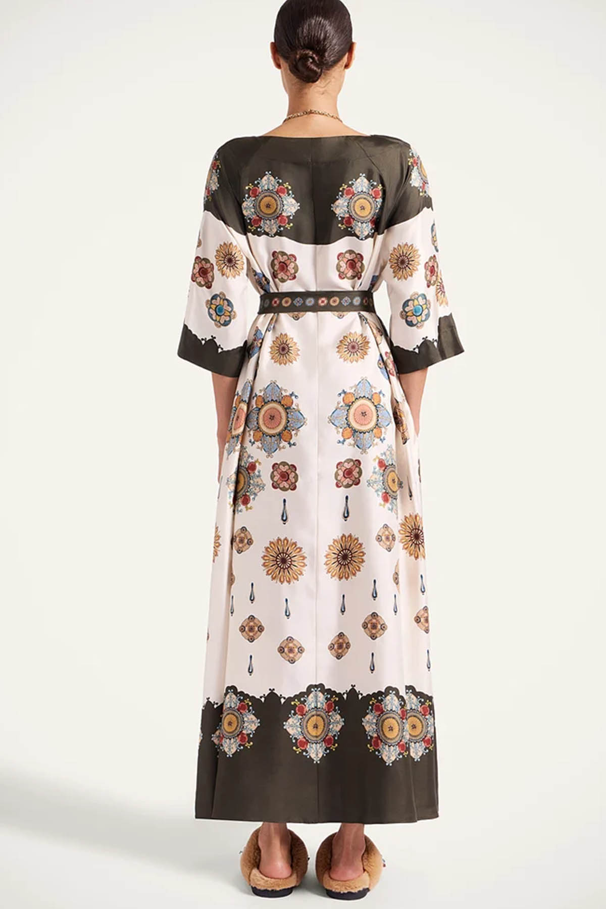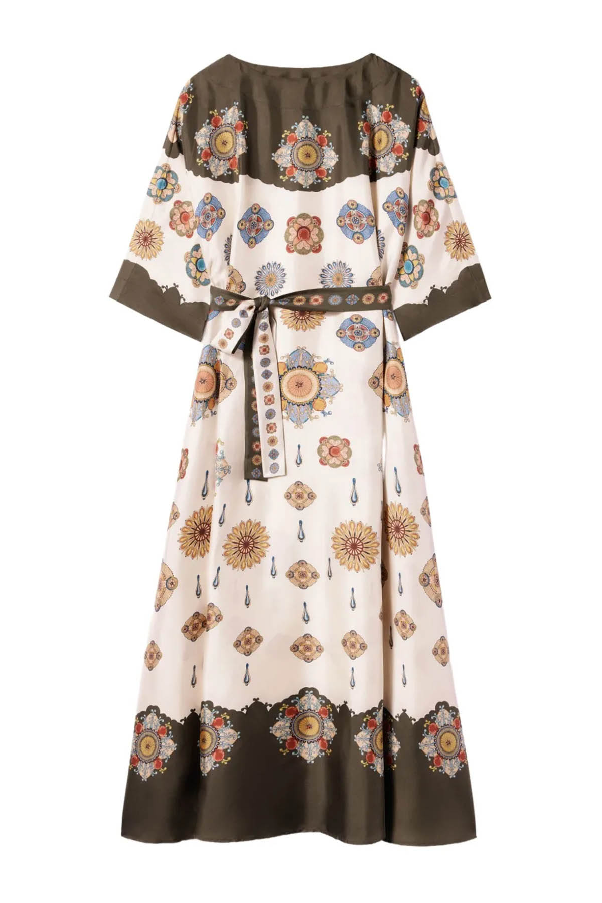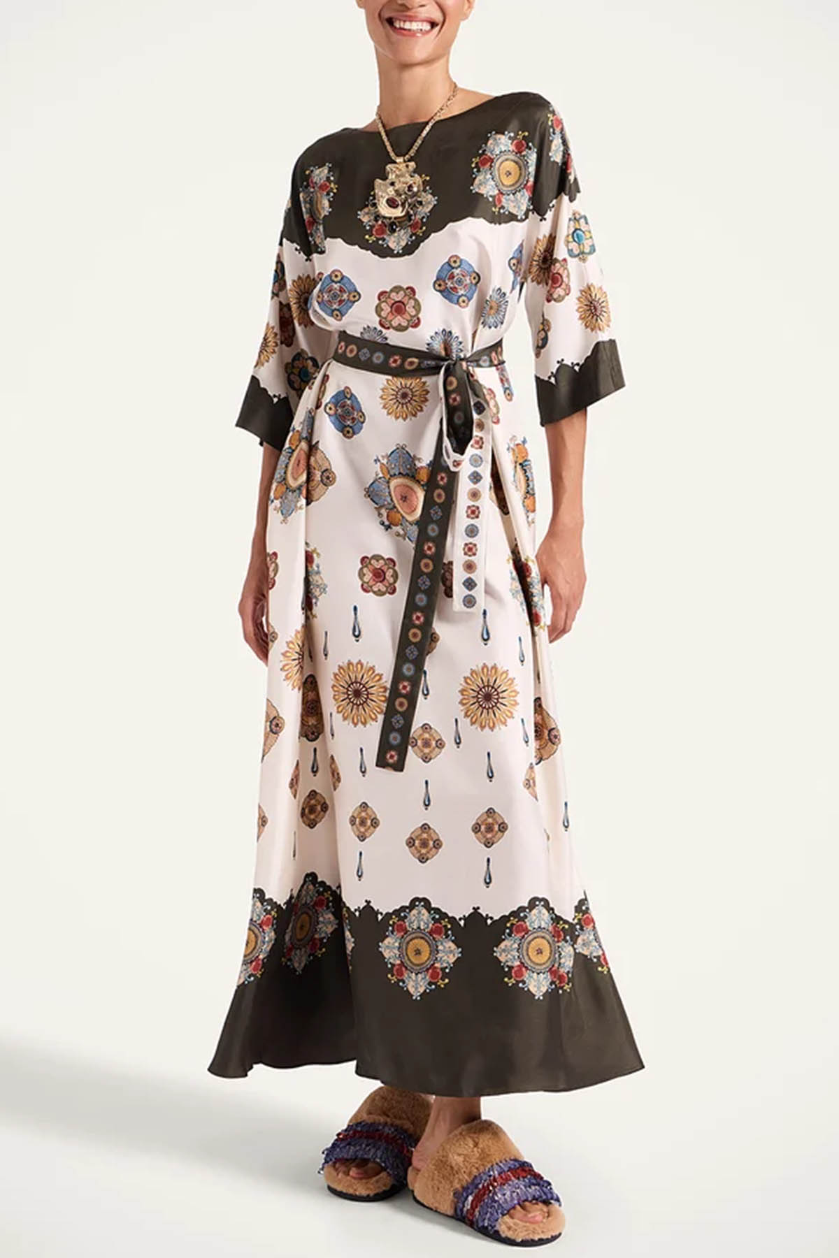 Silk twill, hand-placed print, generous fit, hidden side pockets, adjustable and removable belt, no belt loops, 3/4 sleeves.
