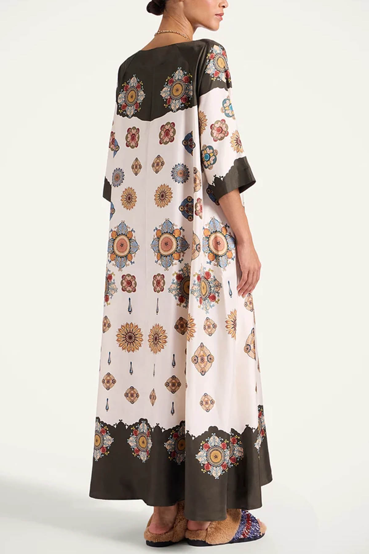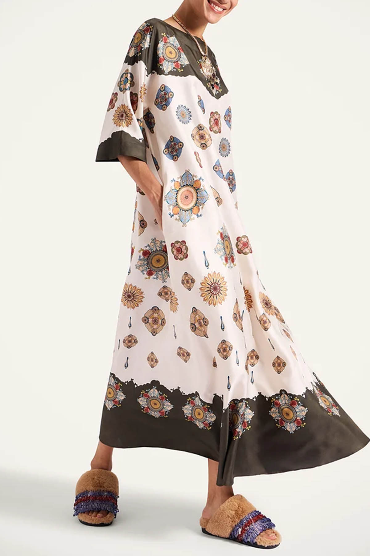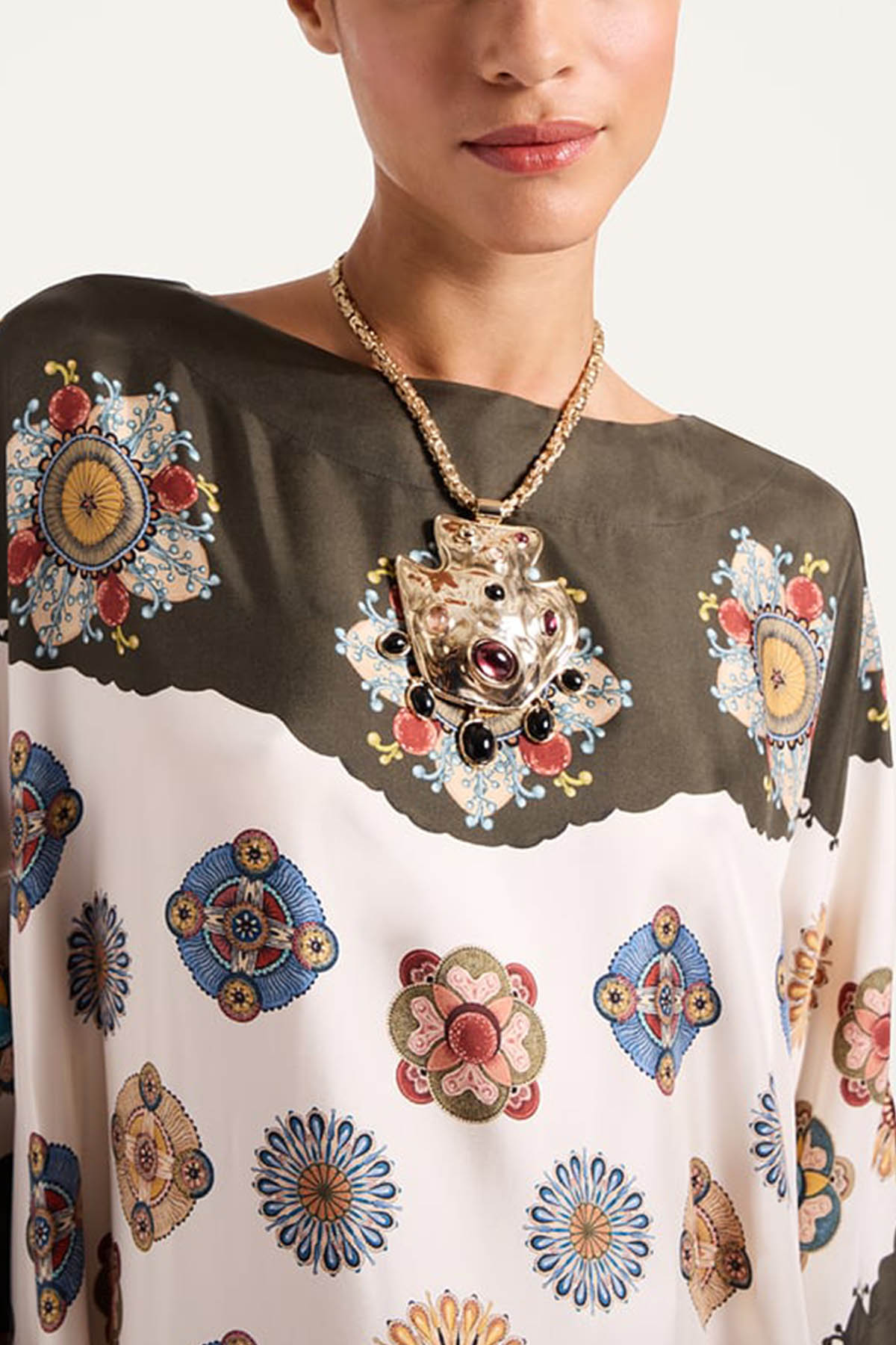 Silk twill, hand-placed print, generous fit, hidden side pockets, adjustable and removable belt, no belt loops, 3/4 sleeves.