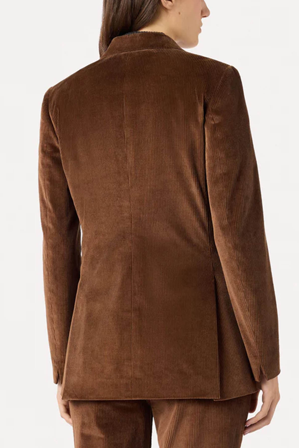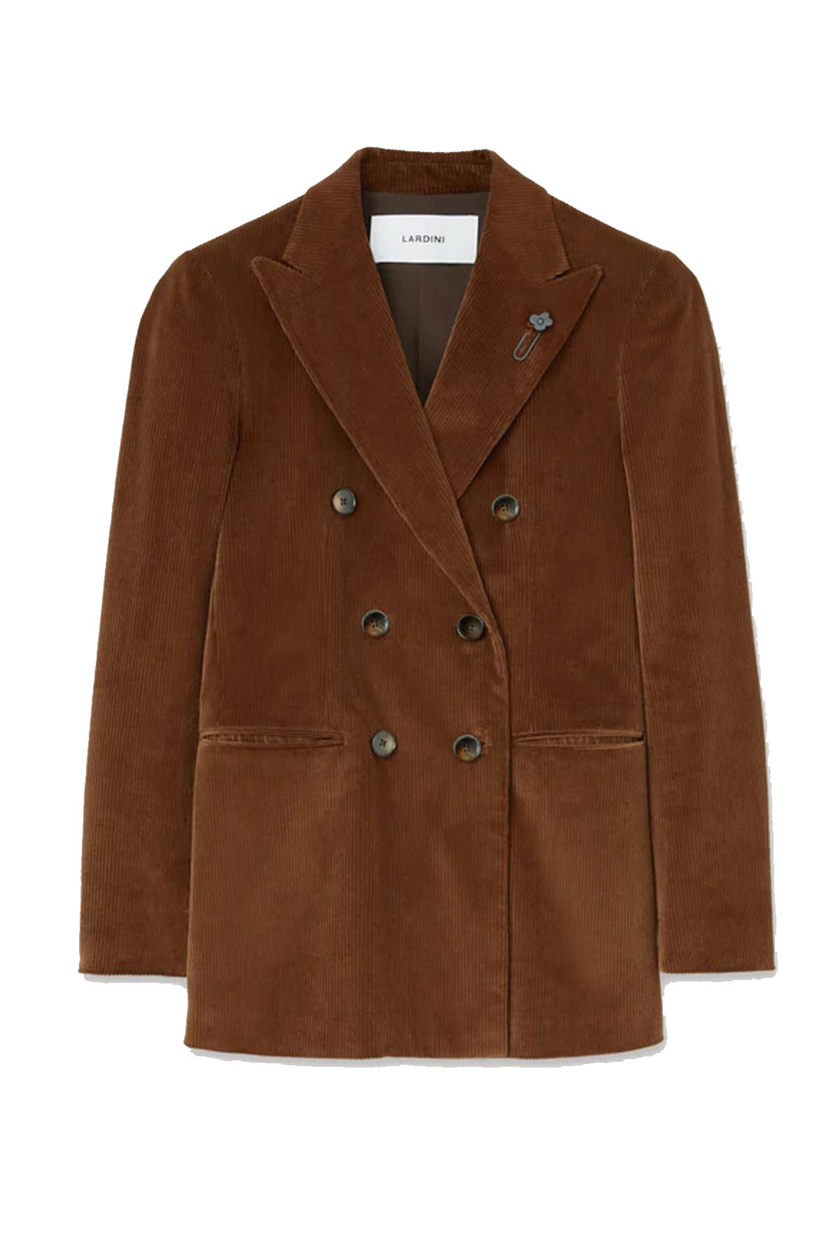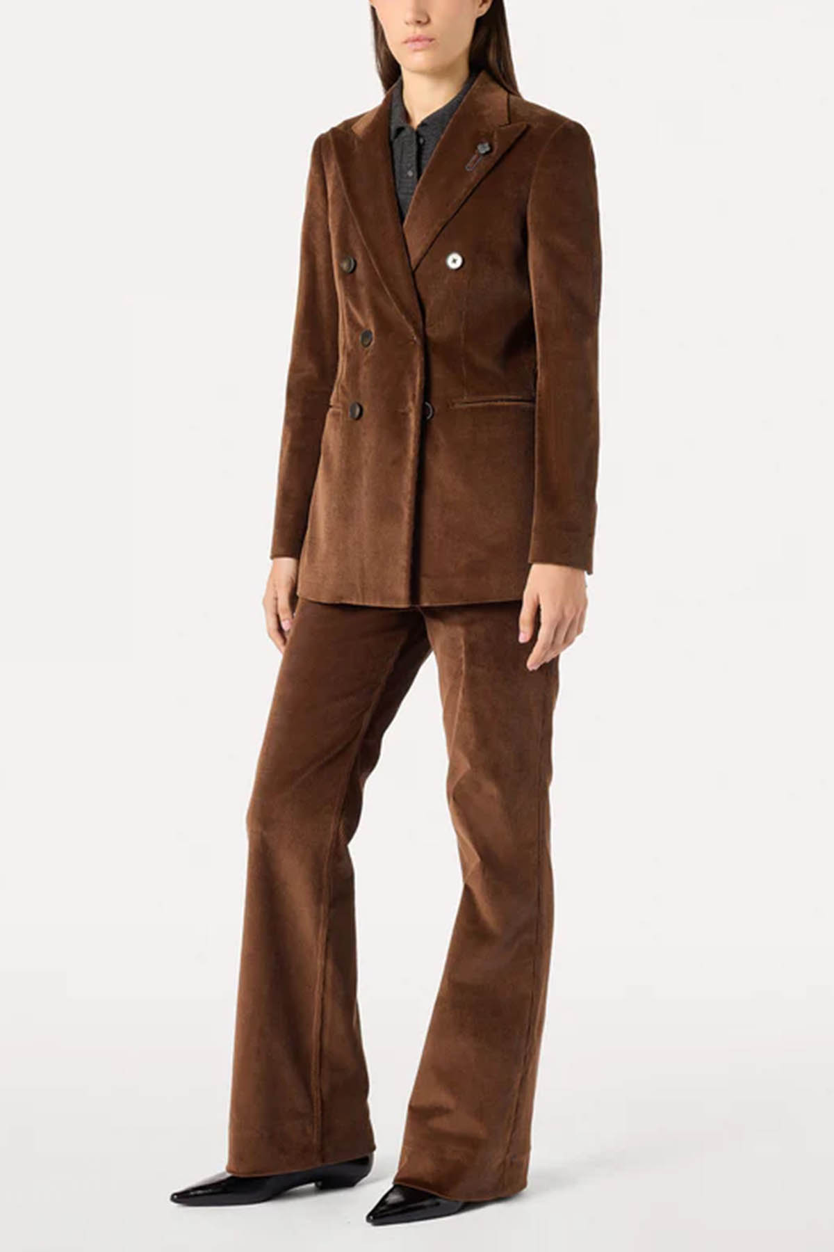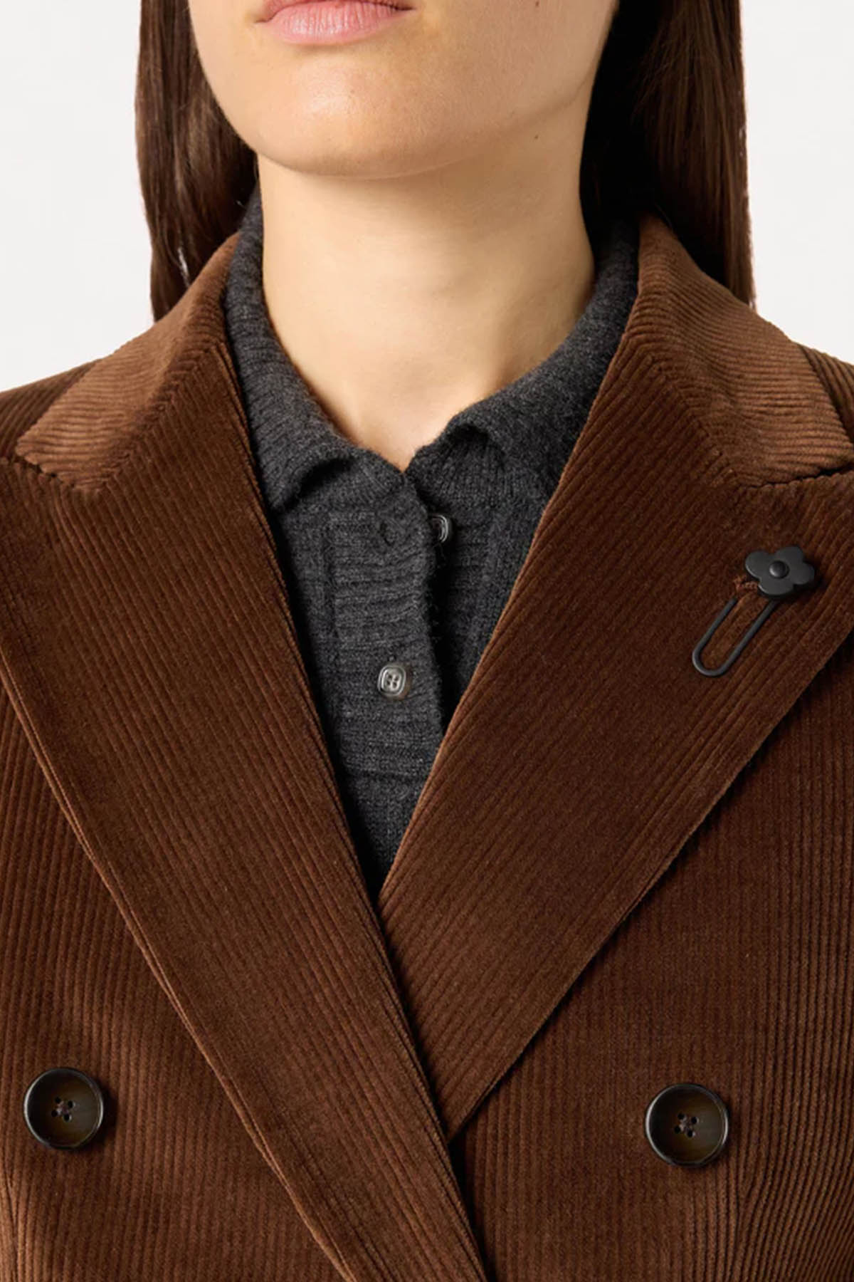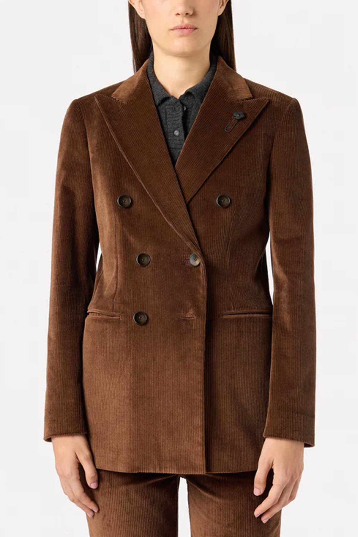 Lined, double-breasted model with six-button closure, featuring an elegant and modern peak collar, straight sleeves with a slit at the bottom, while the cuffs feature a buttonless slit, and double-welt pockets.