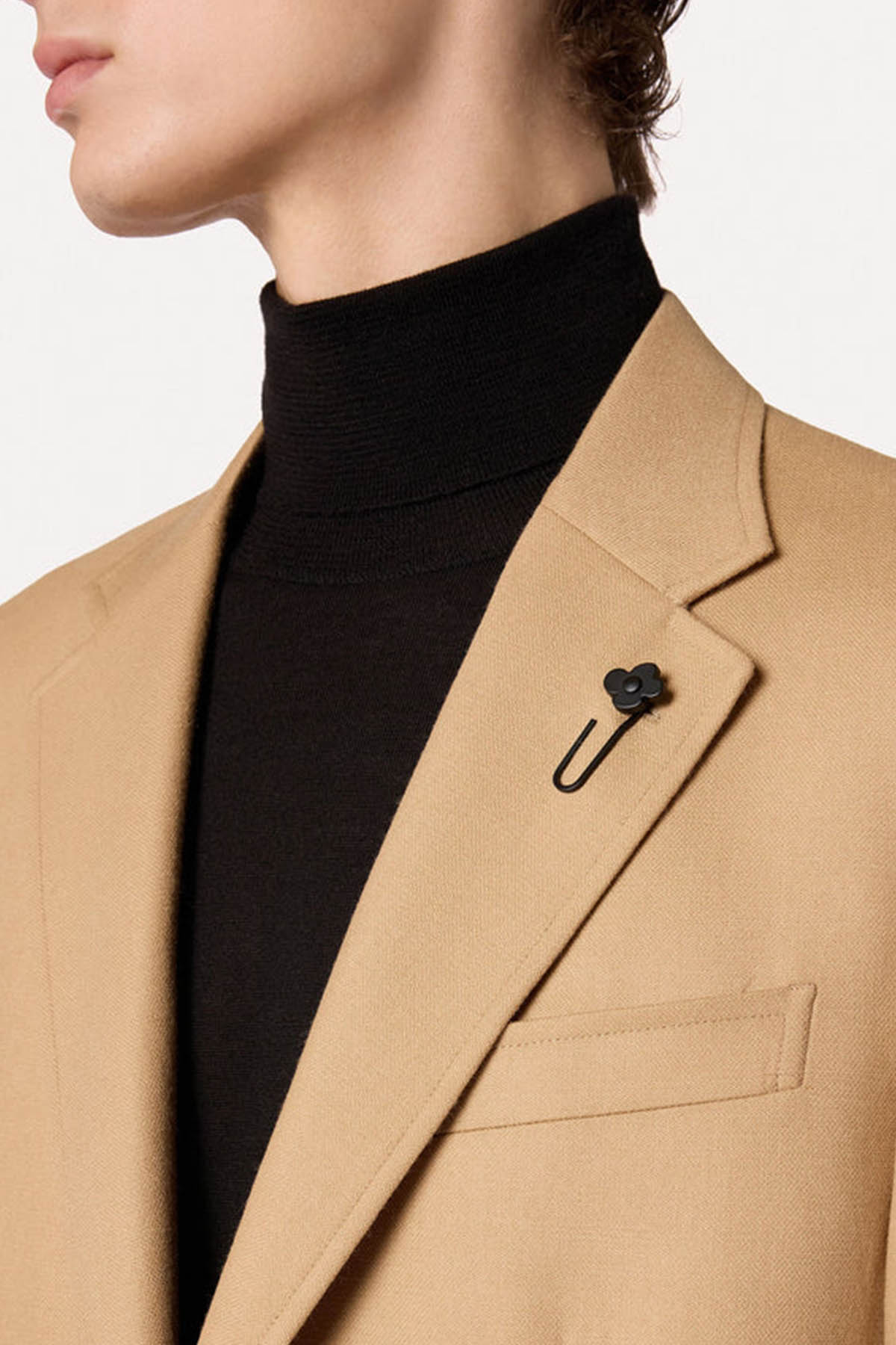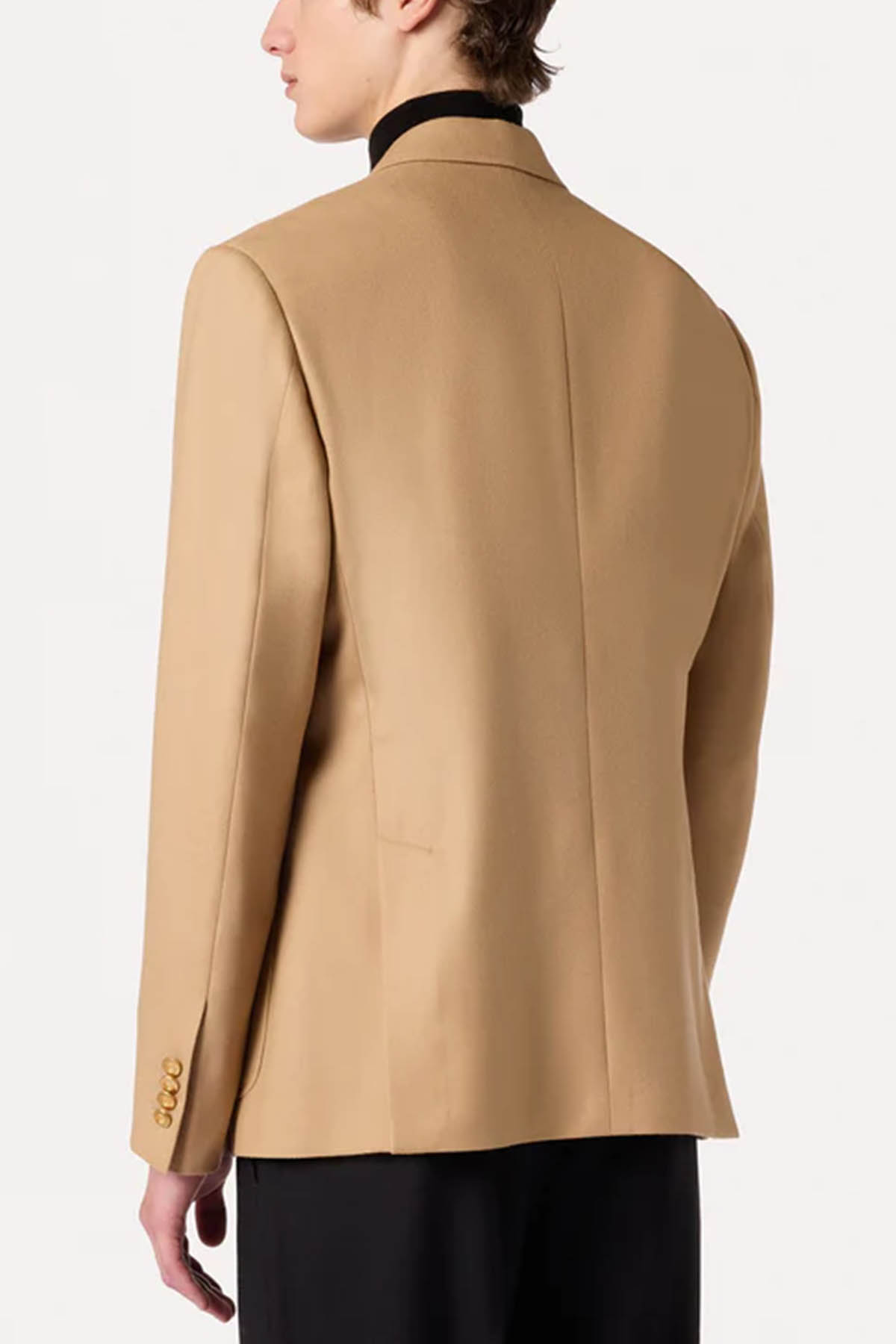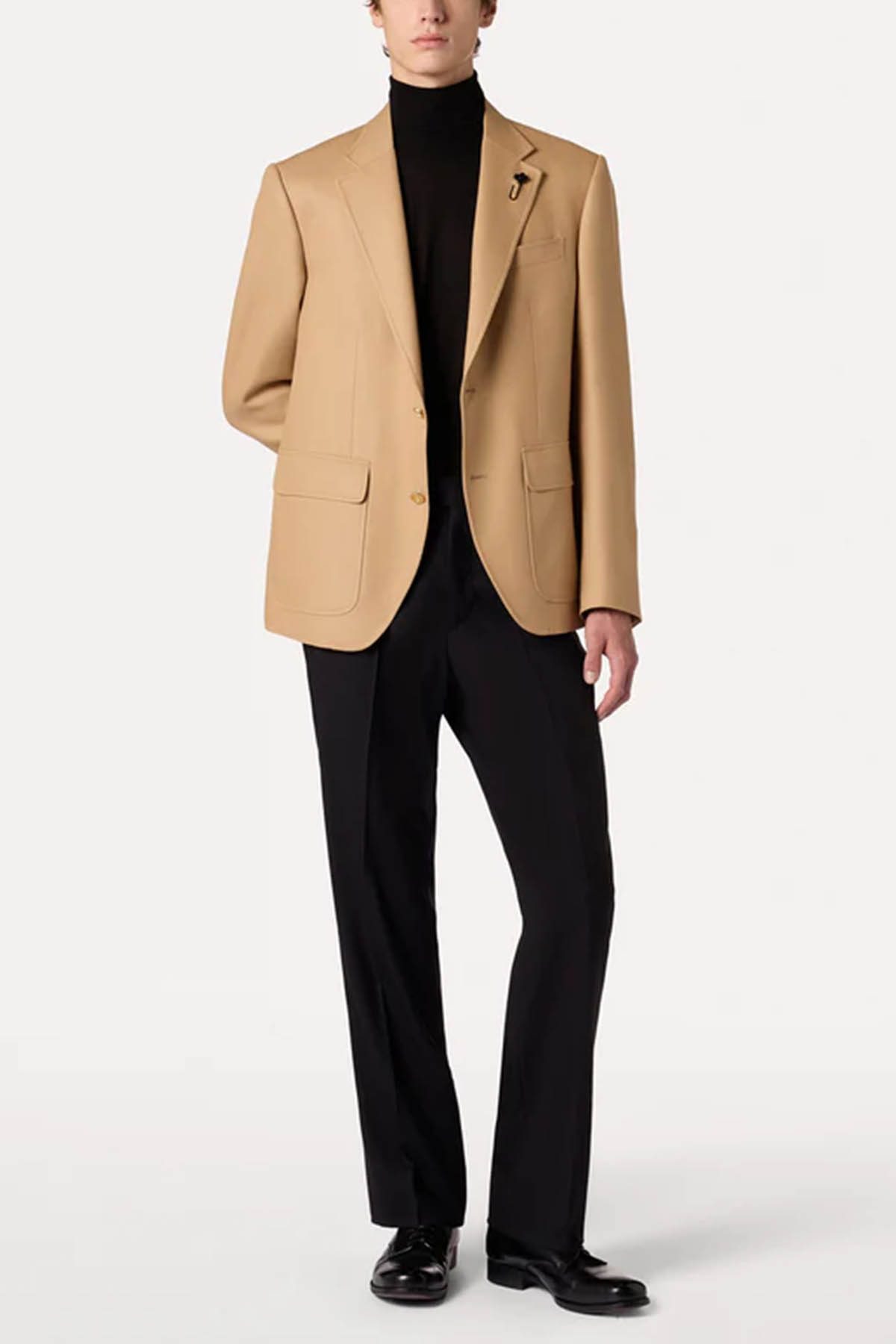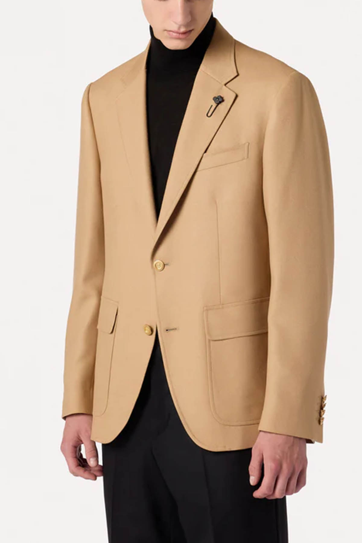Single-breasted, two-button style with notched lapels and flap patch pockets, crafted from a fine camel-toned Fulé wool blend, it features light tailored stitching, side vents, and a semi-lined construction. The cuffs are open with closed buttonholes and appliqué buttons.