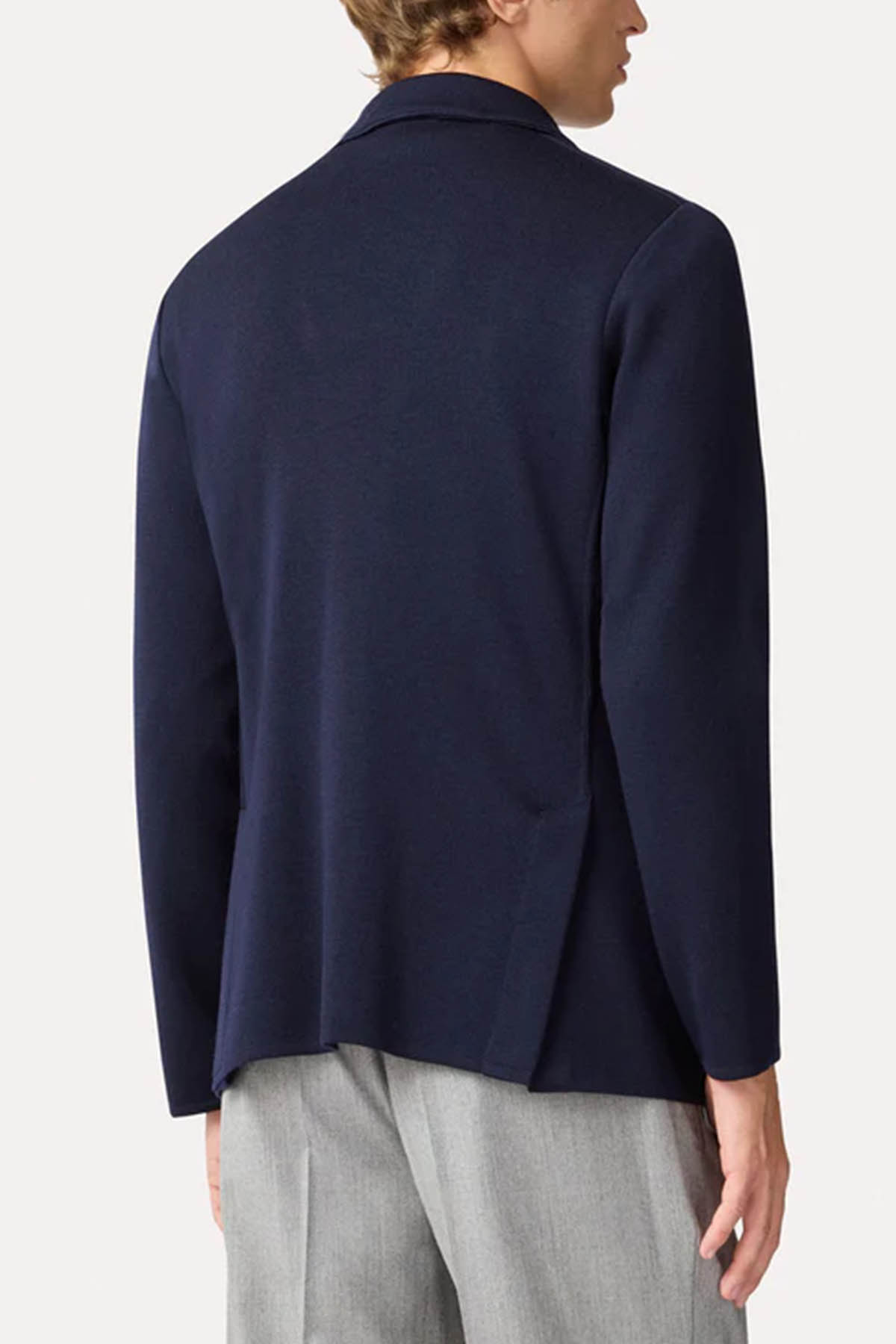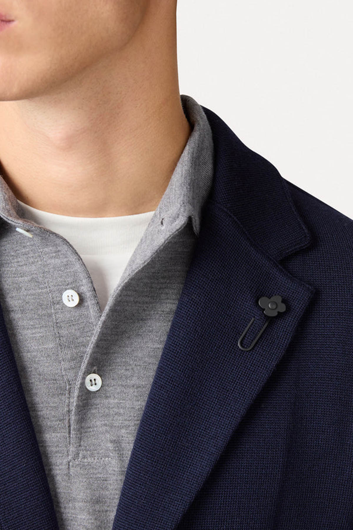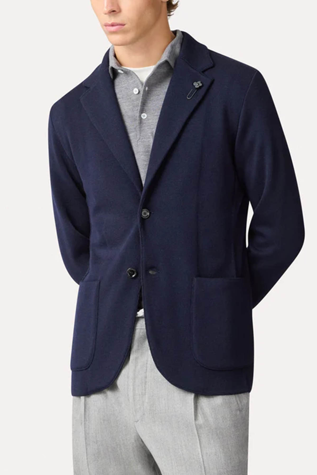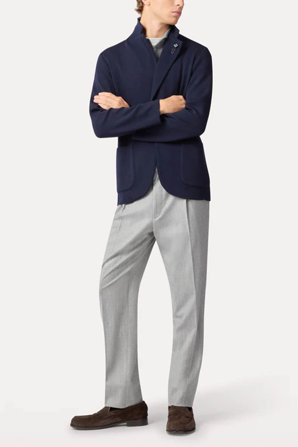 Single-breasted, two-button jacket with side panels, patch pockets, and side vents, crafted from exclusive Lardini fabric, 100% carded cashmere with an irregular ribbed finish and buttonless cuffs.