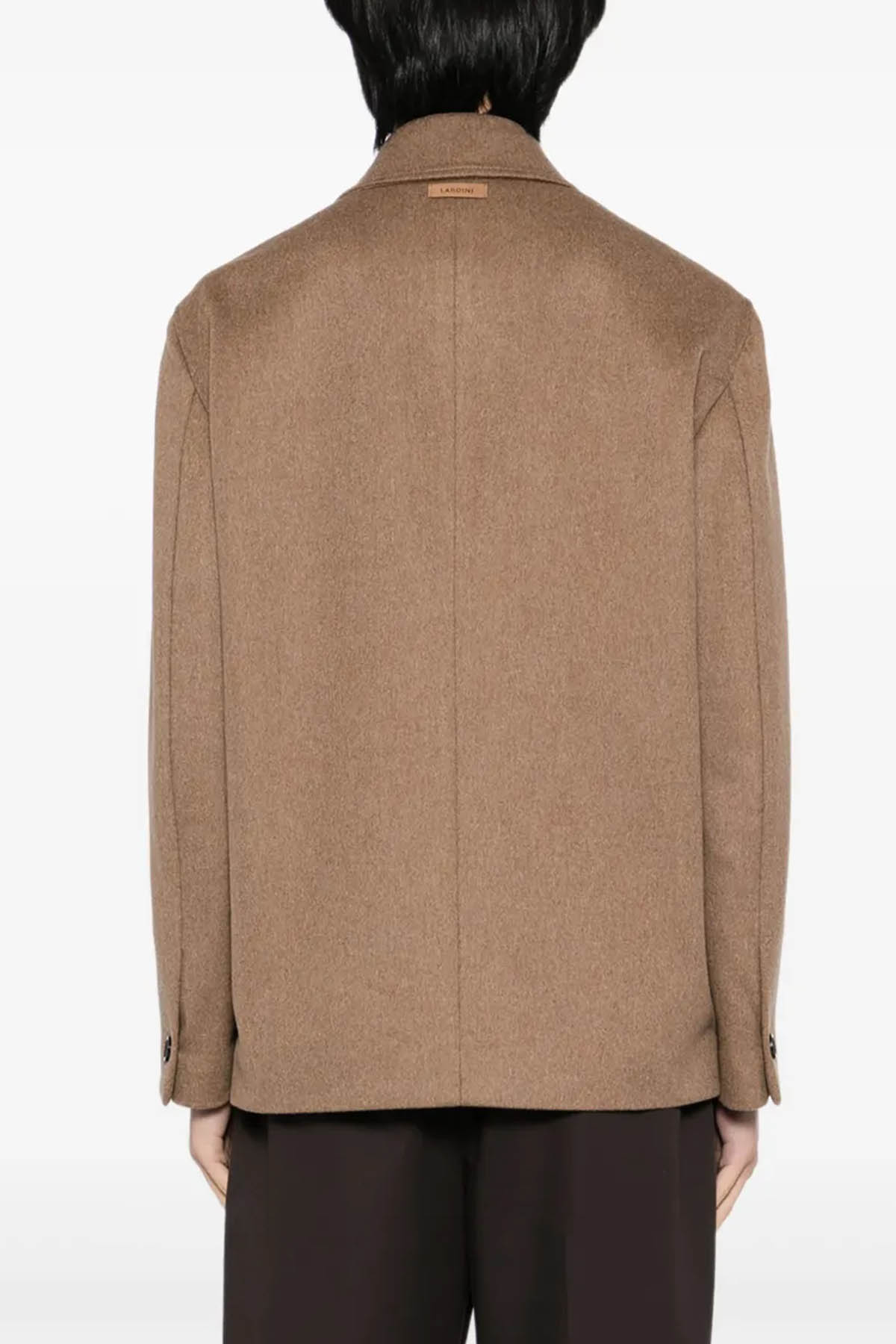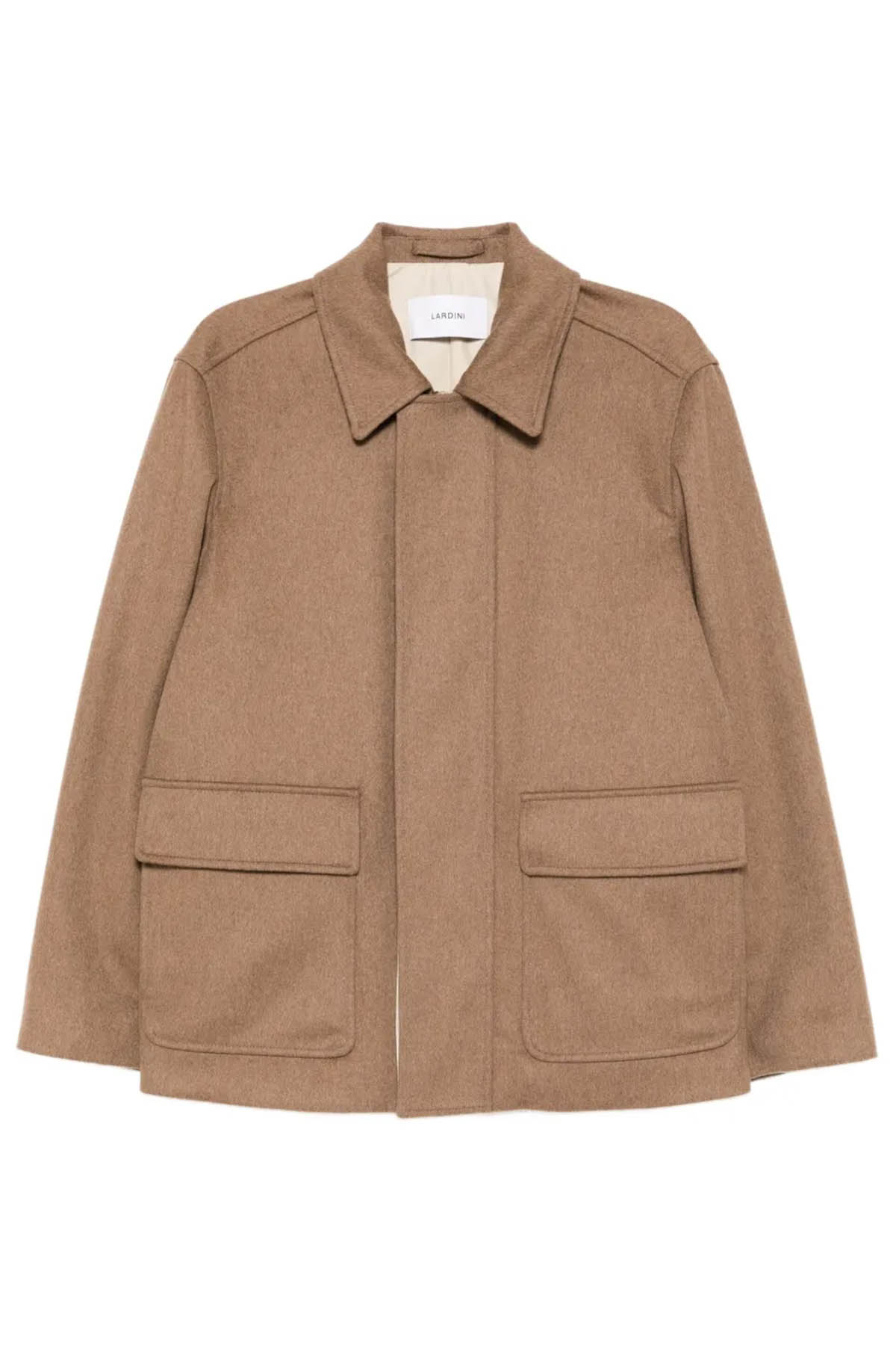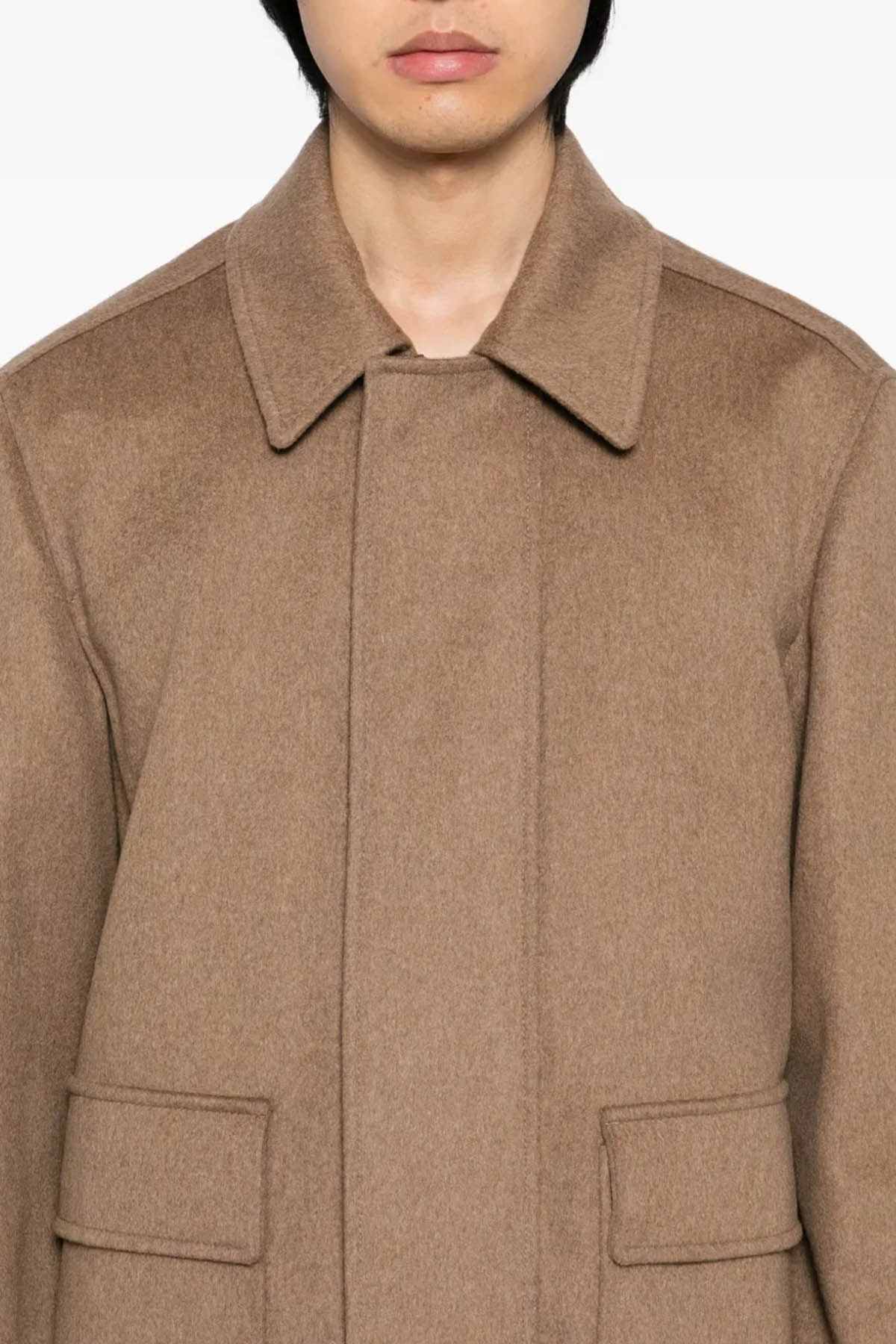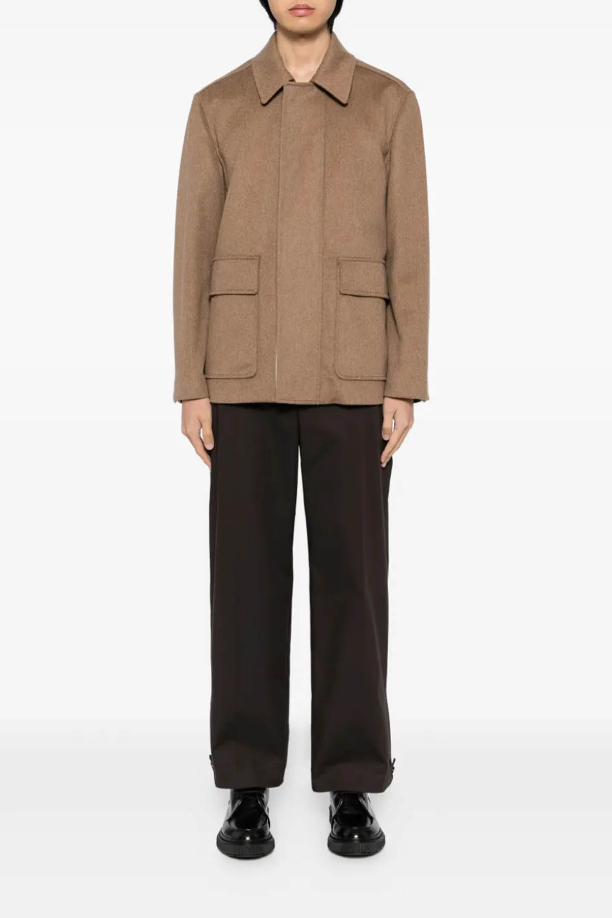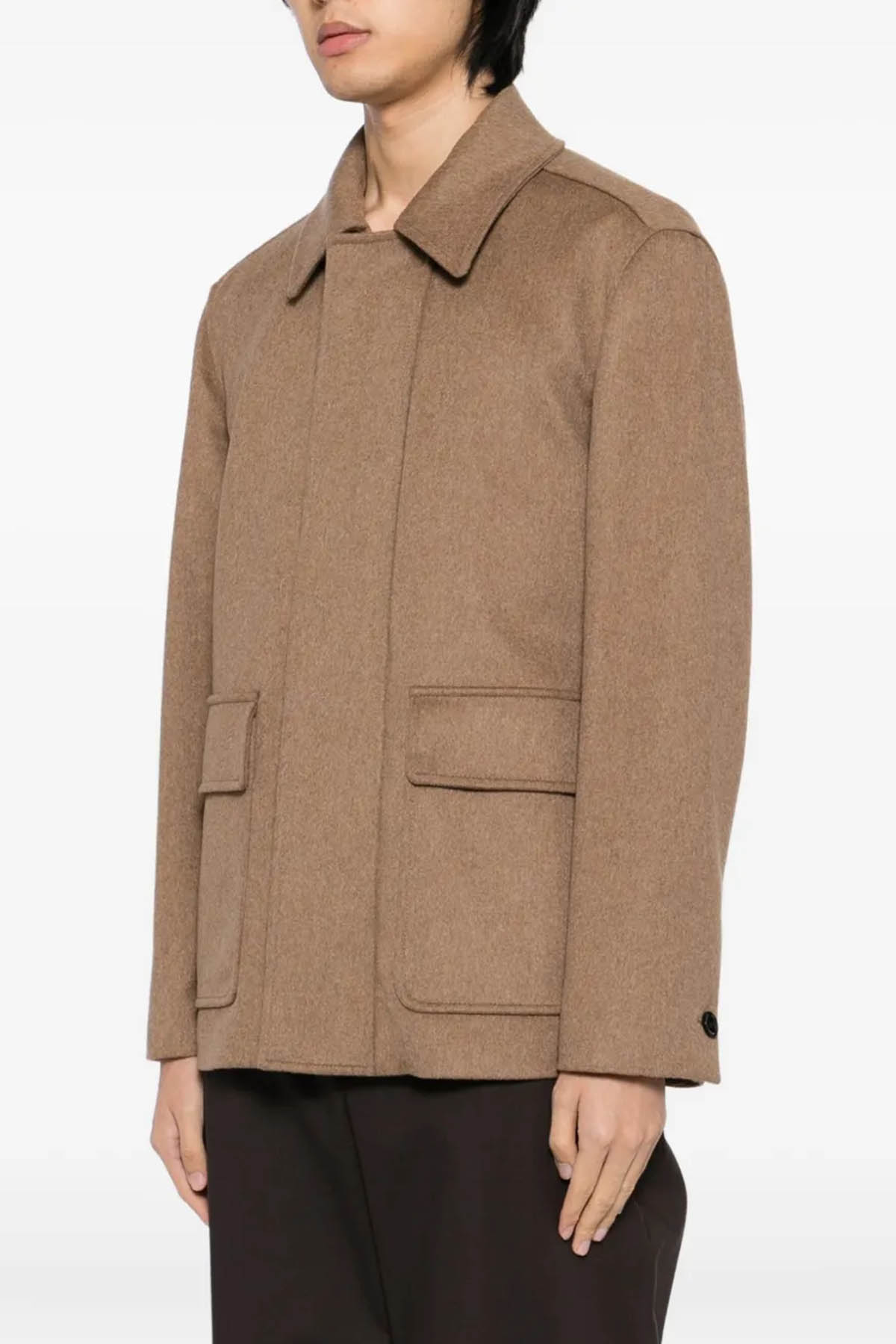 Overjacket style, single-breasted with a zip closure and concealed five-button placket, patch pockets with flaps, buttoned cuffs, and a lined interior, made from a fine beaver-effect wool fabric with a water-repellent finish.