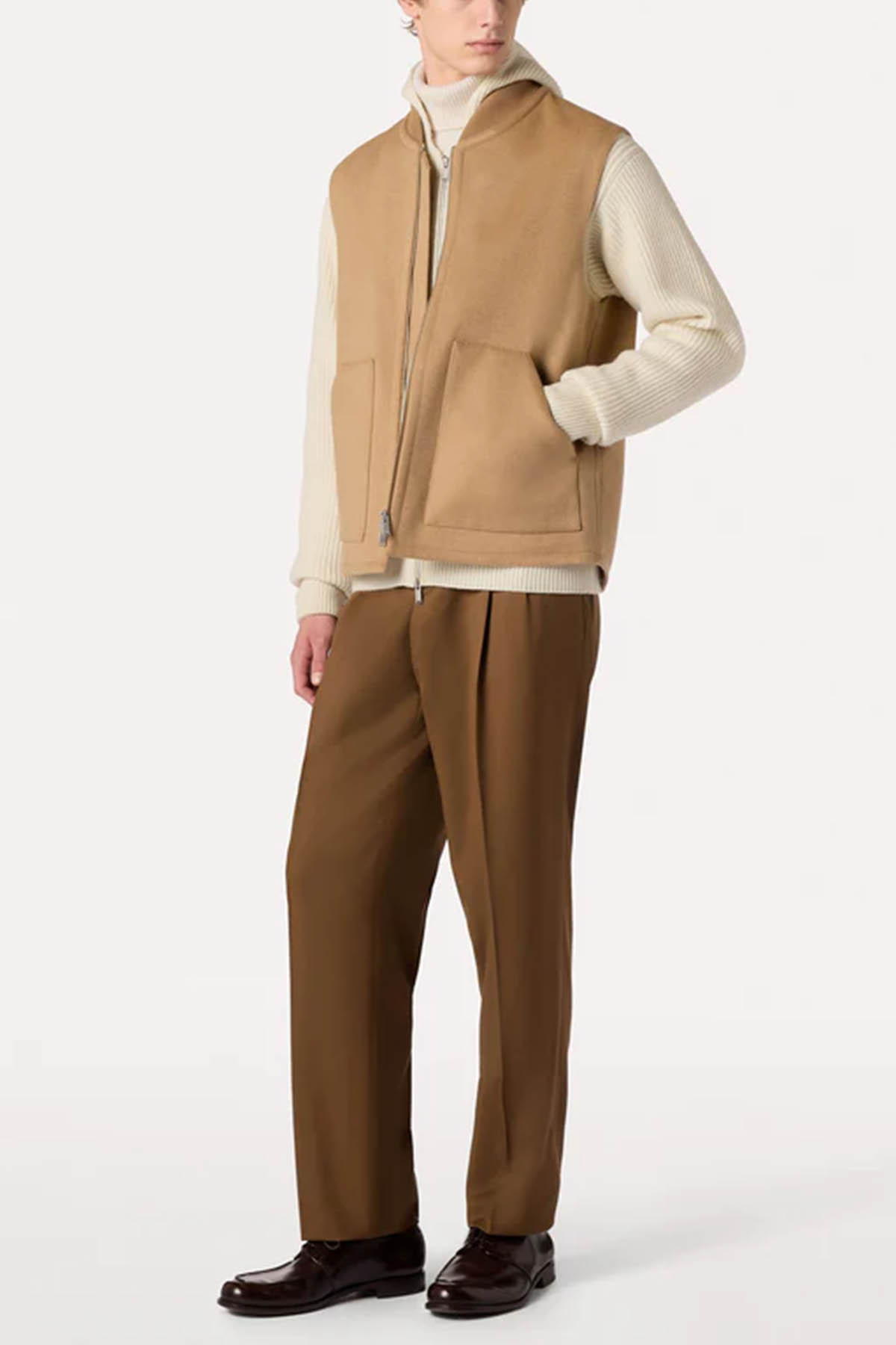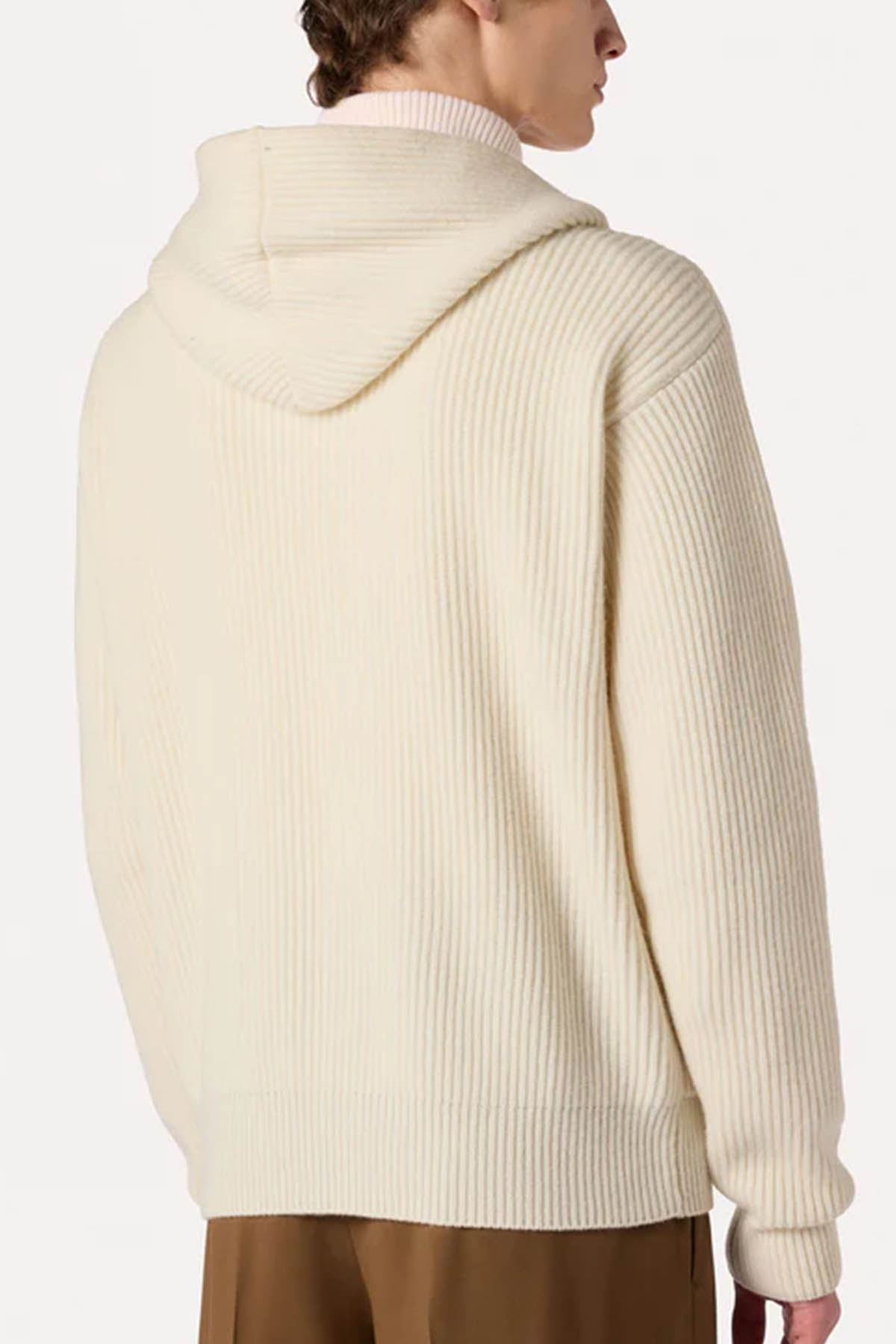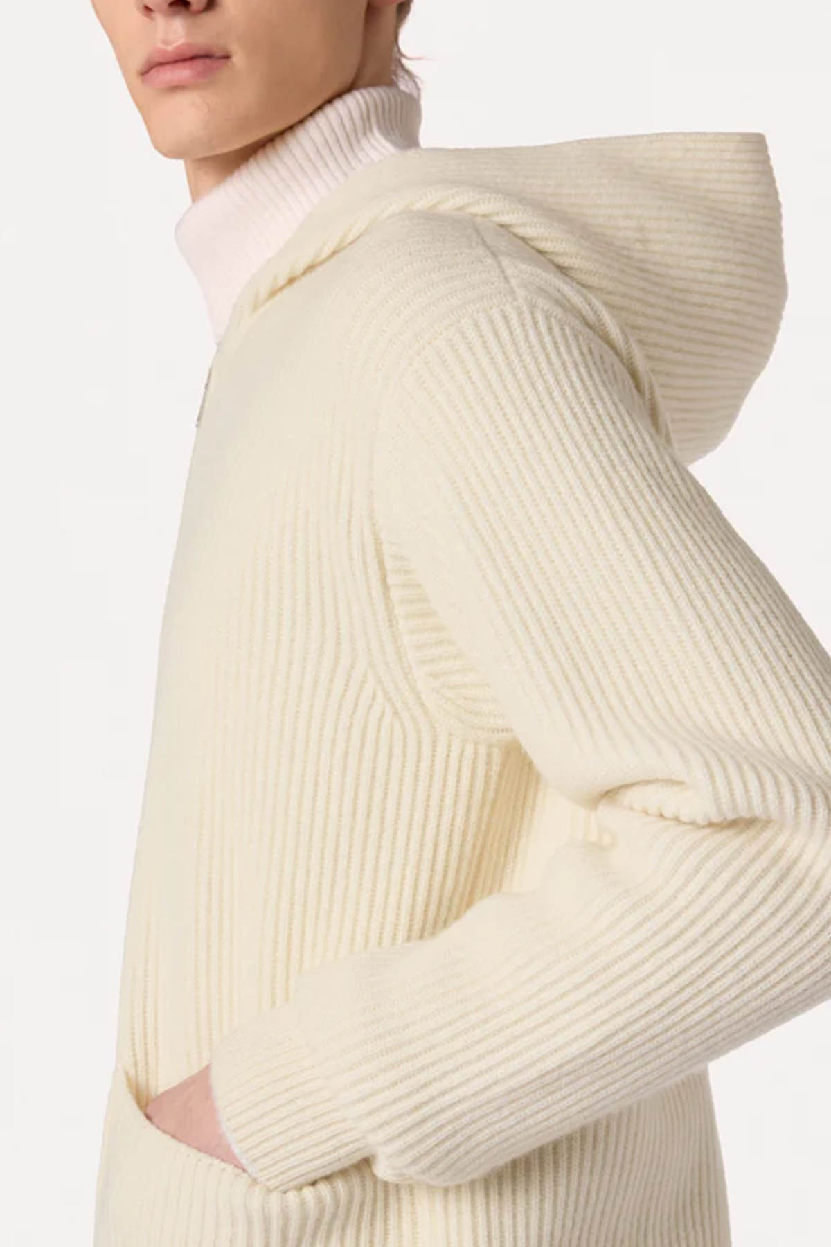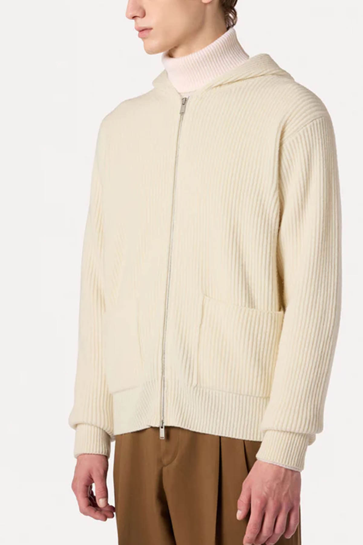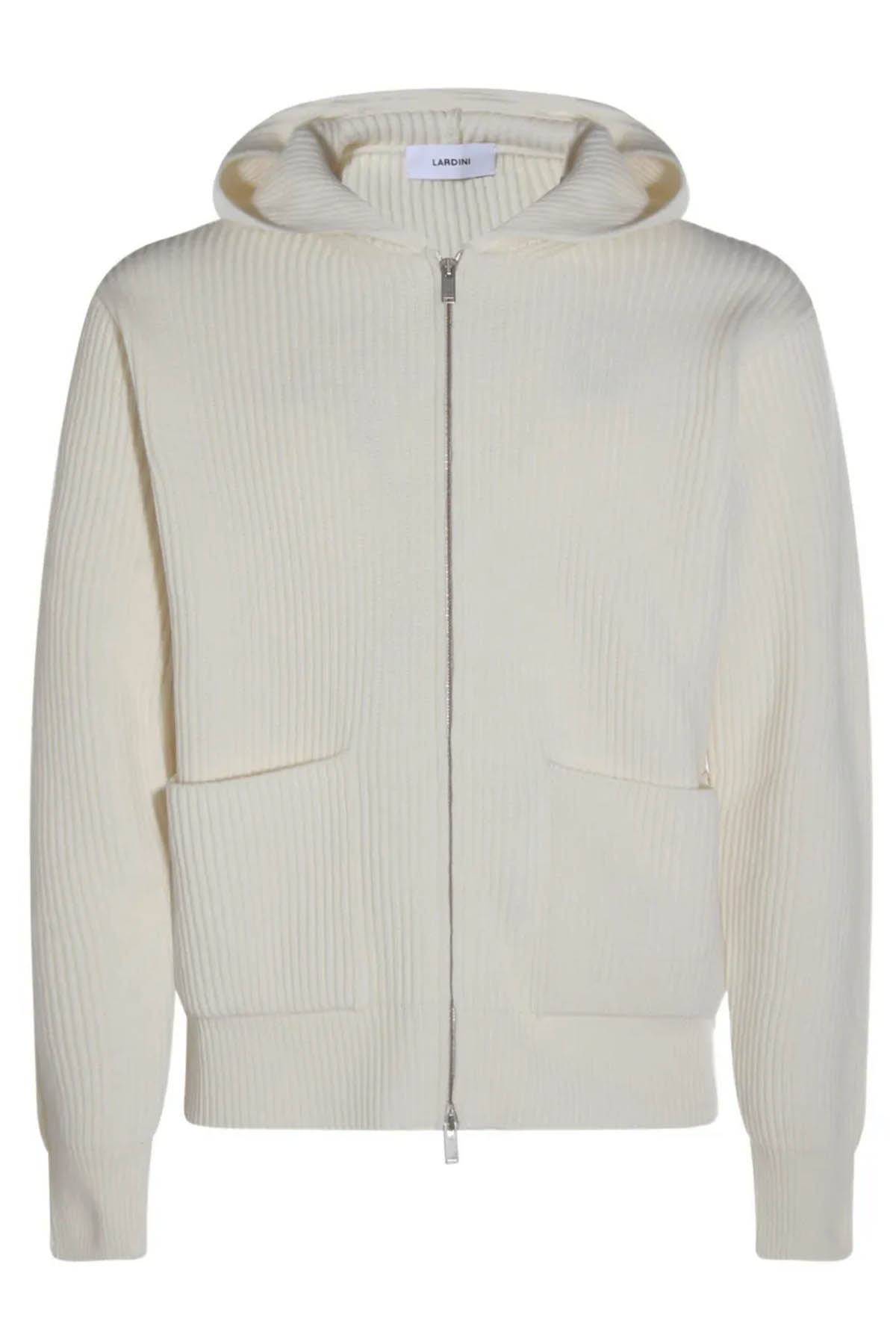 Zip-up cardigan made from an exclusive Lardini fabric, composed of 90% wool and 10% cashmere, with a ribbed hood, side pockets, and ribbed hem and cuffs.