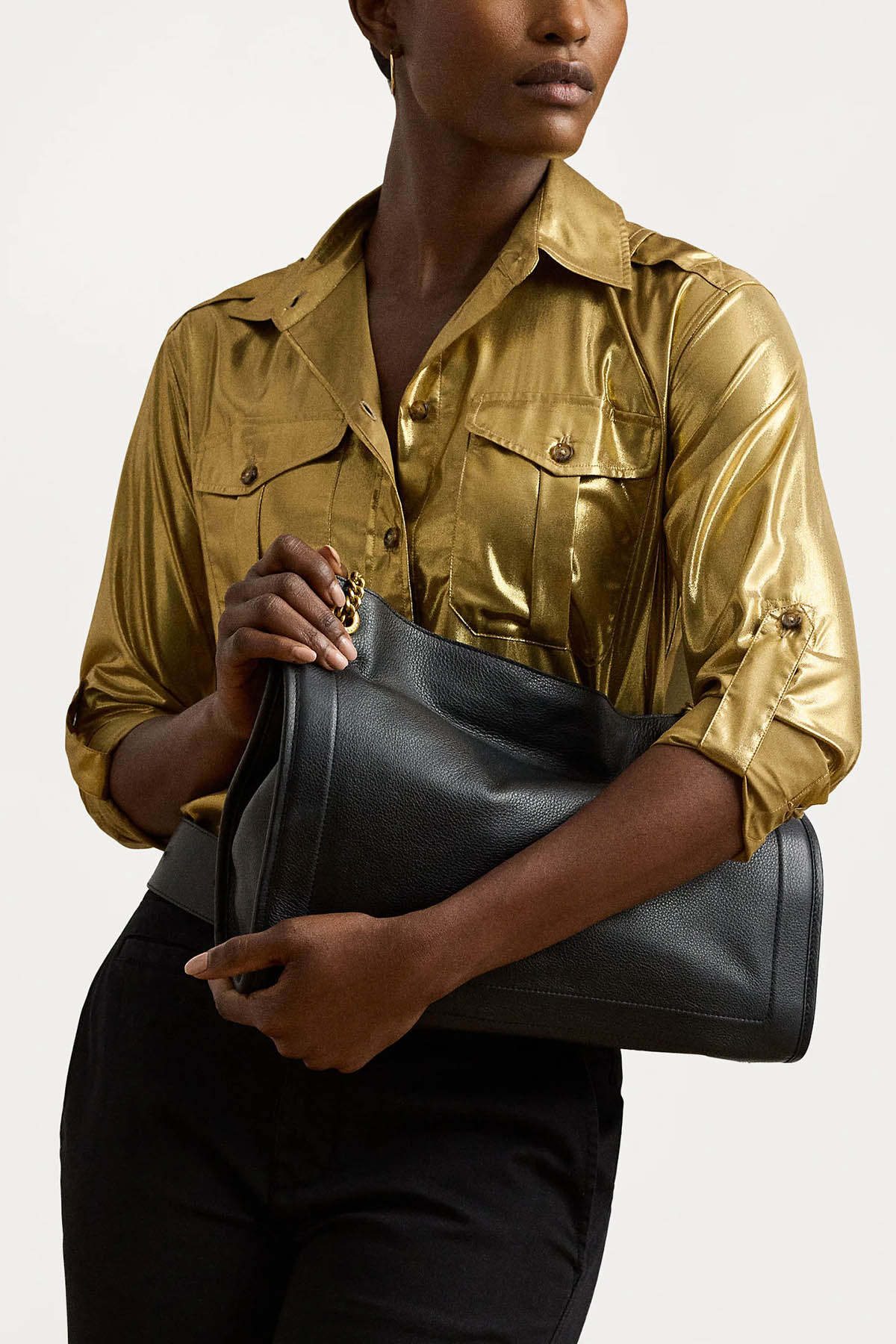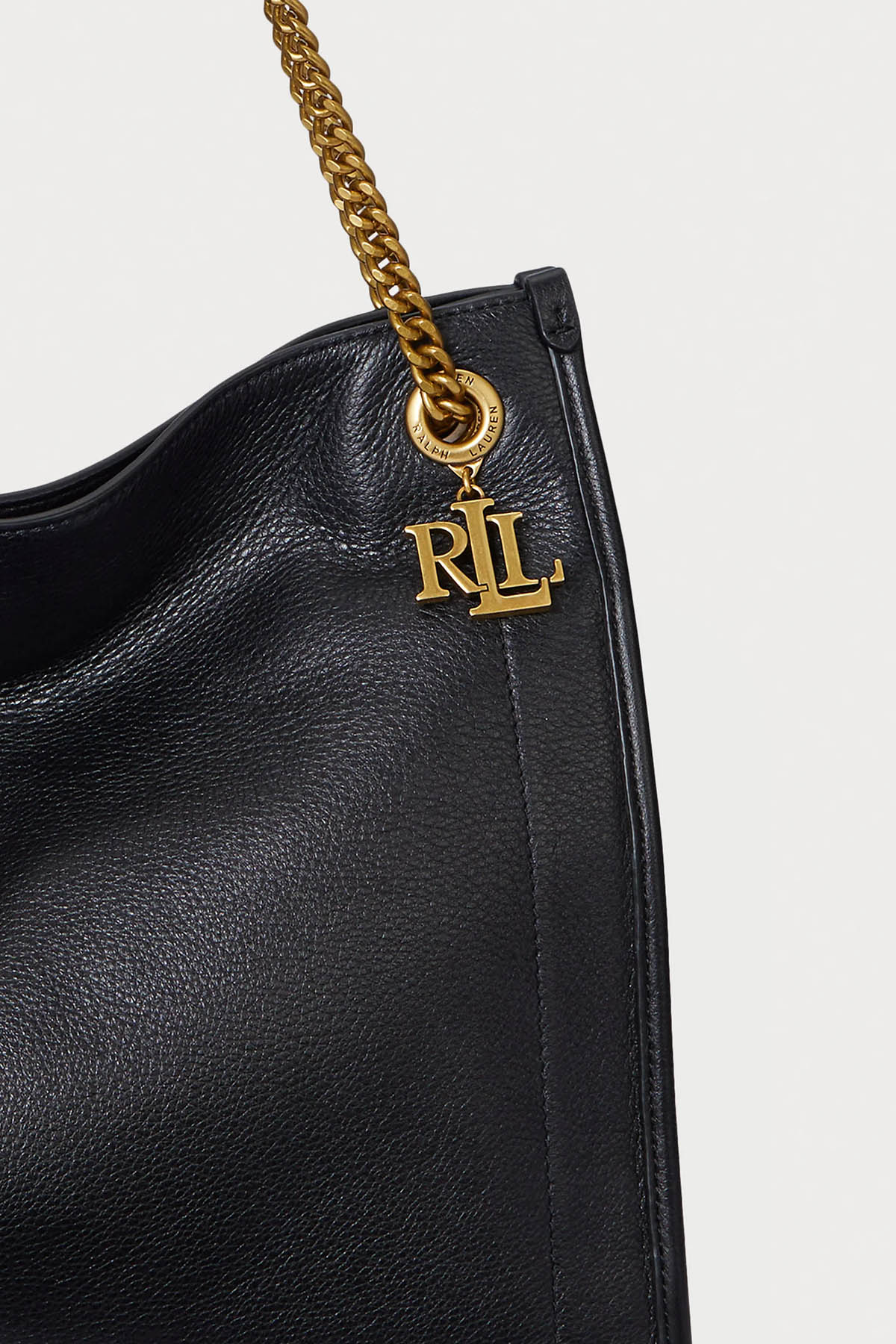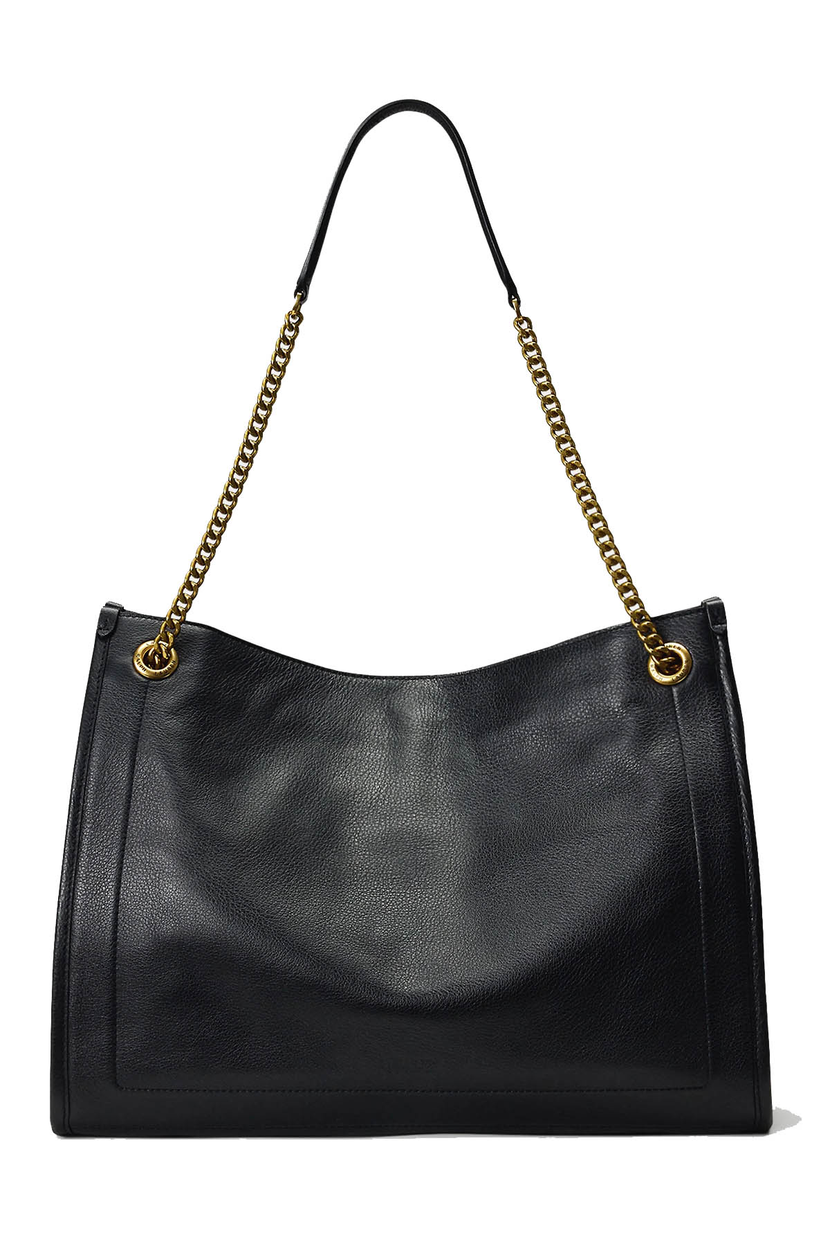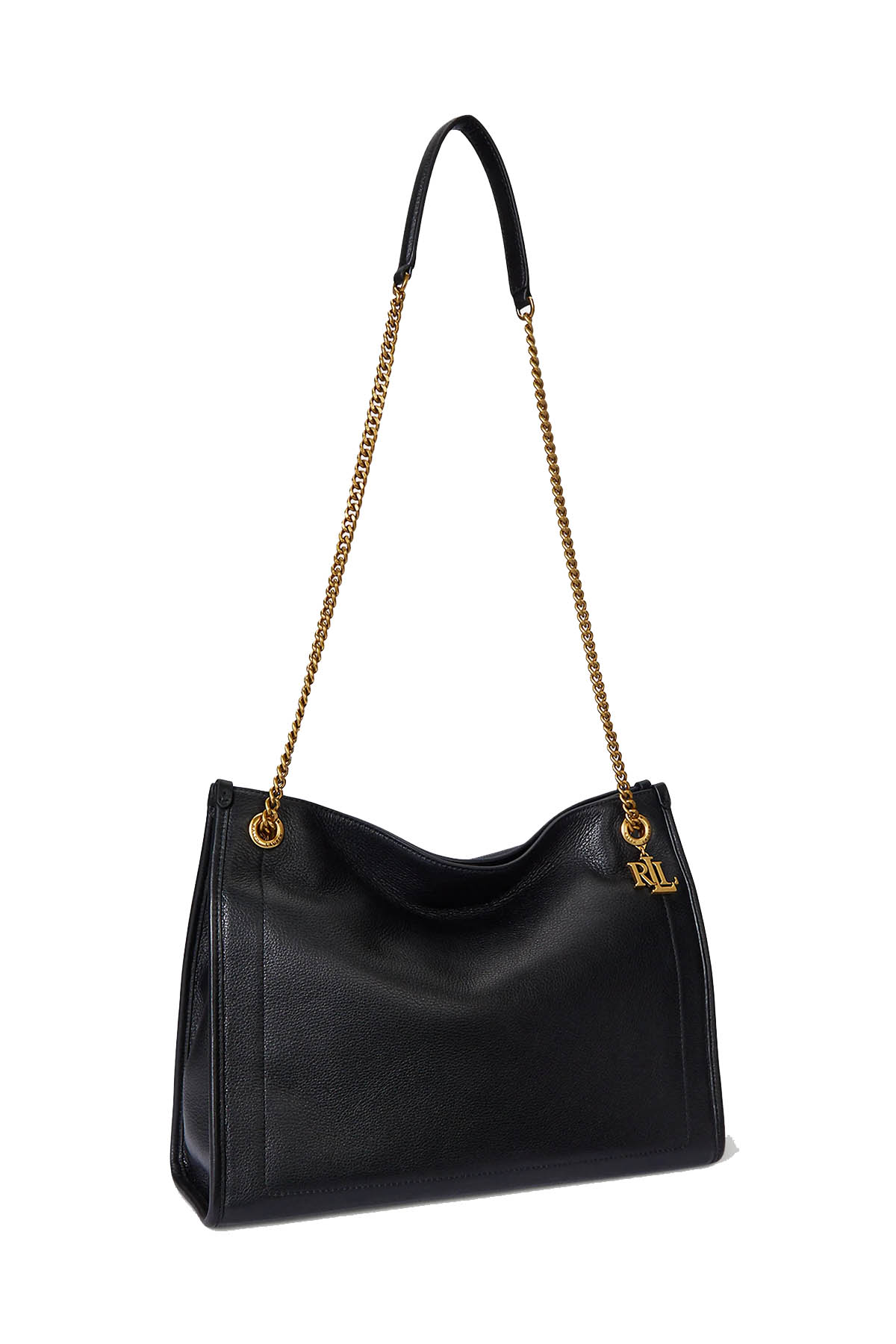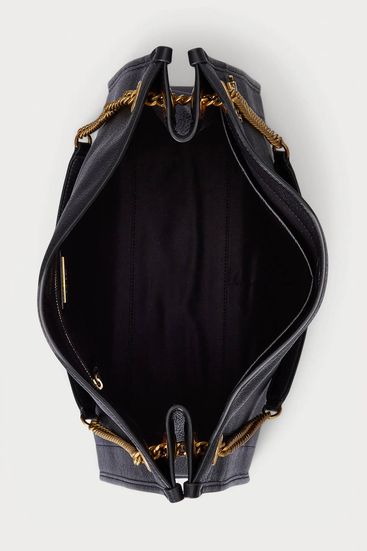 Leather tote bag with two chain handles, leather insert for comfort on the shoulders, magnetic closure, internal zipper compartment, and extendable handle for cross-body carry.