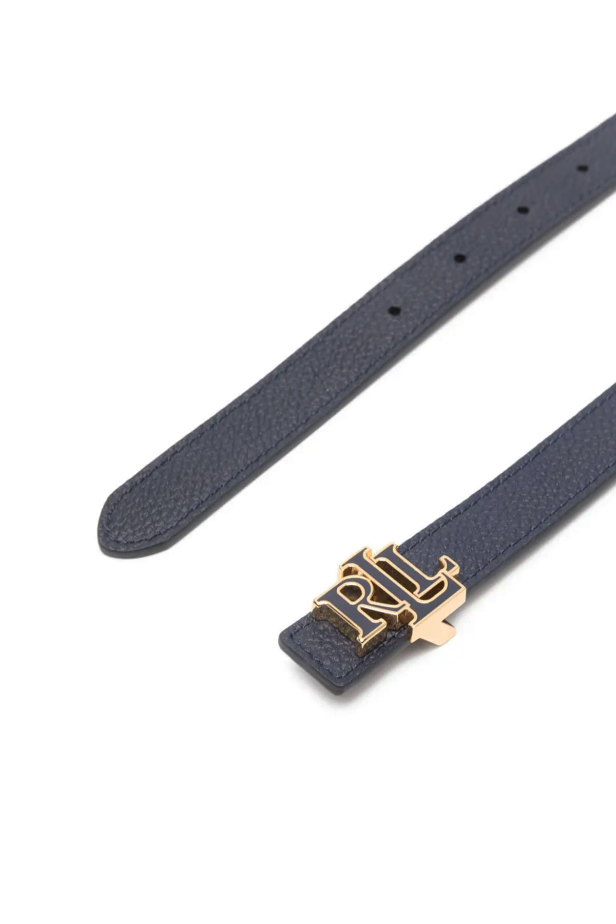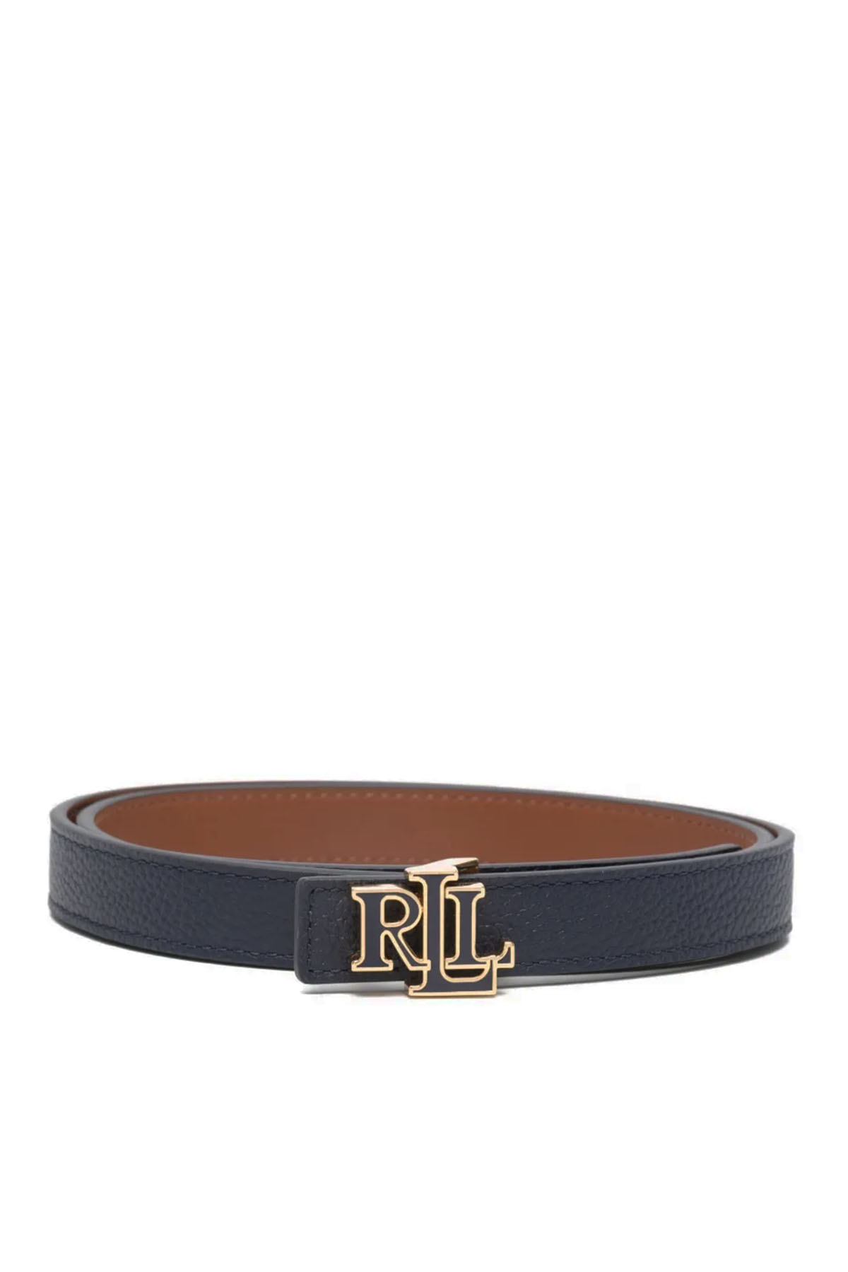 This model is embellished with a brass and enamel buckle with the "LRL" monogram. It features a double-sided design: one side is made of hammered leather, while the other is made of soft leather with a naturally smooth finish.