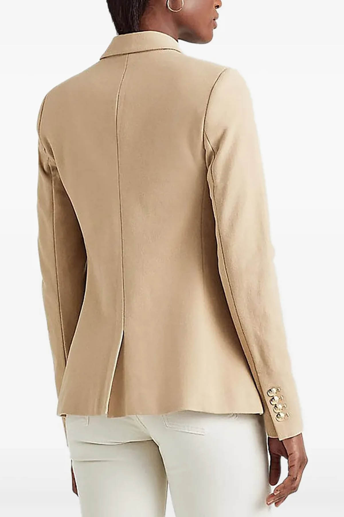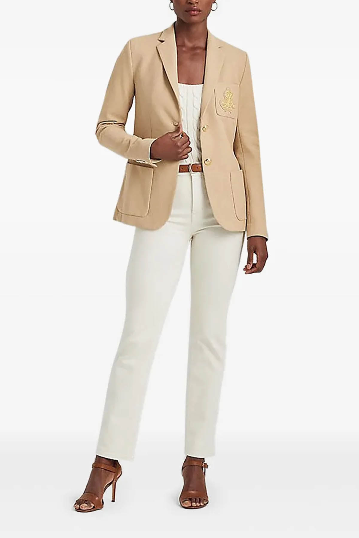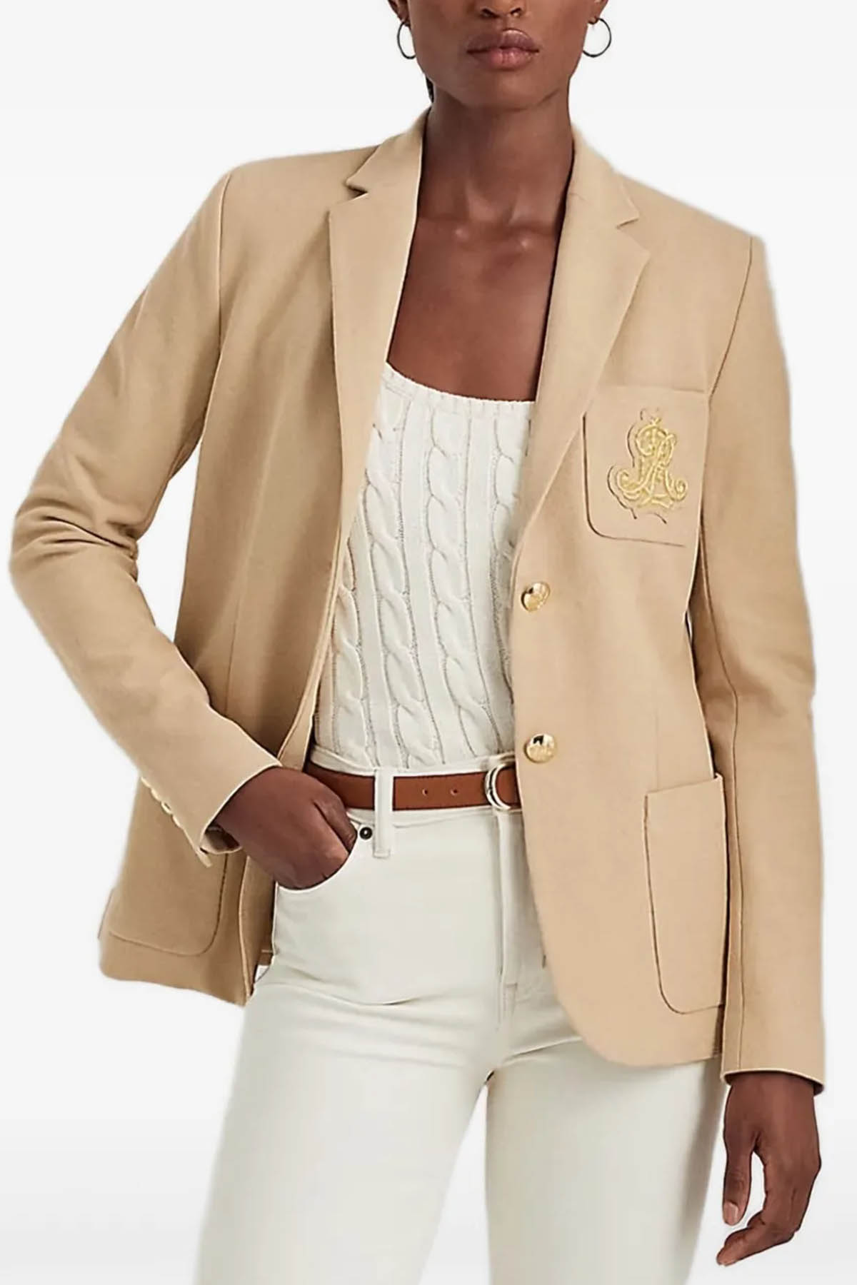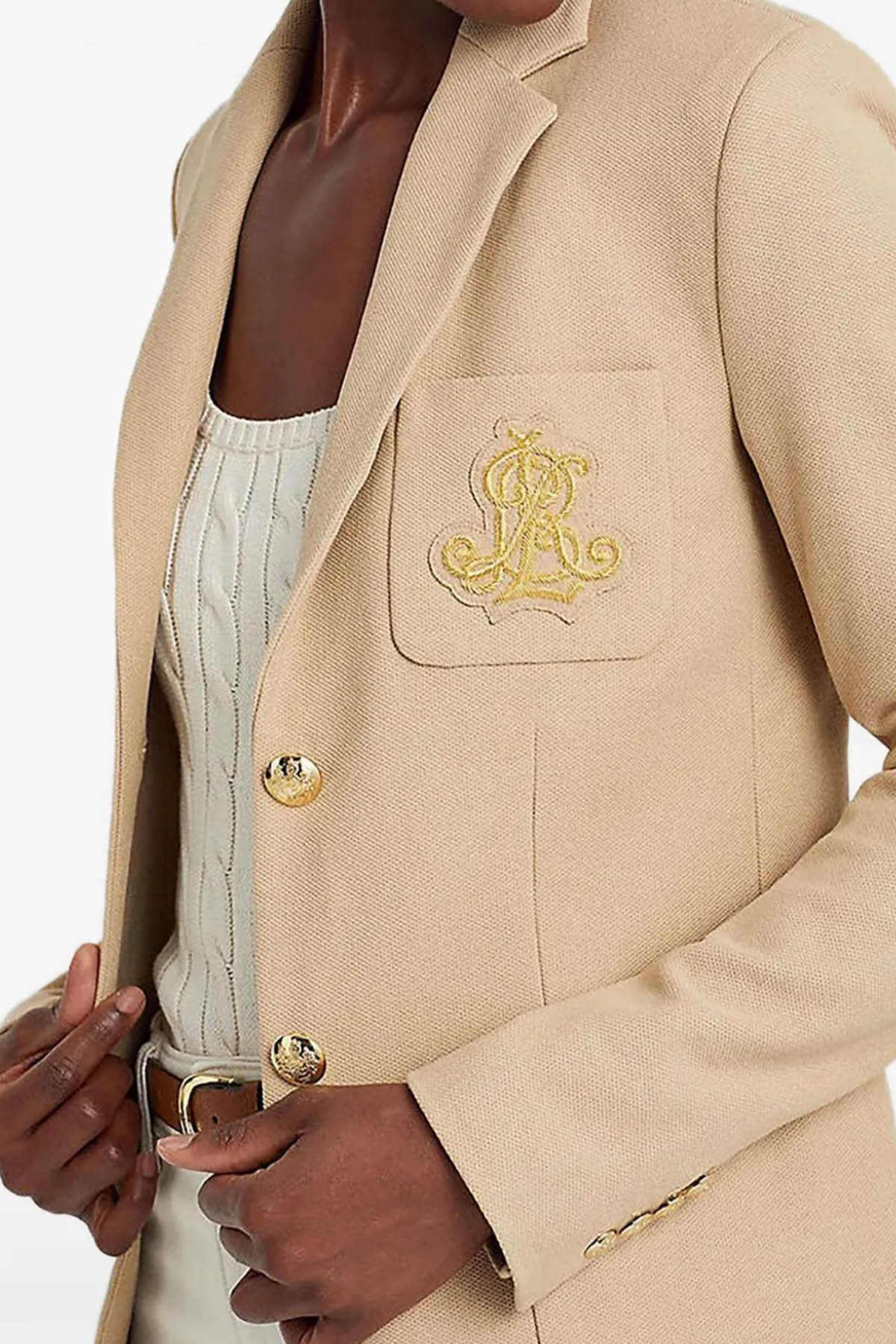 Single-breasted, lapels, long sleeves, embroidered logo on the pocket, side pockets, and front button closure with gold buttons.