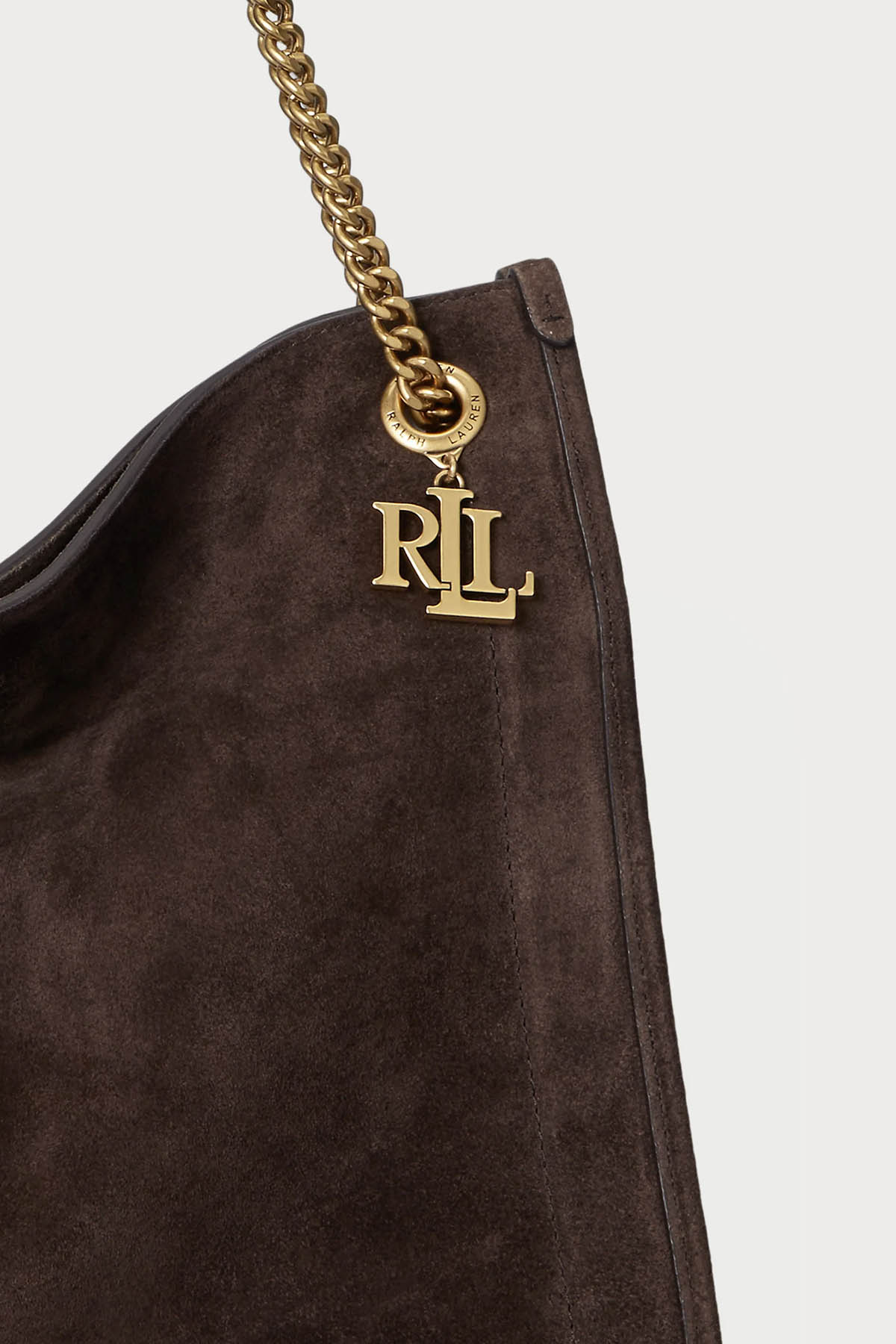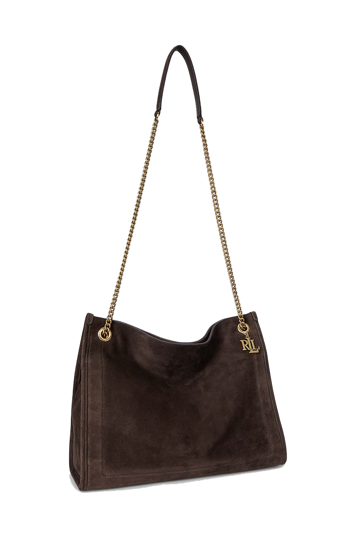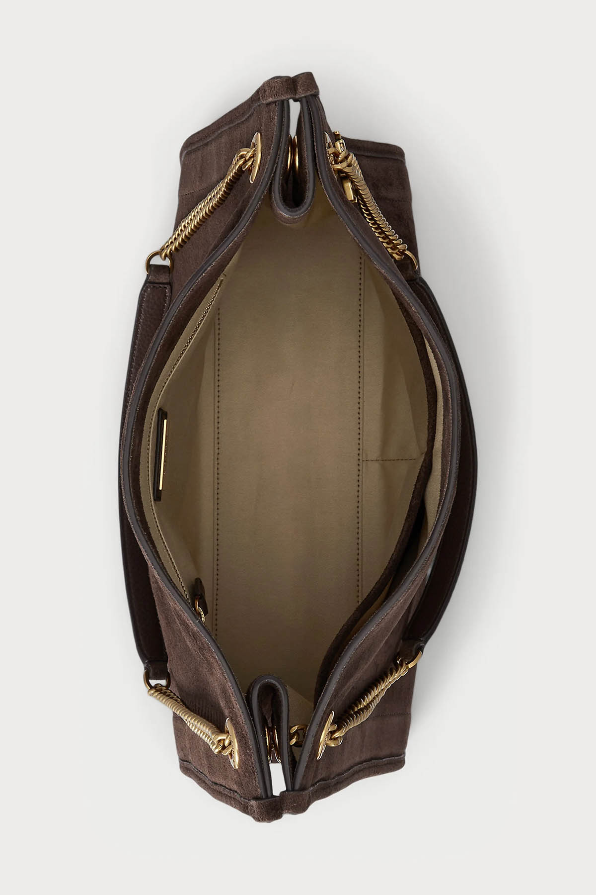 Suede tote bag with two chain handles, leather insert for comfort on the shoulders, magnetic closure, internal zipper compartment, and extendable handle for cross-body carry.