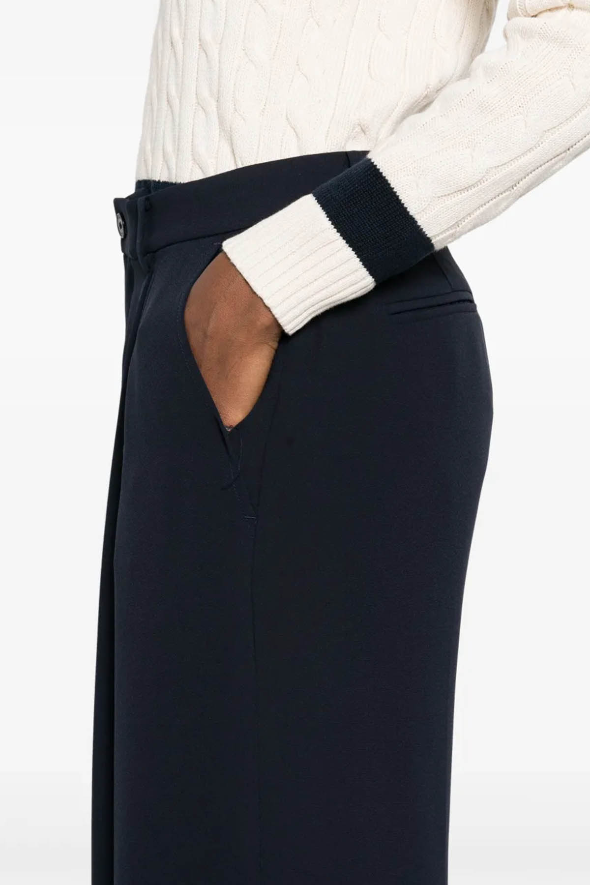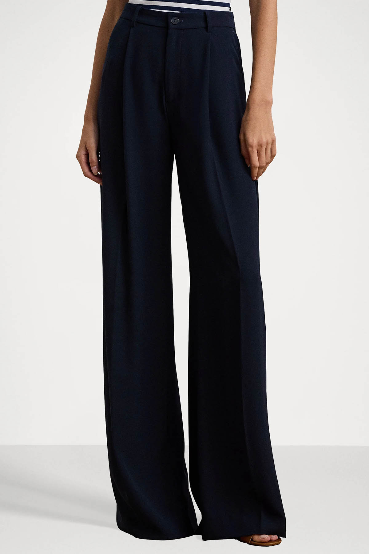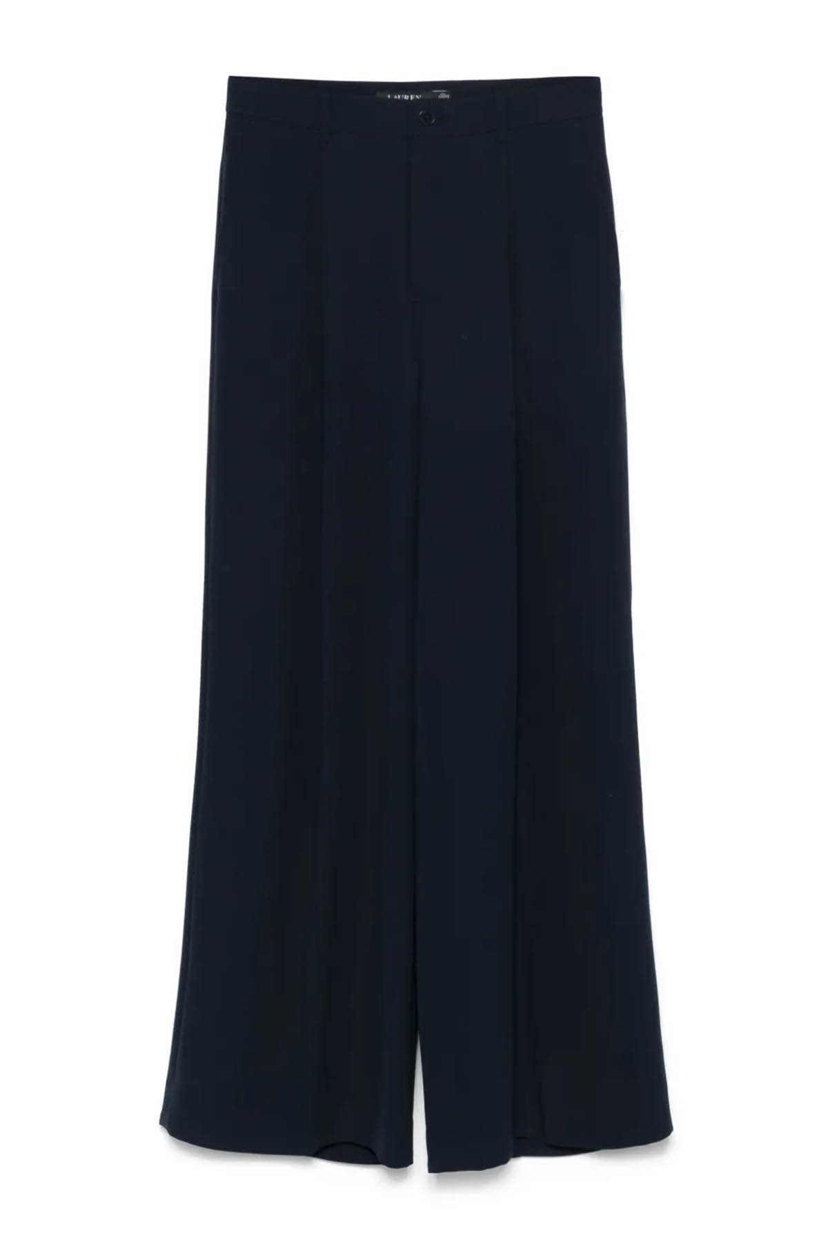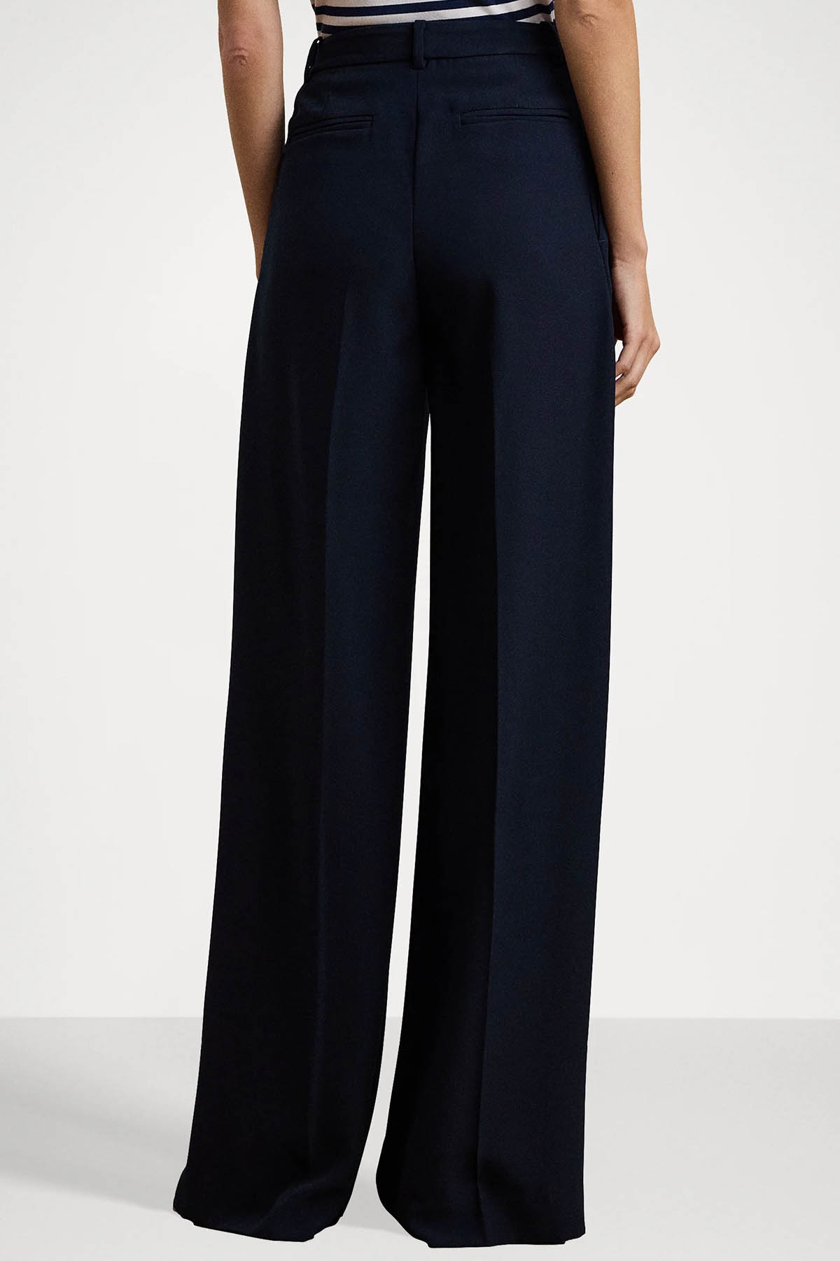Wide-leg design, concealed zip and button front closure, concealed side pockets, two back pockets, belt loops, long design.
