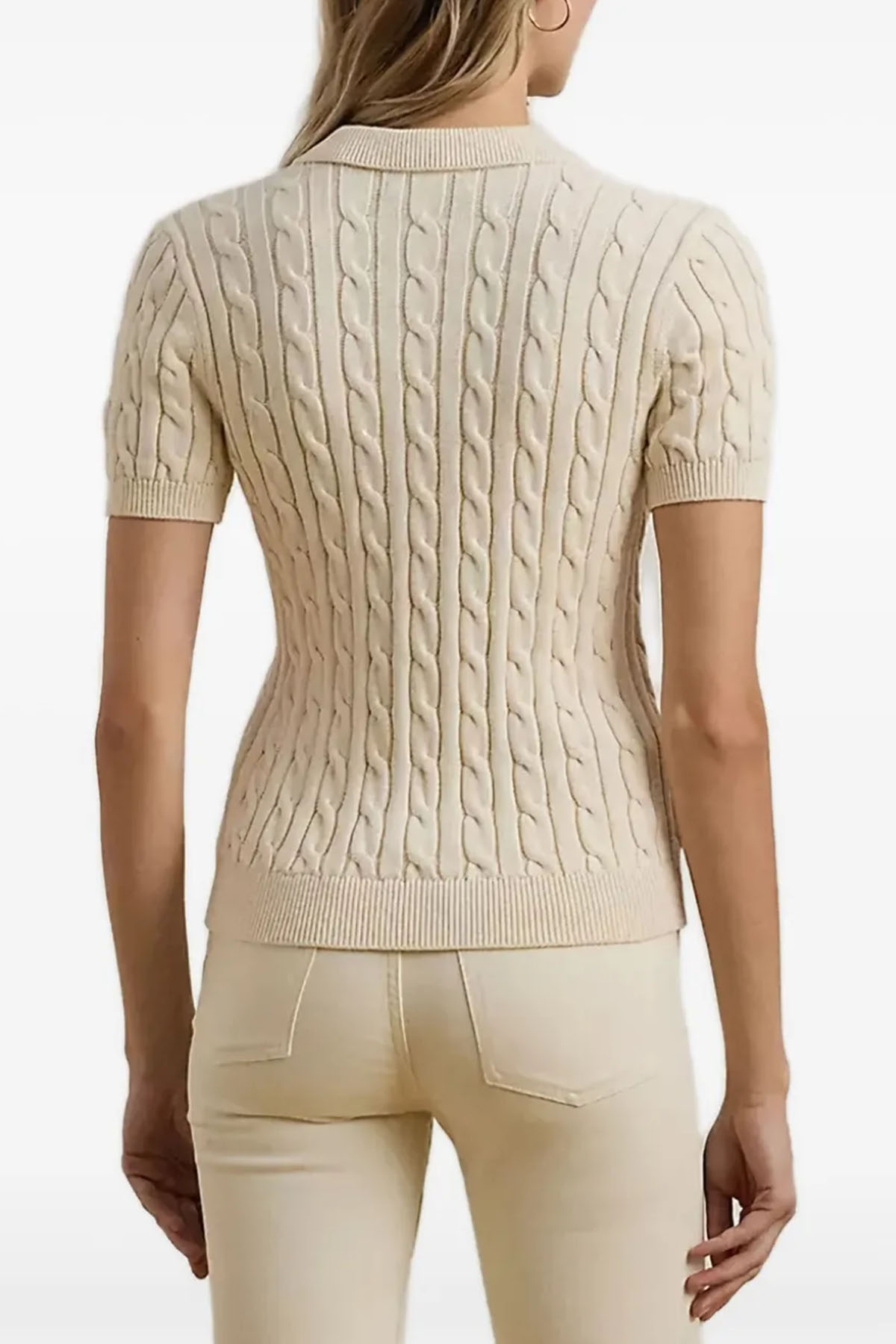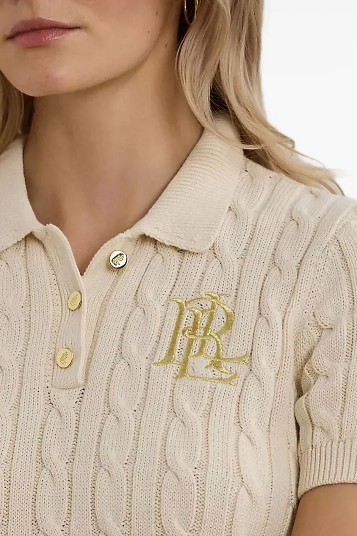 Woven design, short sleeves, polo collar, embroidered logo, gold-tone button closure, cream color, ribbed hem.