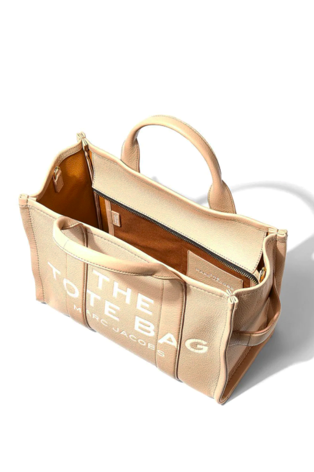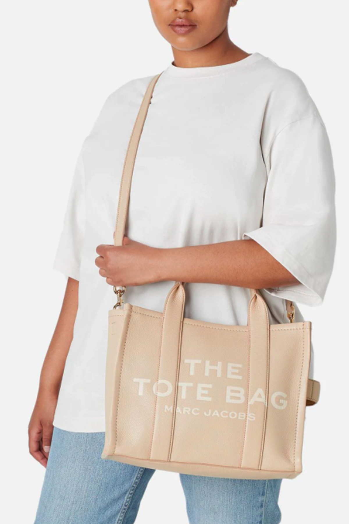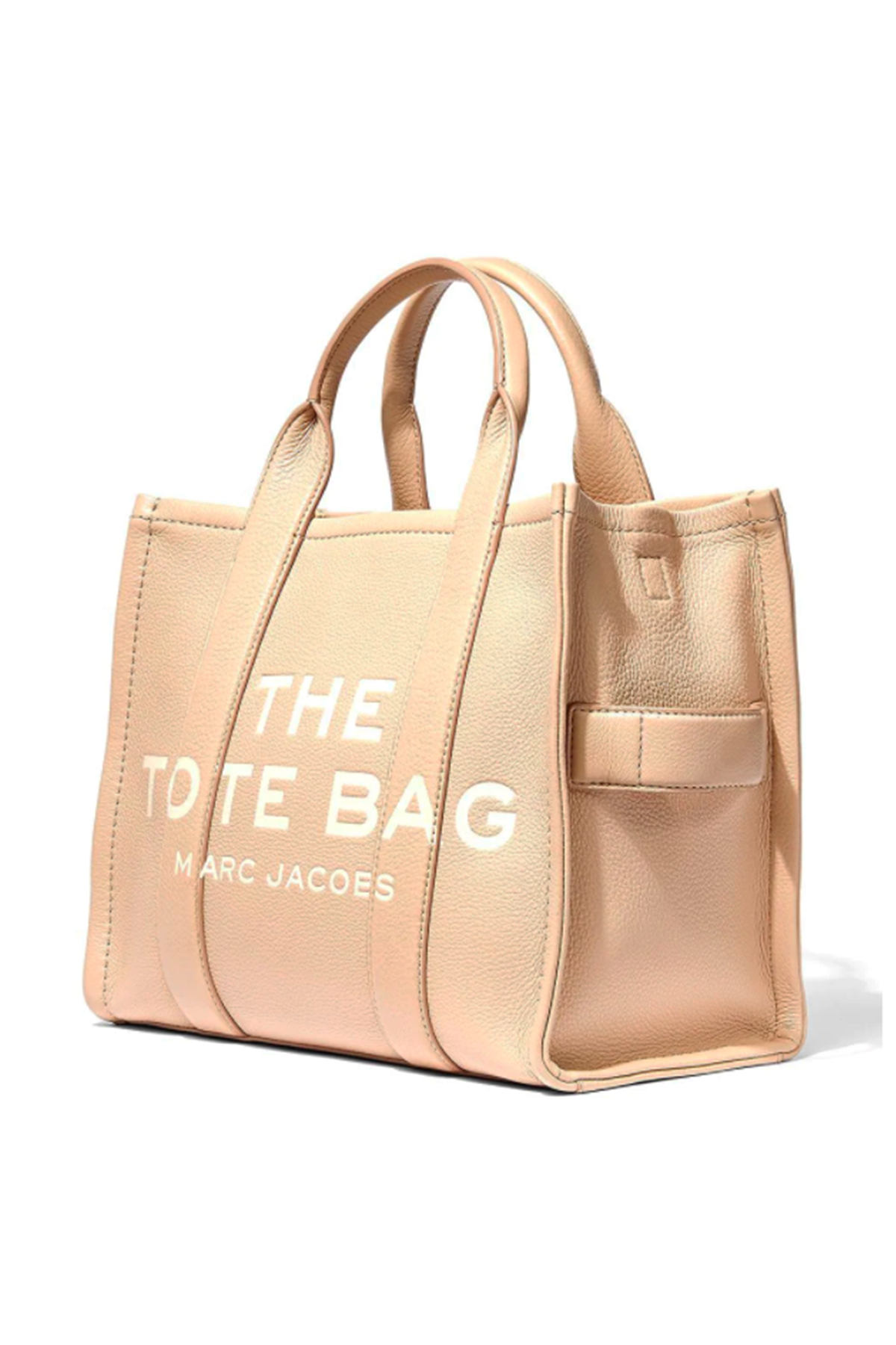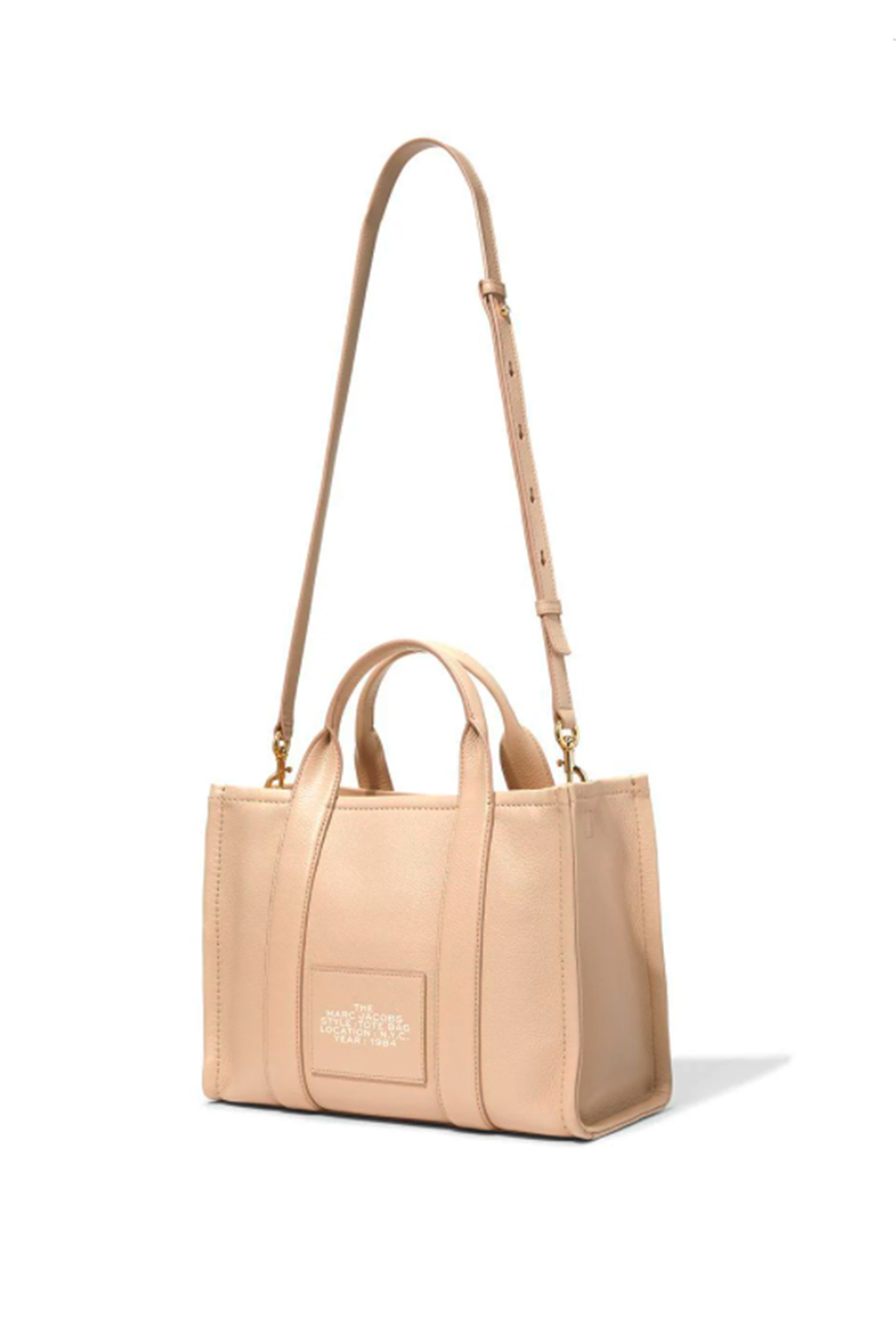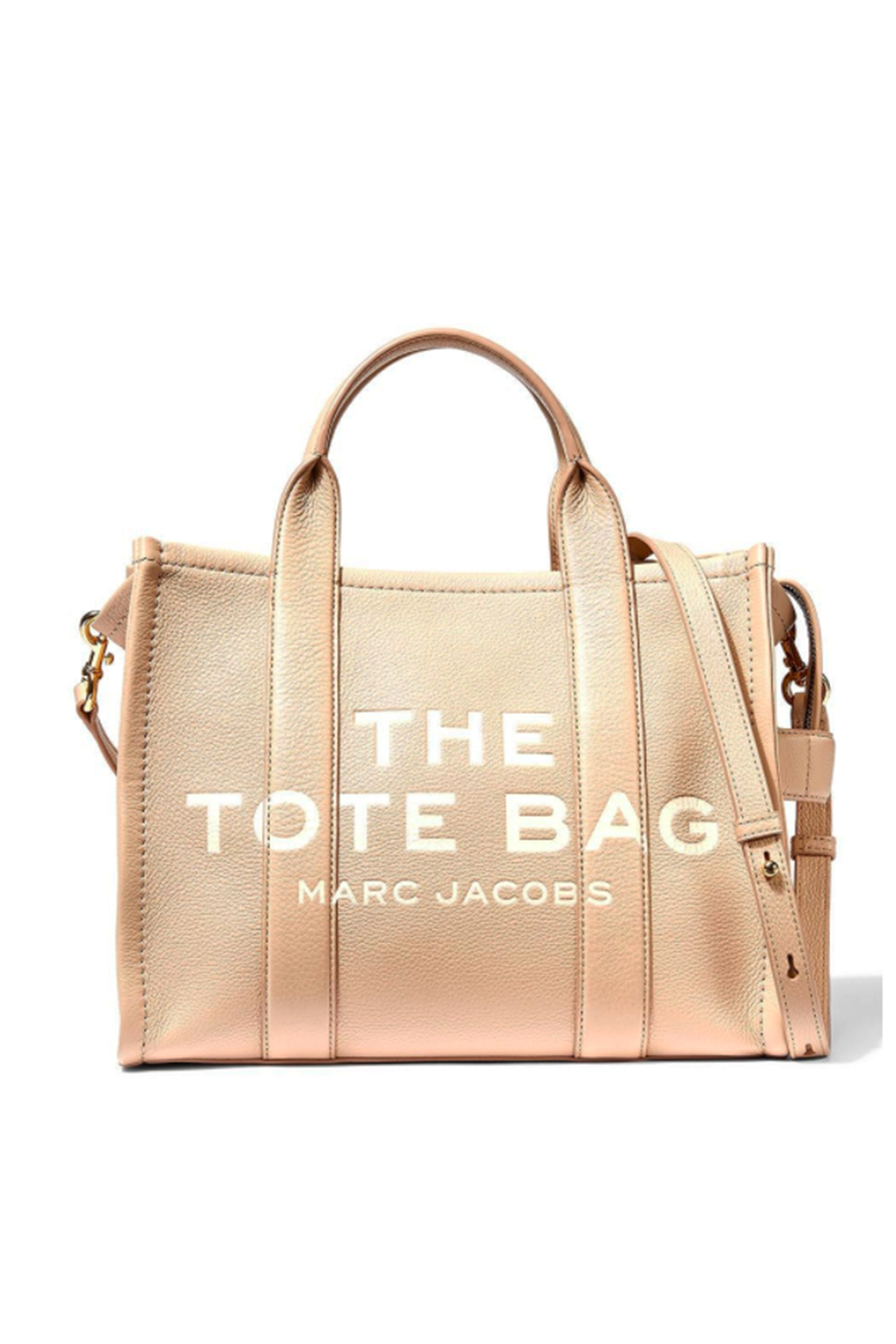 Bag with handles, front logo, adjustable and removable shoulder strap, gold-colored metal components, top zip closure, single internal compartment, internal pocket.