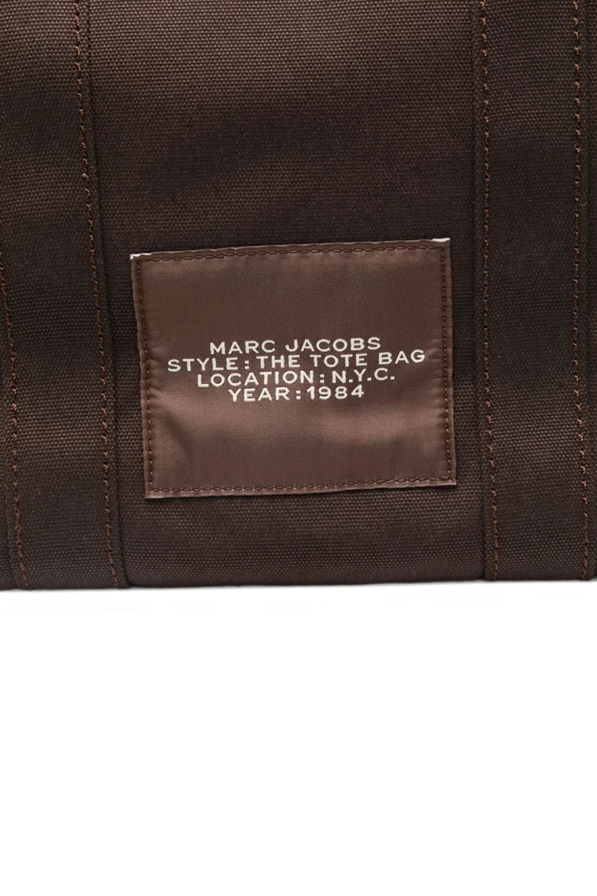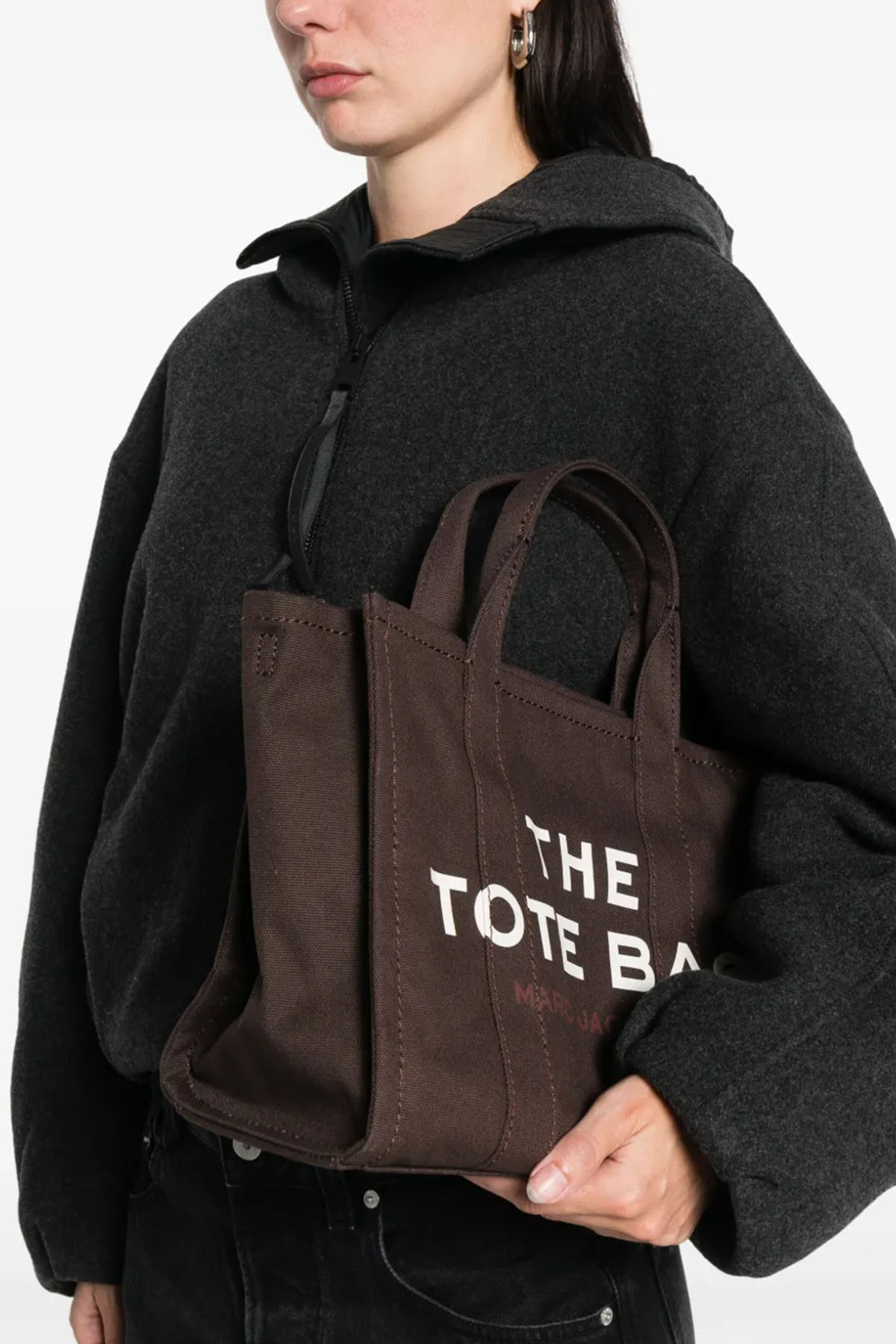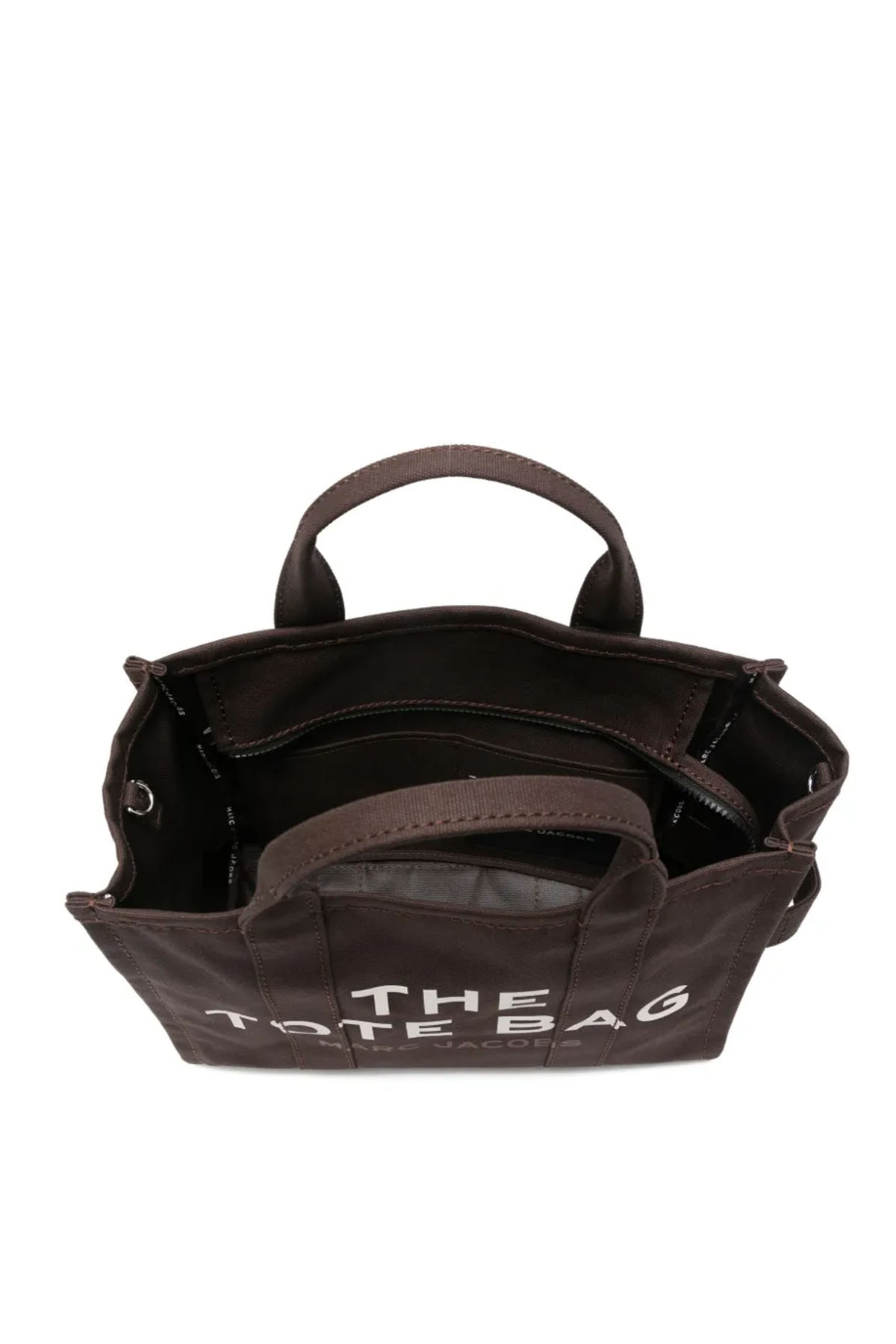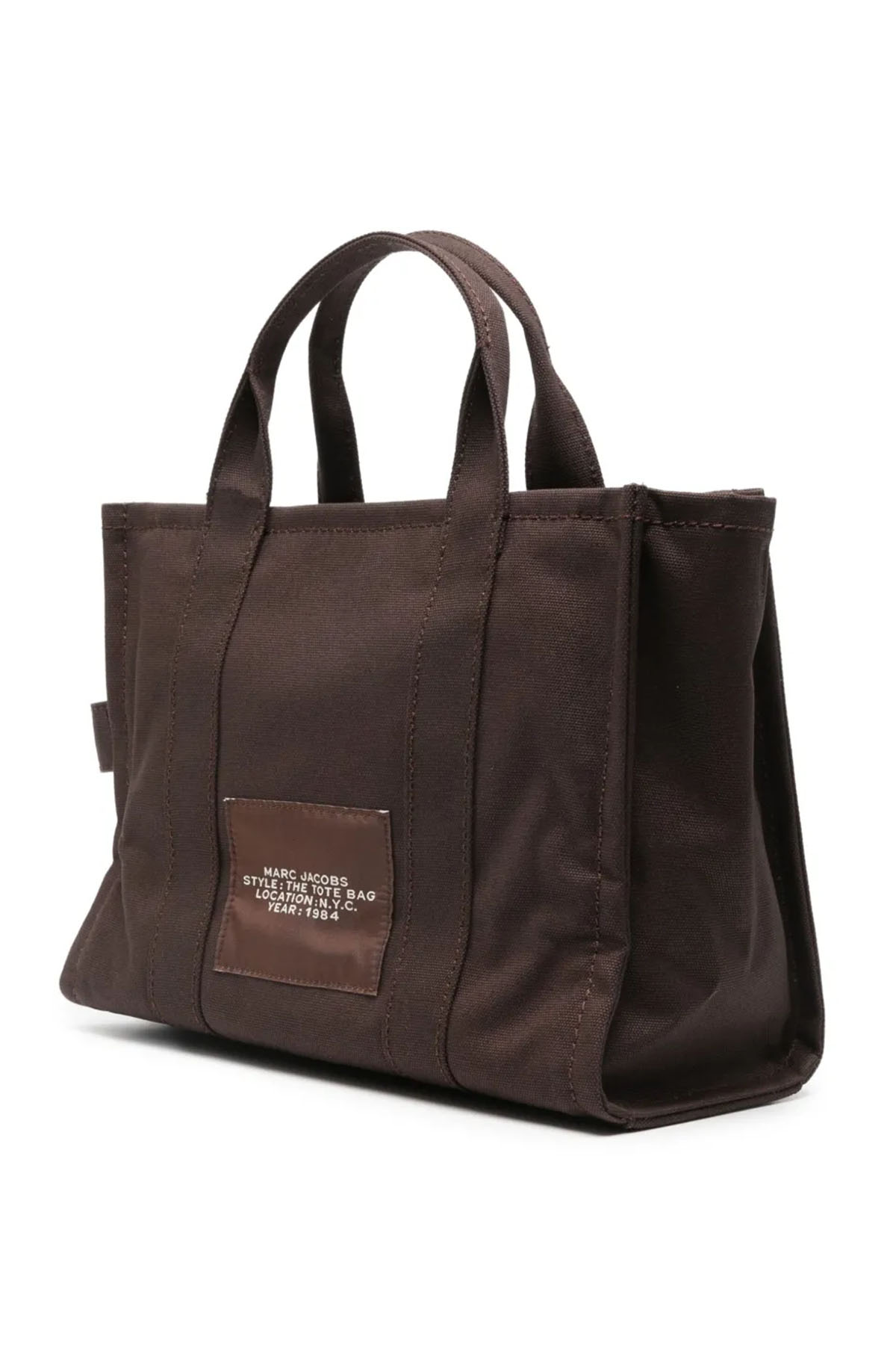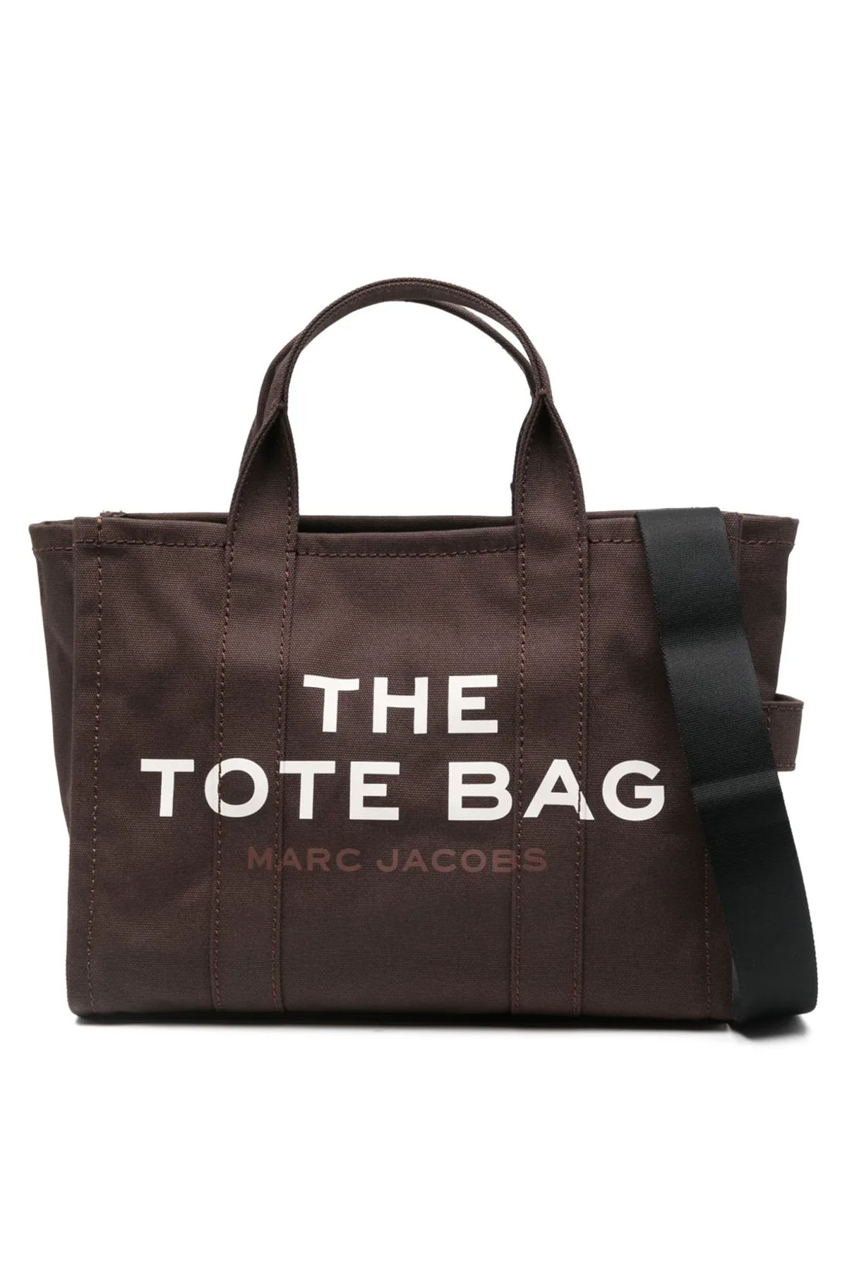 Brown model, two handles, adjustable and removable shoulder strap, applique detail, internal pocket, top zip closure, printed logo on the front.