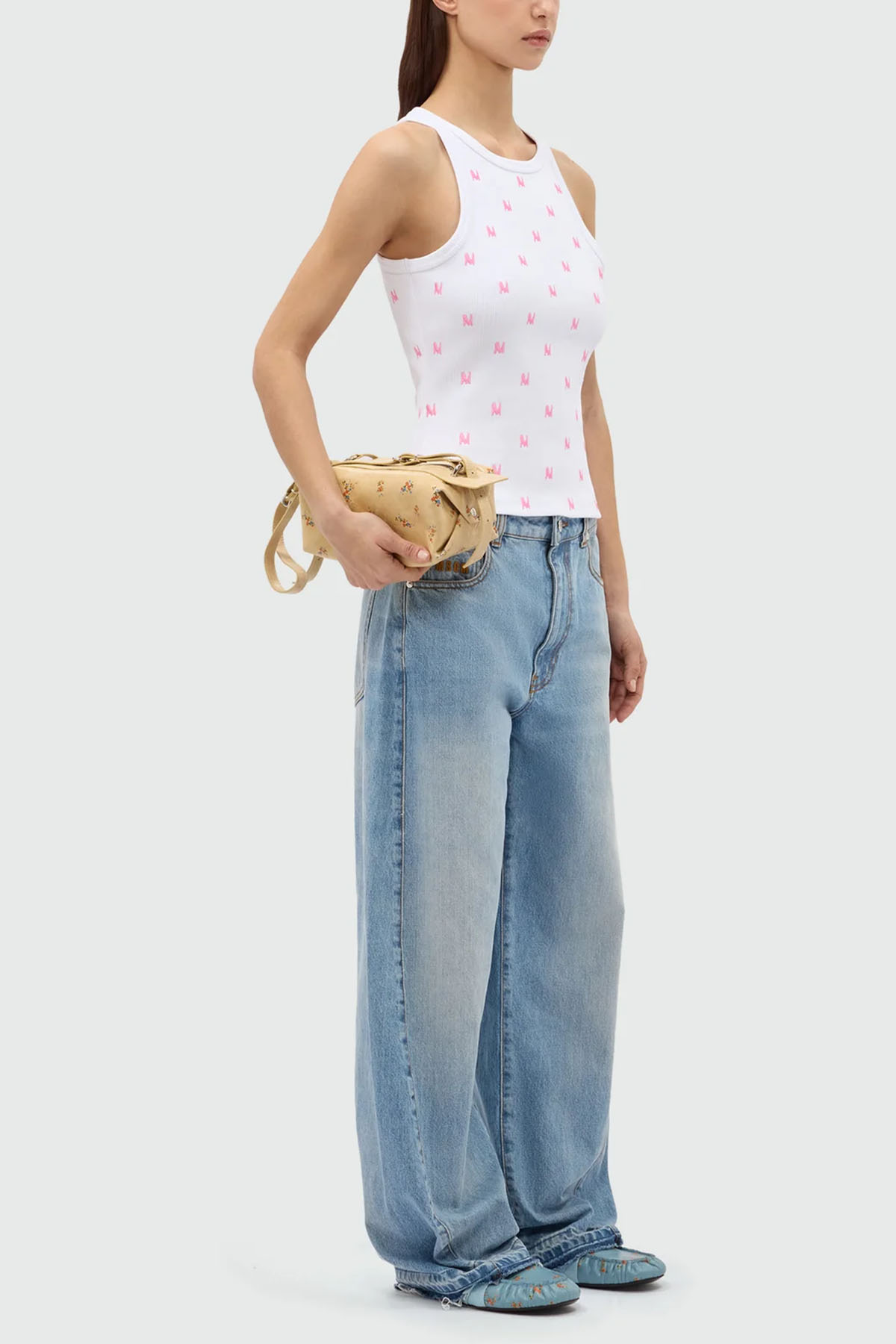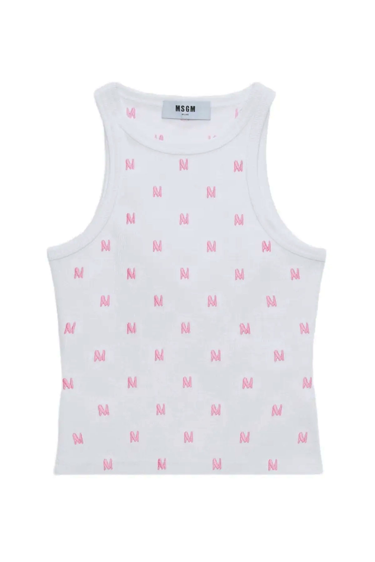 White/pink ribbed cotton jersey top with allover Mwave embroidery, halter neck, sleeveless.