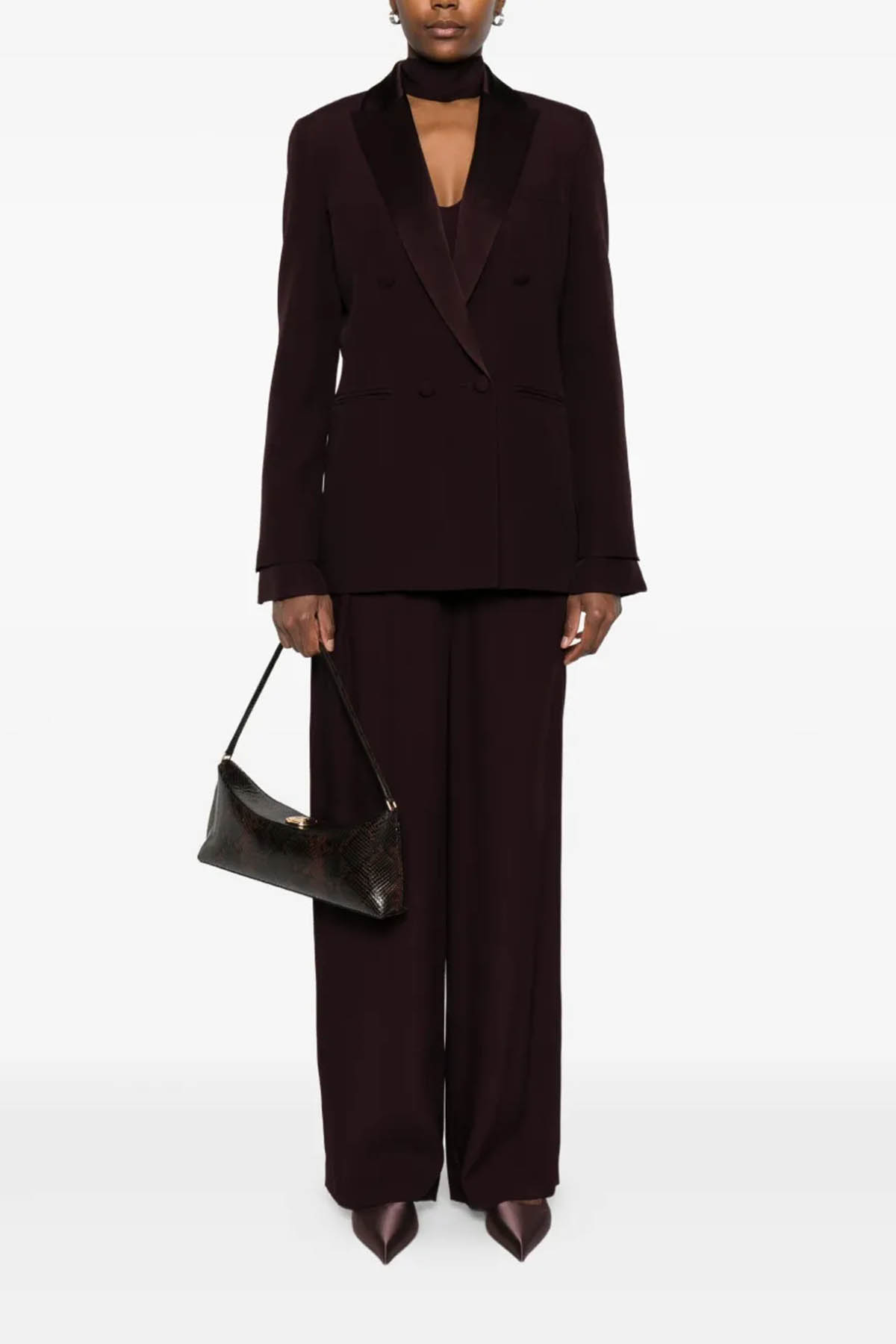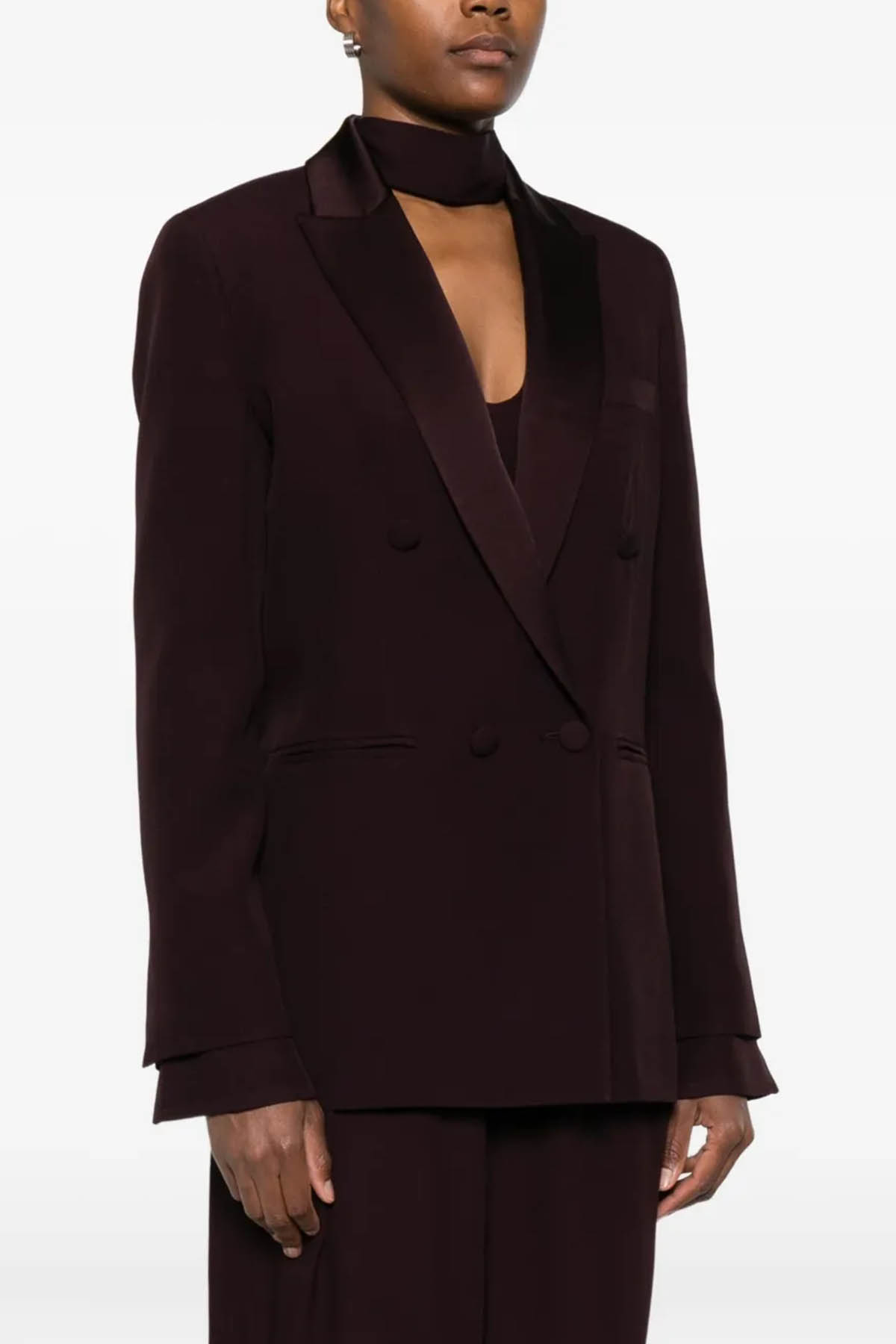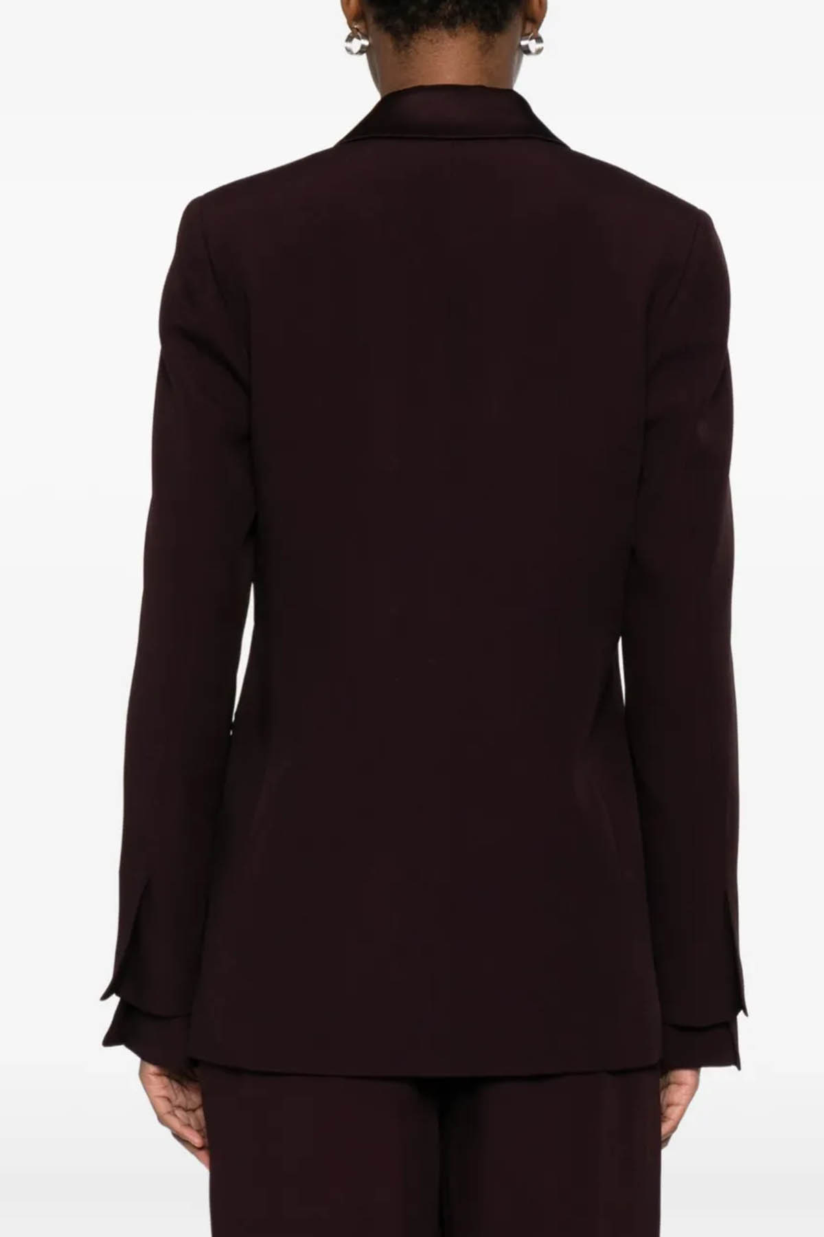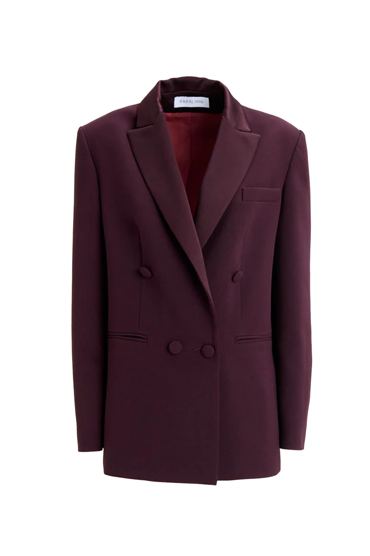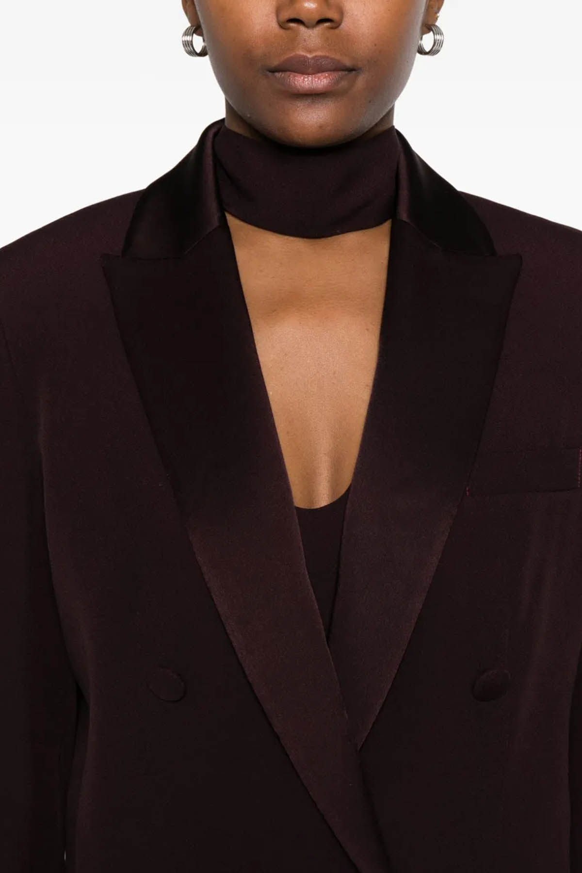 Double-breasted V-neck, shoulder pads, lapels, long sleeves, covered buttons, and welt pockets.