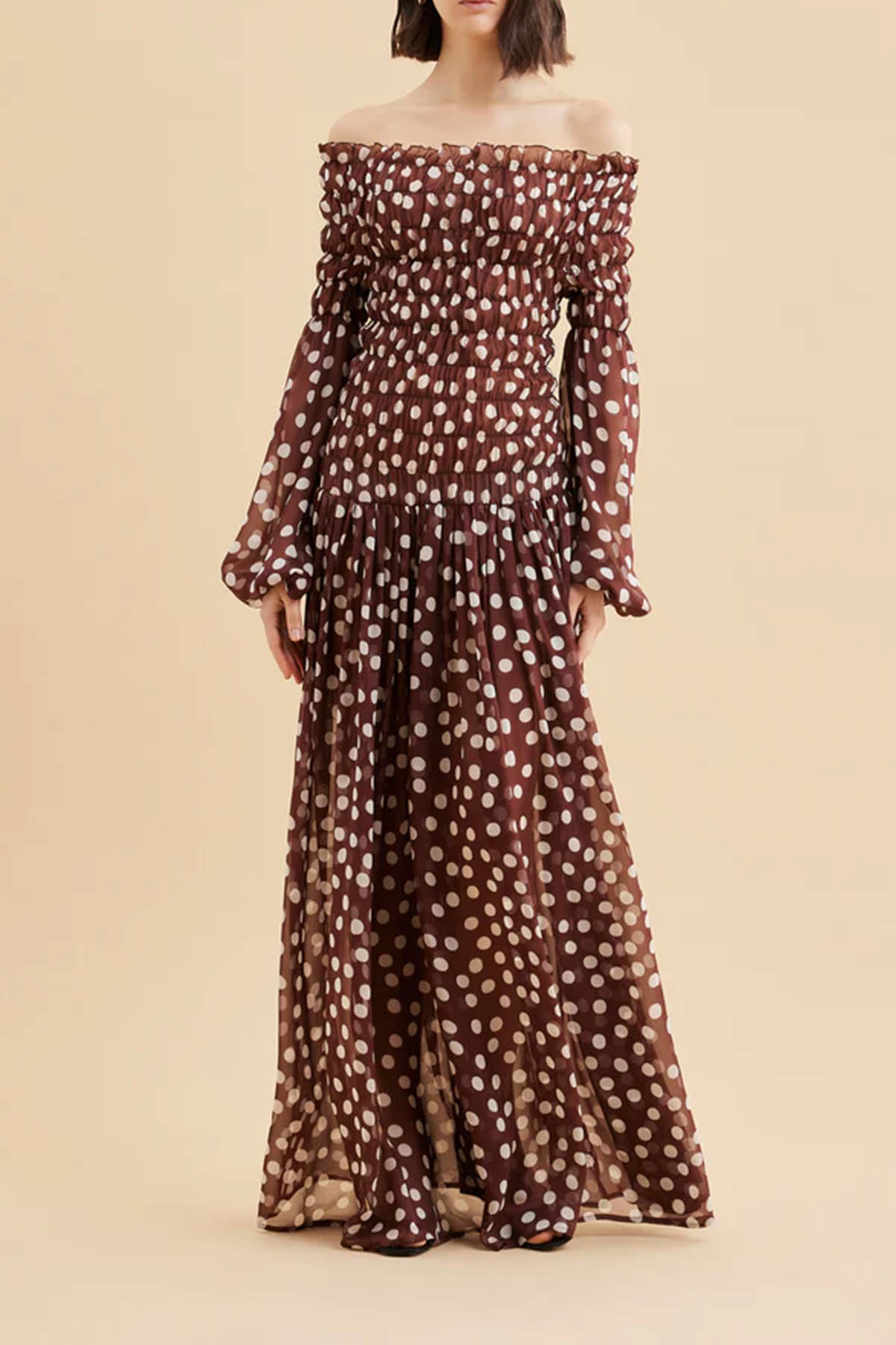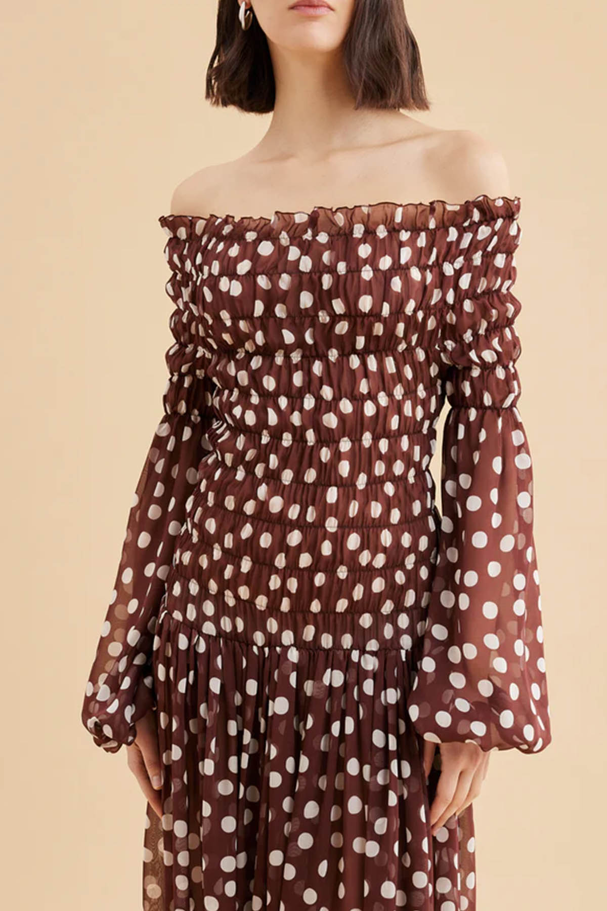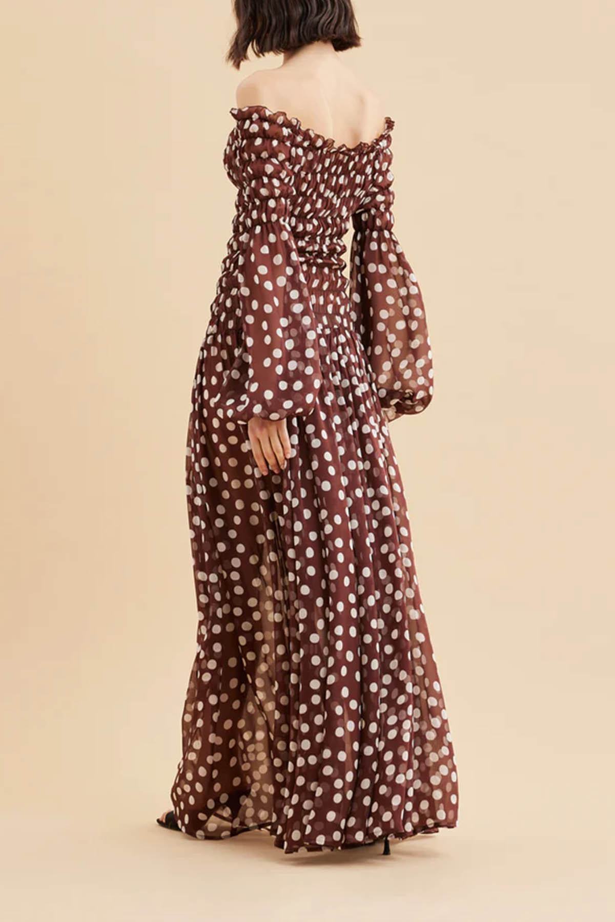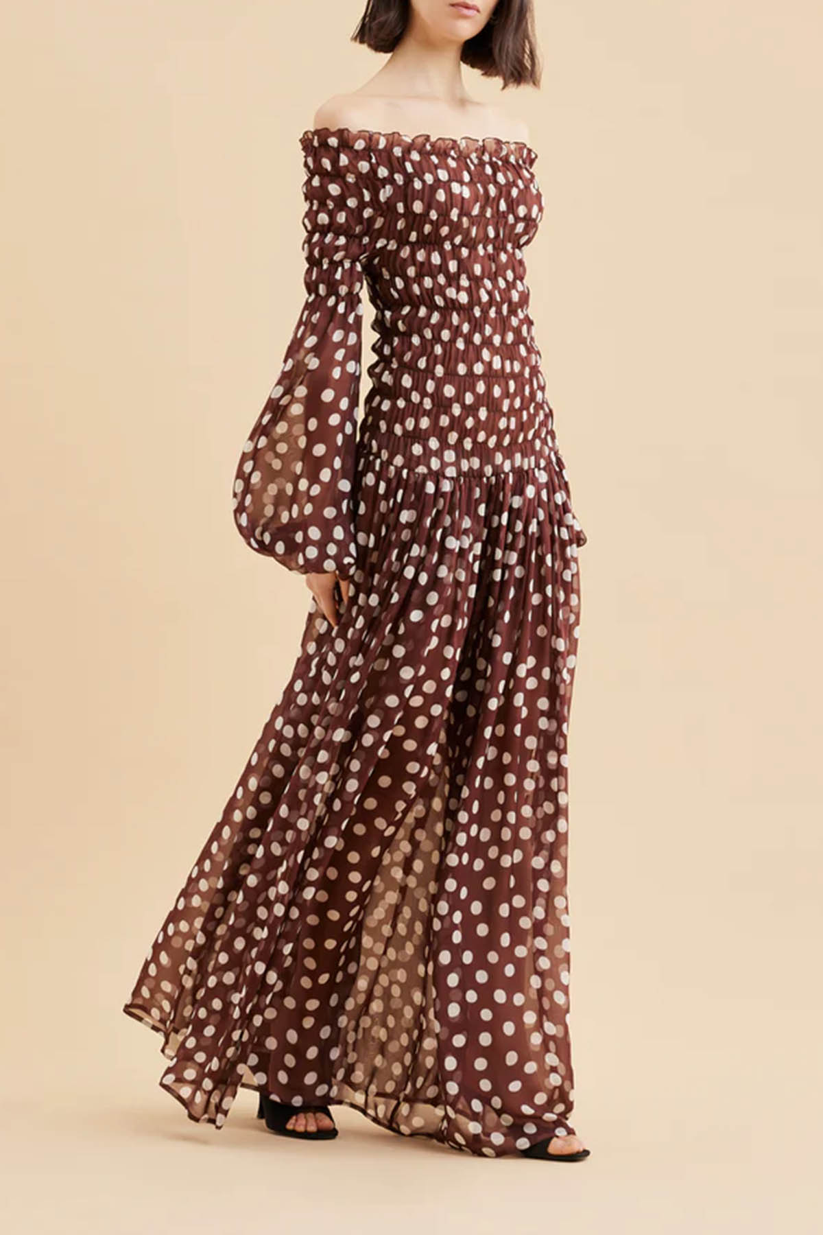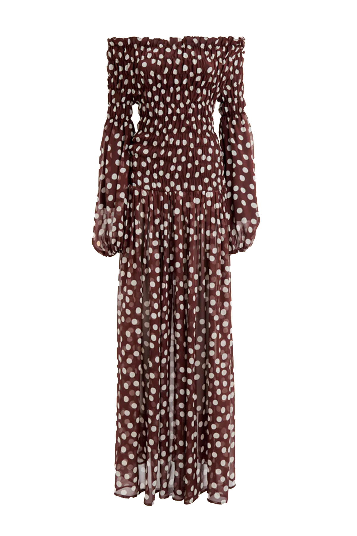 Long-sleeved, polka-dot print, elasticized boat neckline, sheer design with a petticoat, elastic cuffs, mid-length.