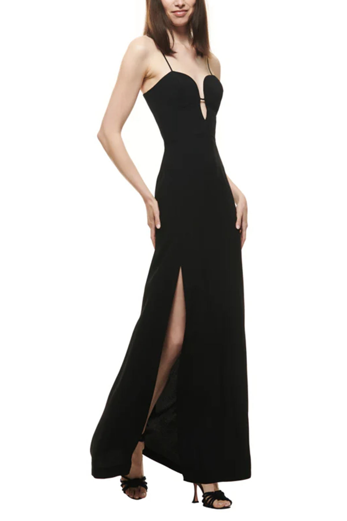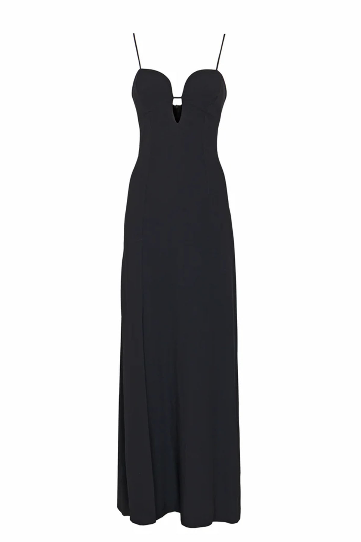 Black model with thin shoulder straps, V-neck, side slit, hidden back zip closure, long design.