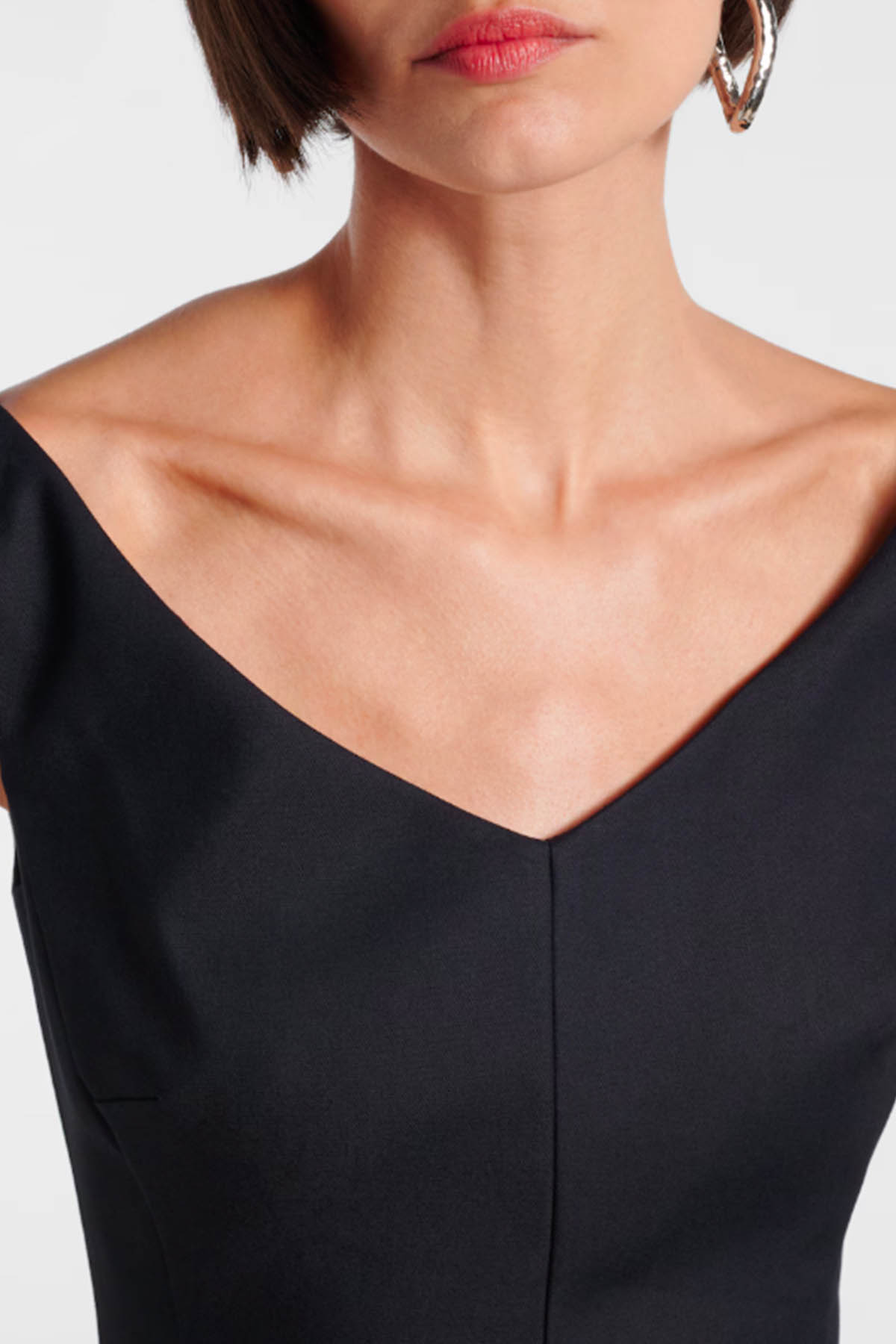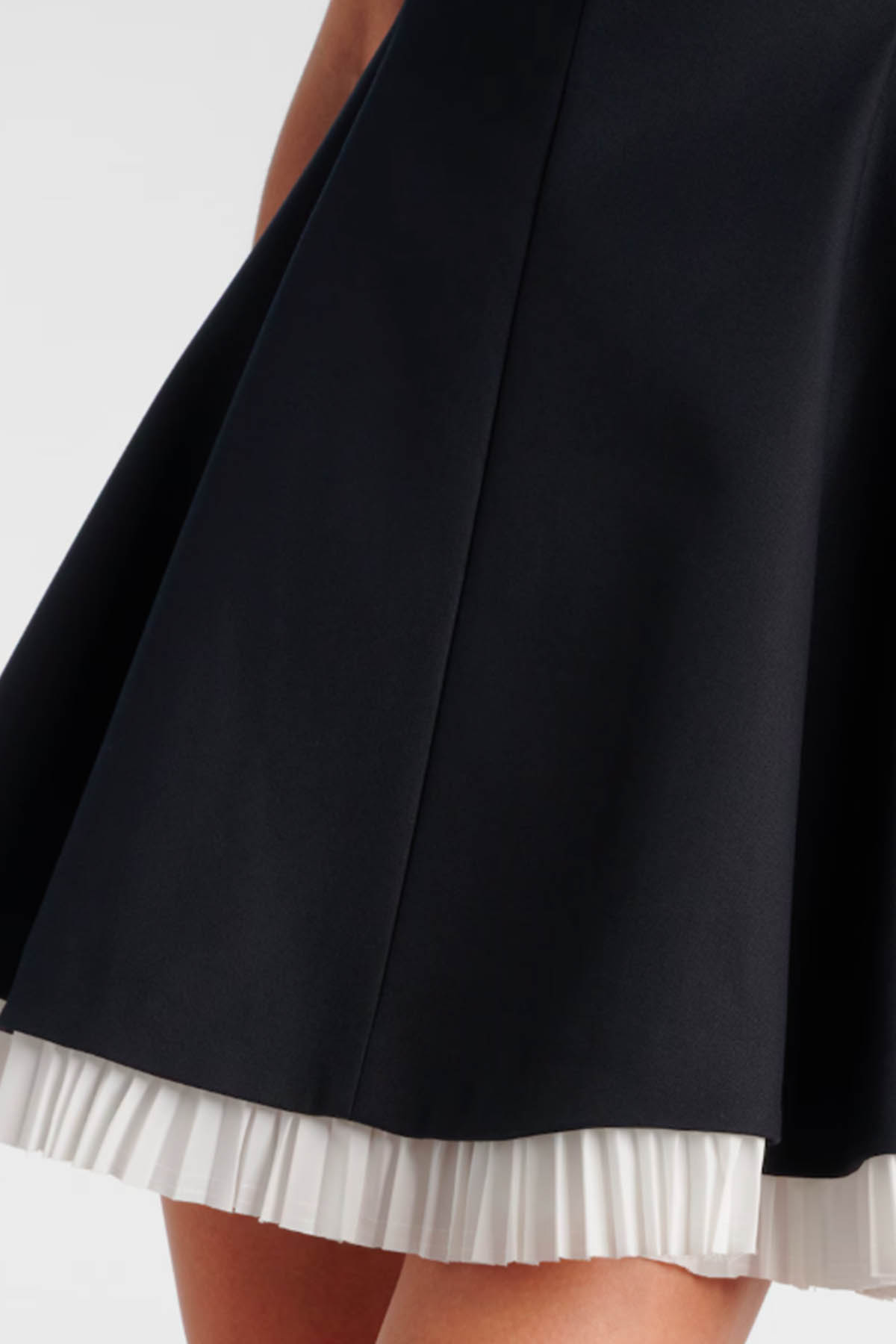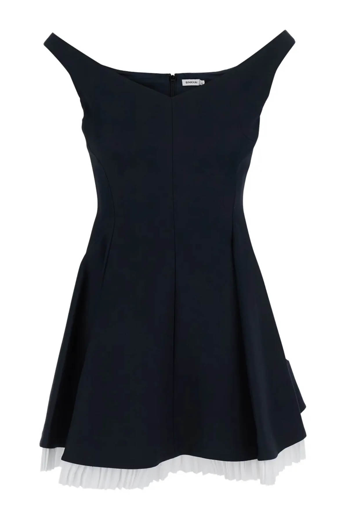 Boat neckline, sleeveless, concealed back zip closure, fitted waist, slightly flared skirt, pleated hem, short design.