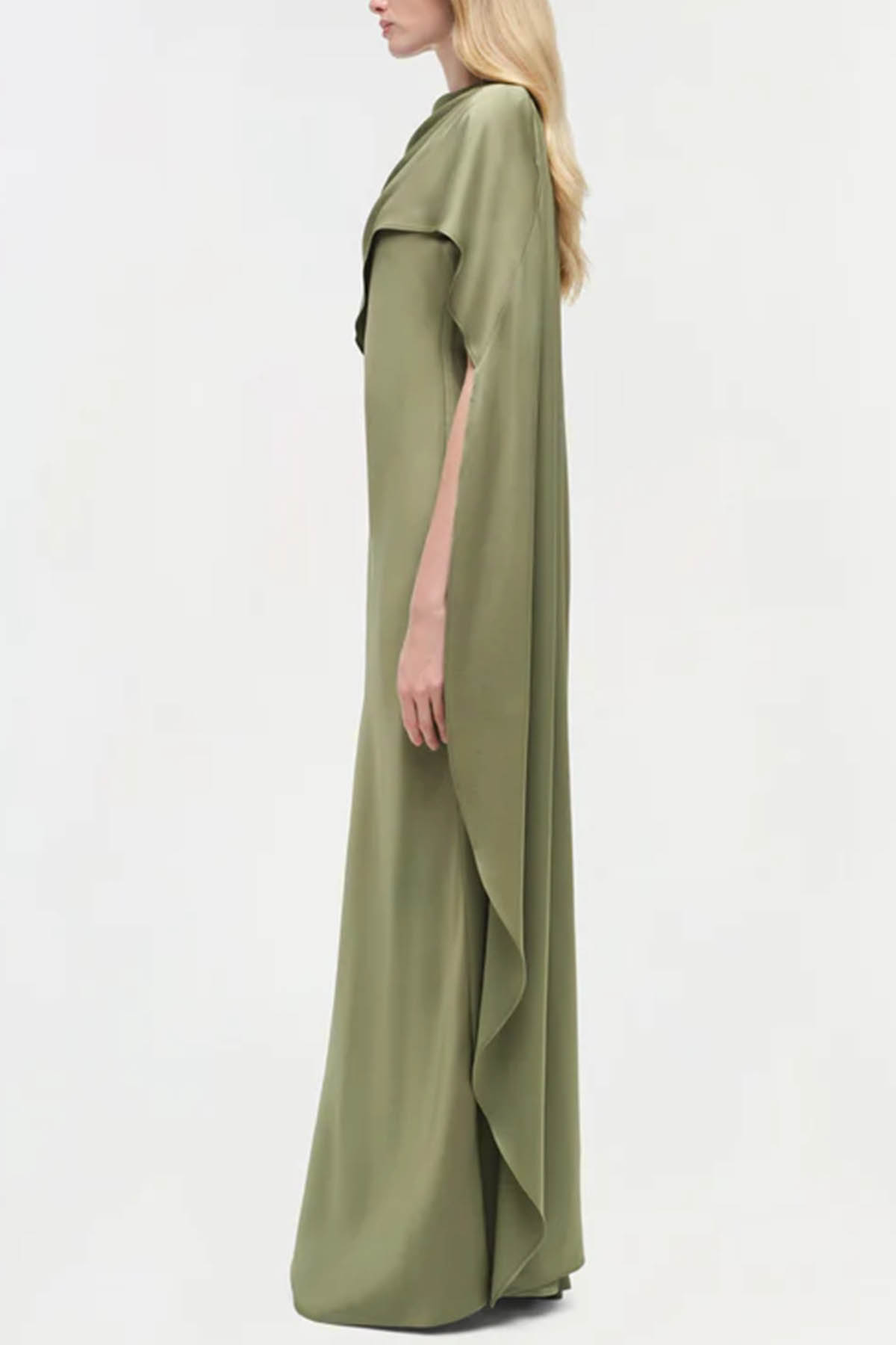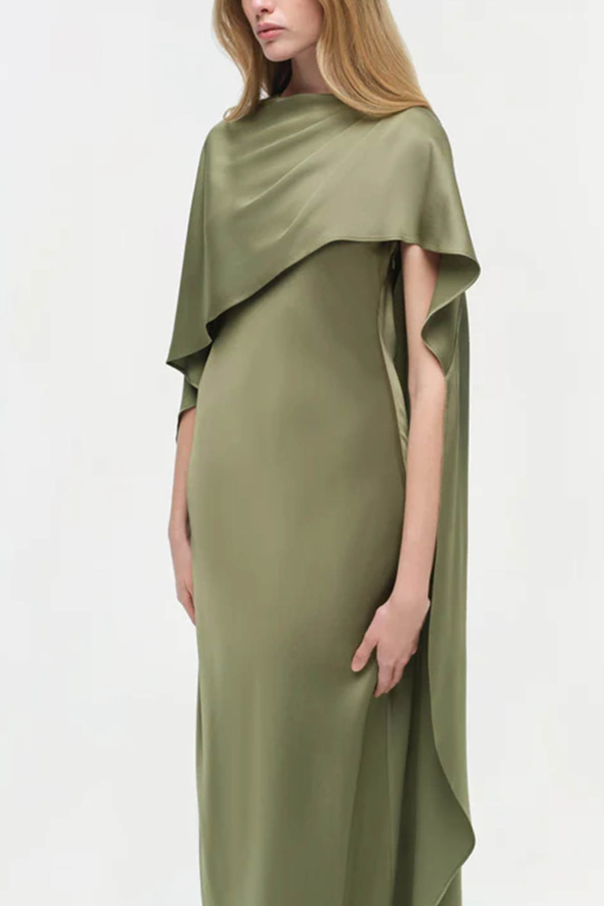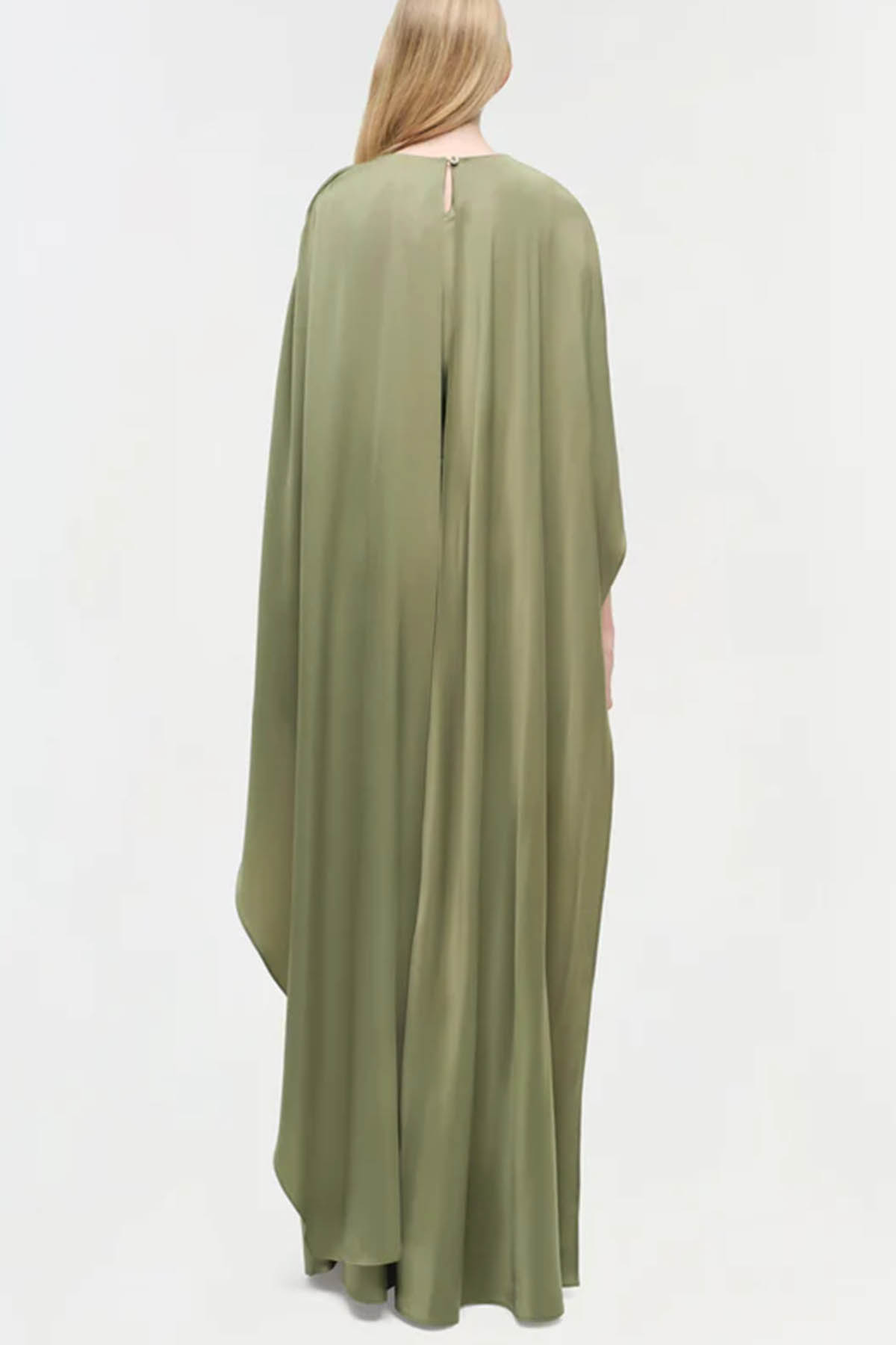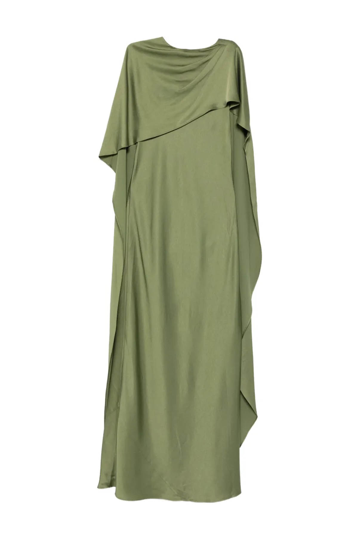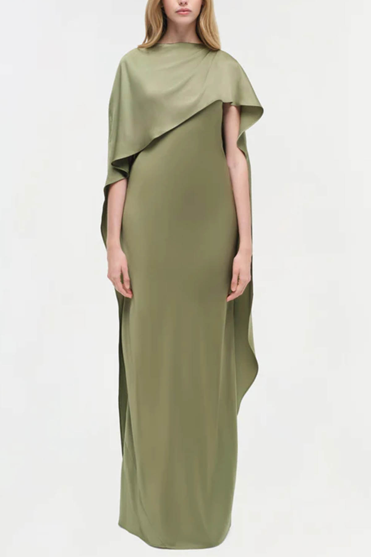 Featuring a cape detail, a back button closure, a draped detail, an asymmetrical hem, short sleeves, a crew neck, a built-in cape, and a long design.