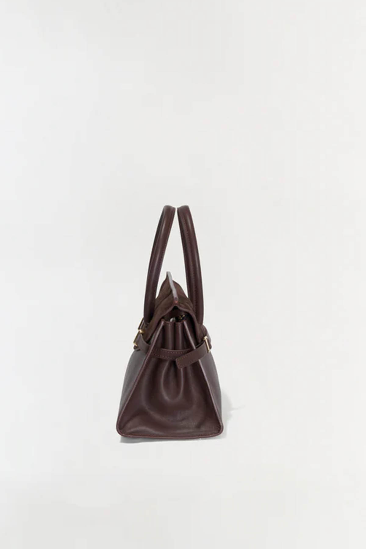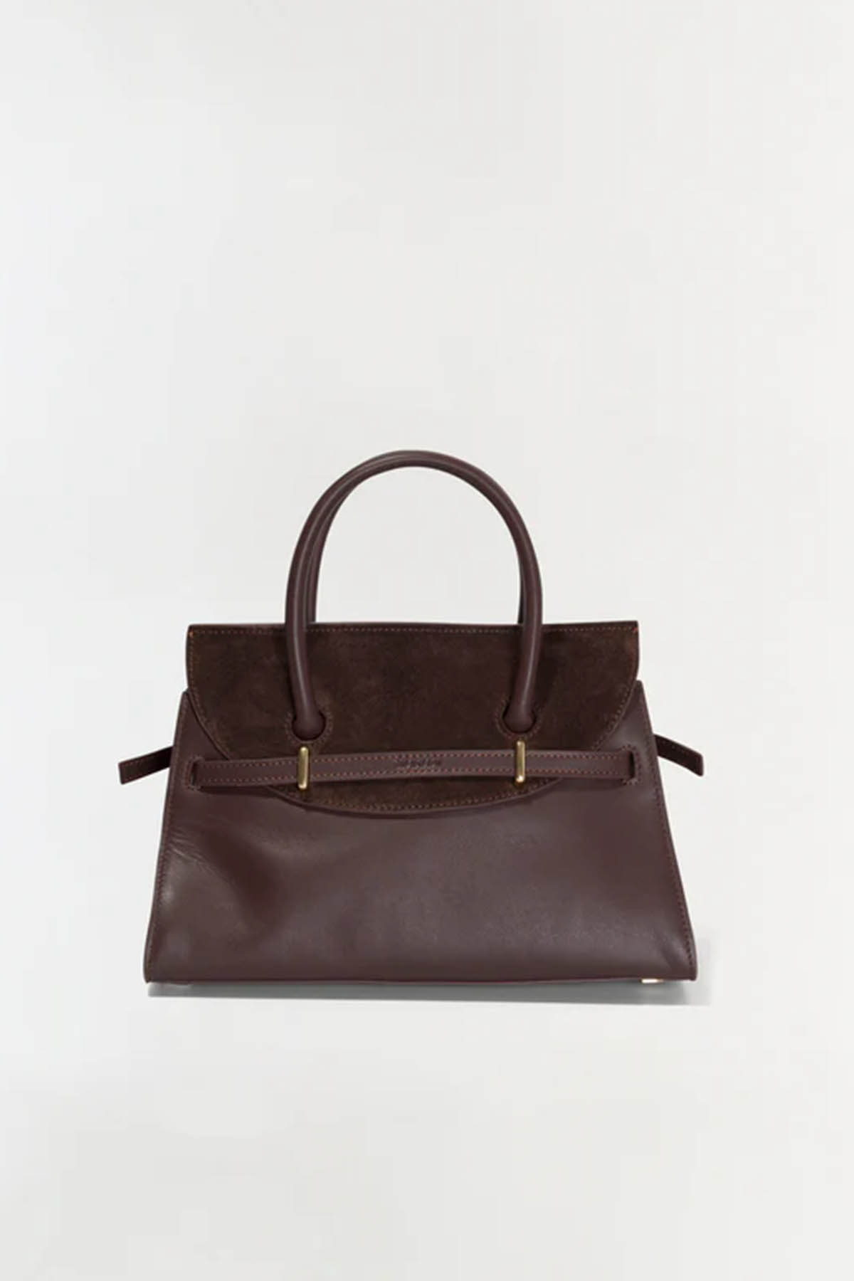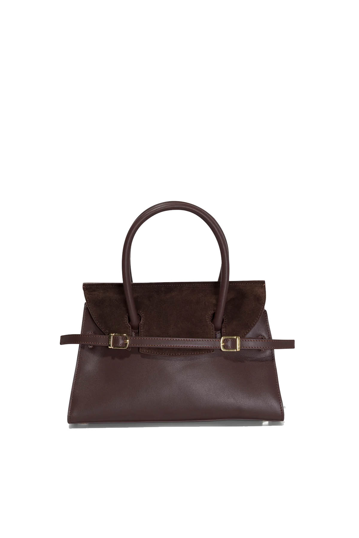 Model with suede insert, handles, gold-tone details, and buckle detail.