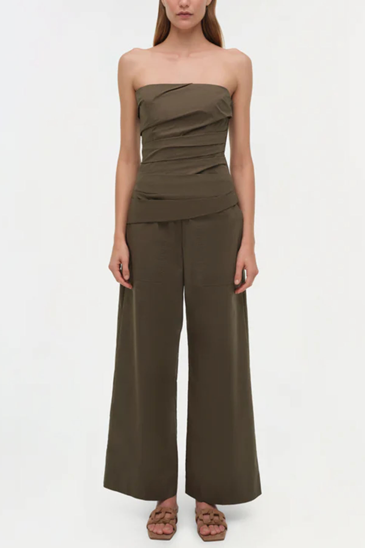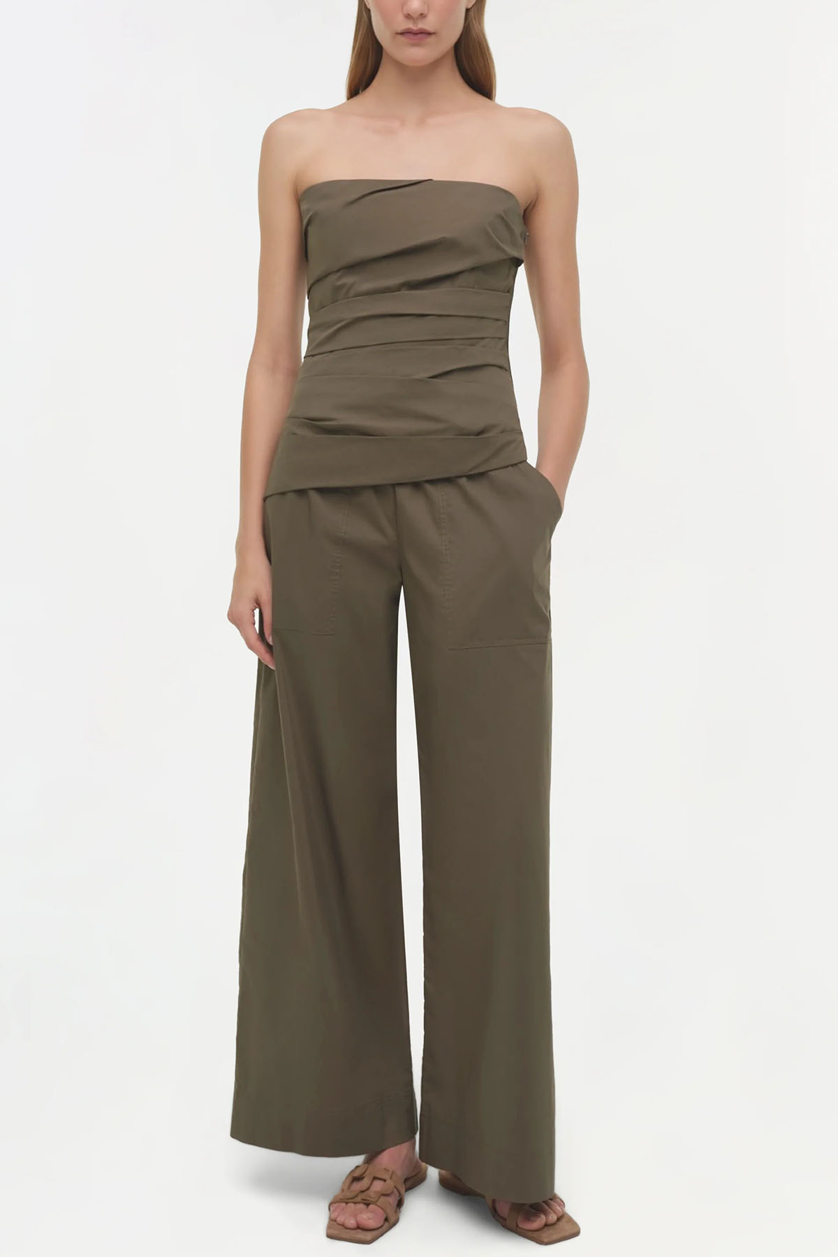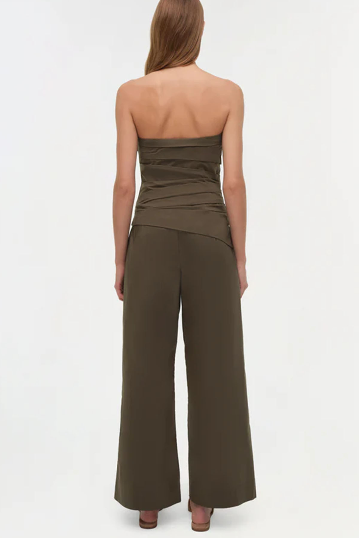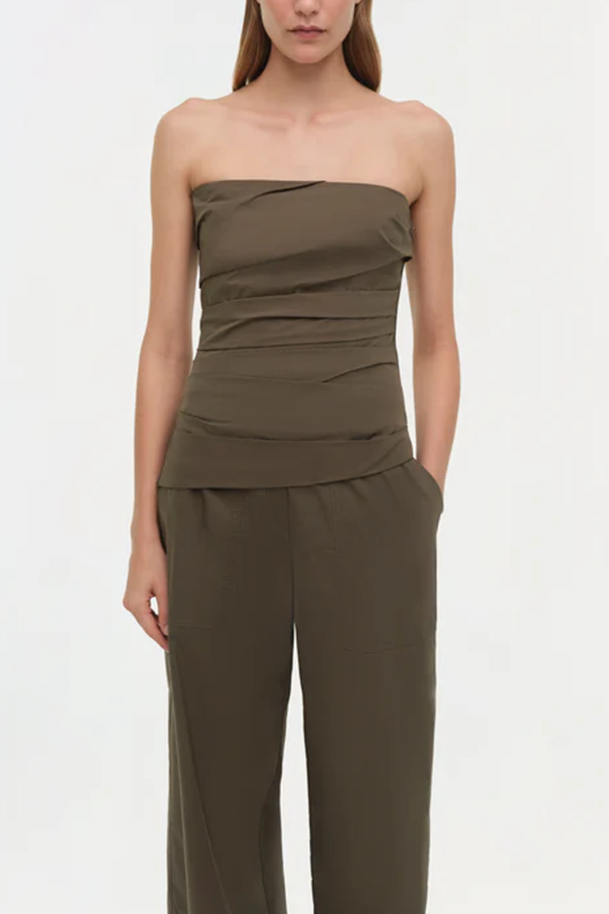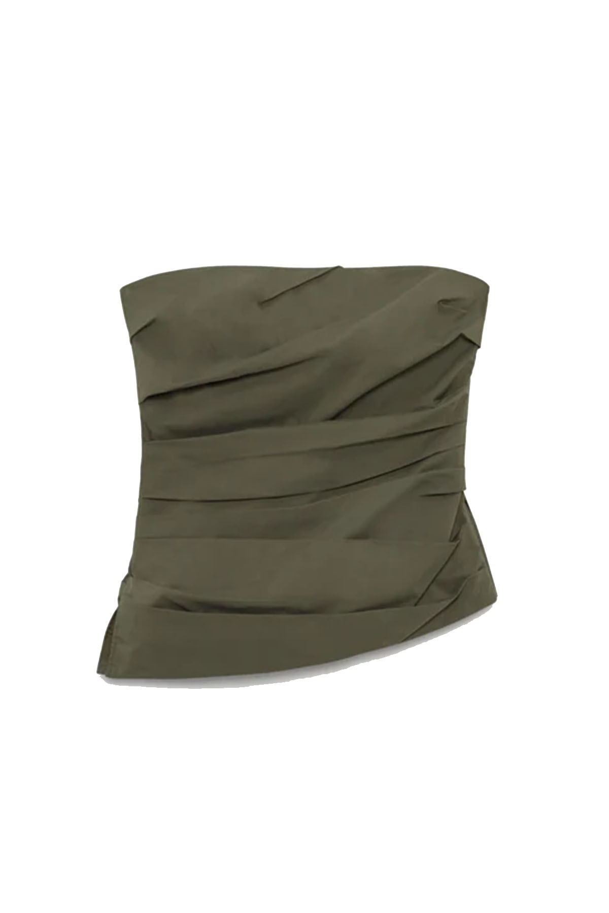 Military green top made of fresh cotton poplin, designed with soft angled pleats that create a structured and sculpted fit on the bust. Internal boning provides discreet support. Adjustable and removable thin shoulder straps.