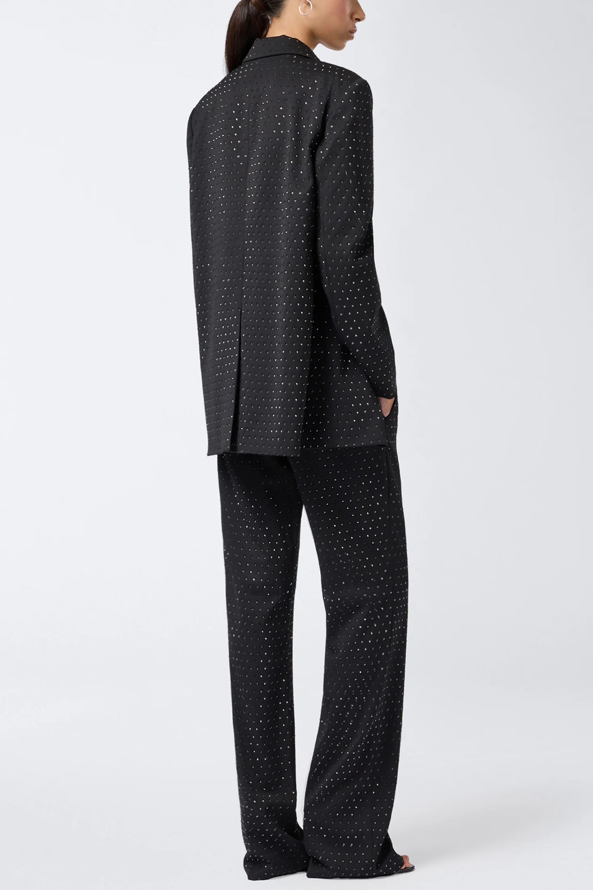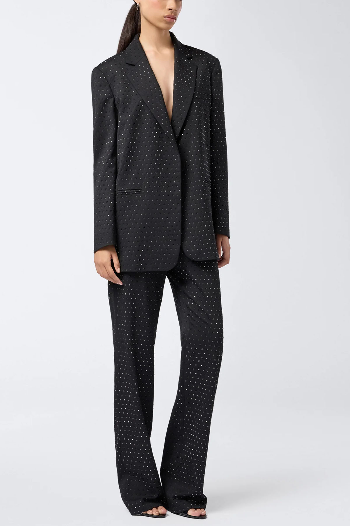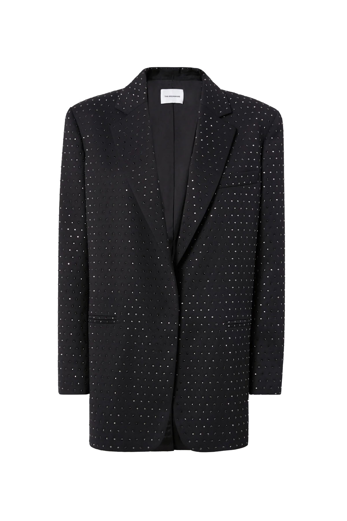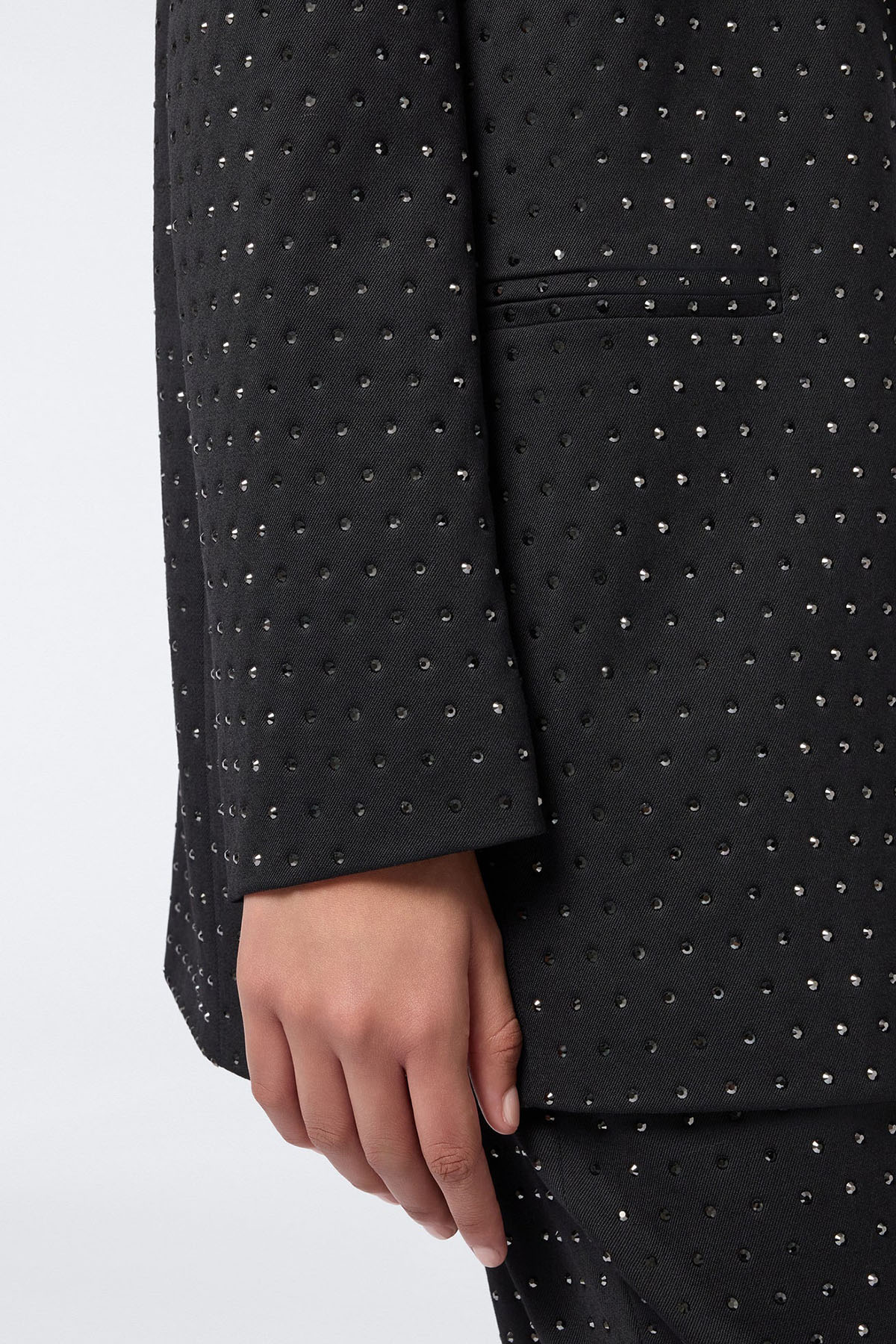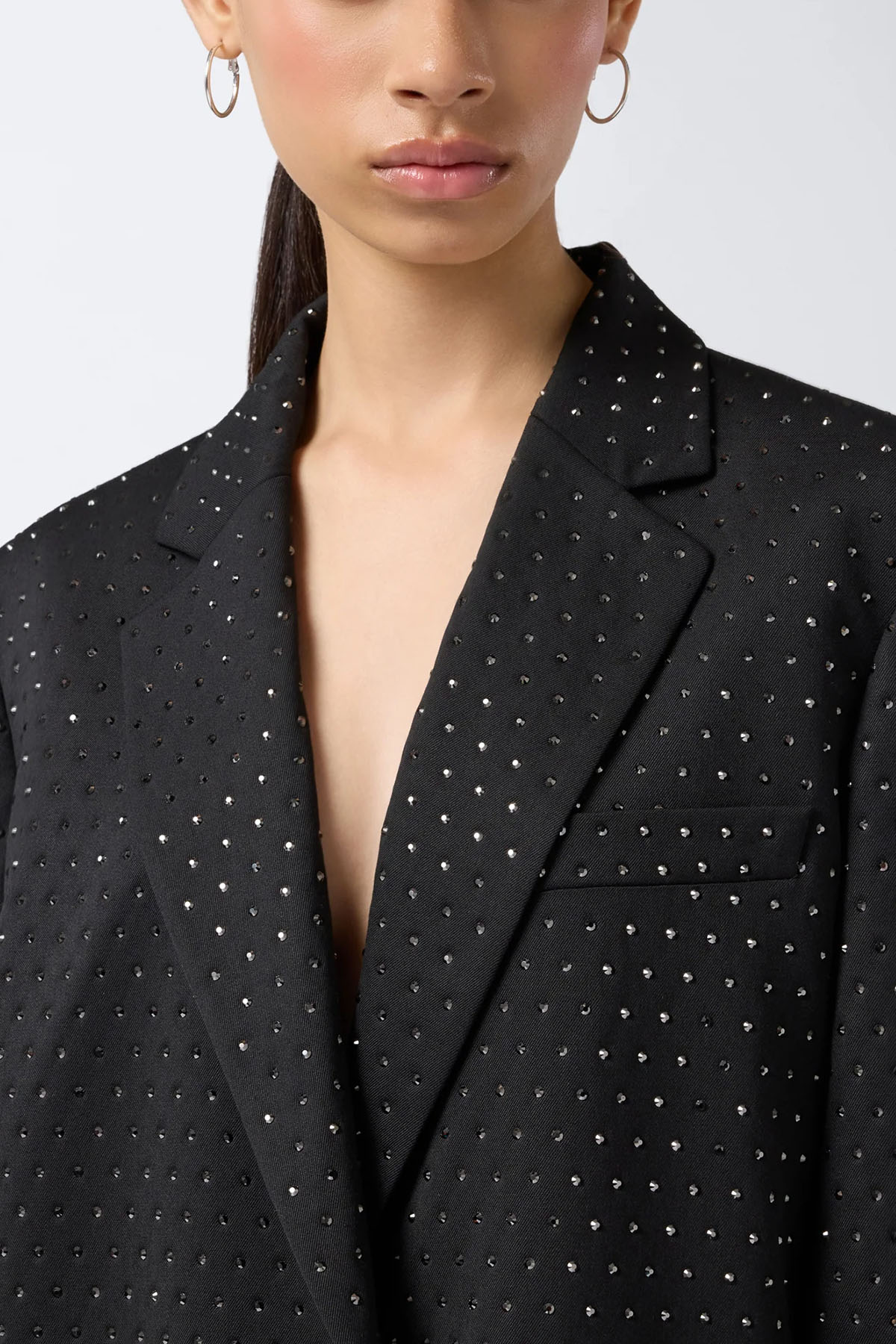 This oversized blazer is crafted from a black wool and gabardine blend with a loose silhouette, featuring peak lapels and padded shoulders, a single-breasted closure, two welt pockets at the waist, and a welt pocket at the chest.