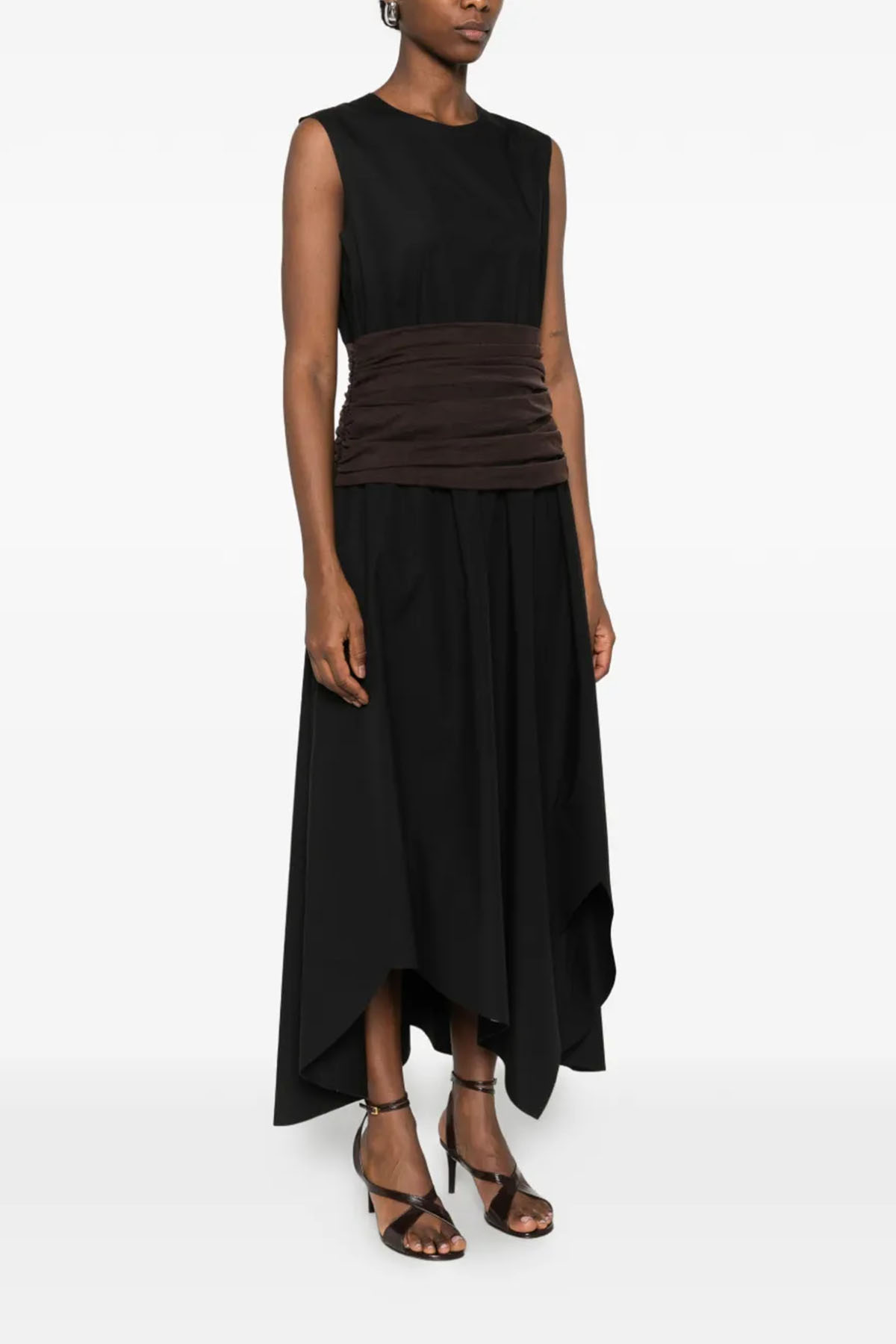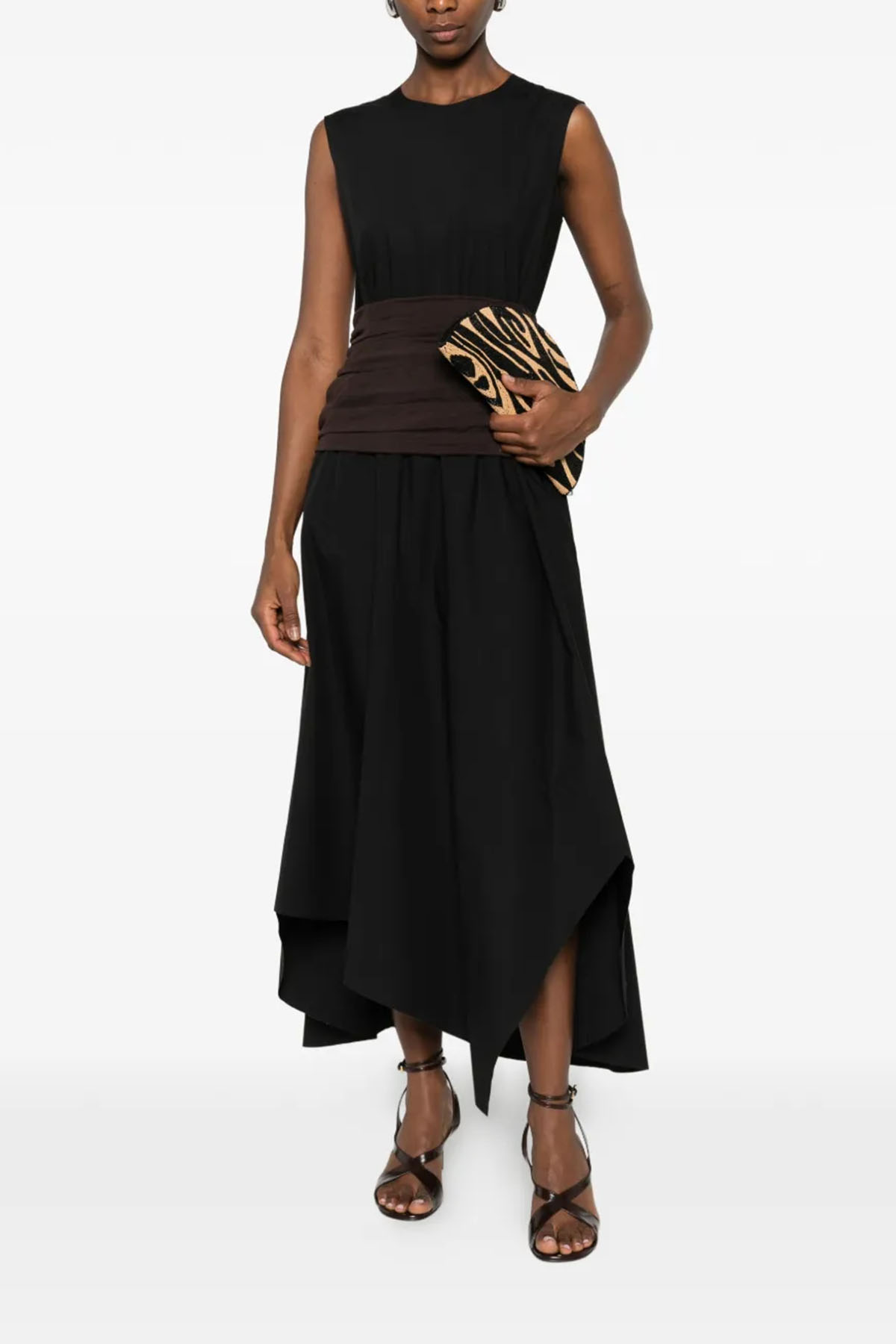 Crew neck, sleeveless dress, hidden back zip closure, contrasting fabric and color insert at the waist, asymmetrical hem.