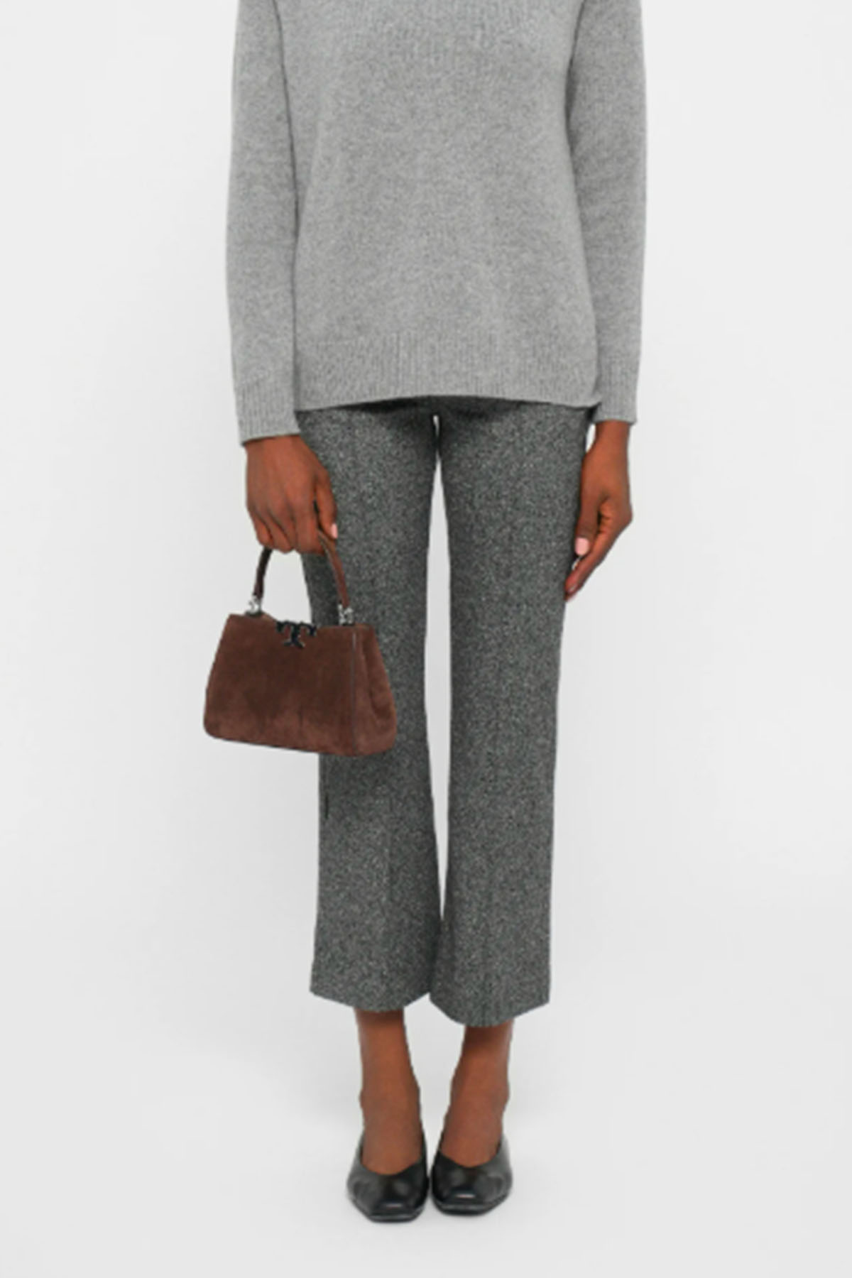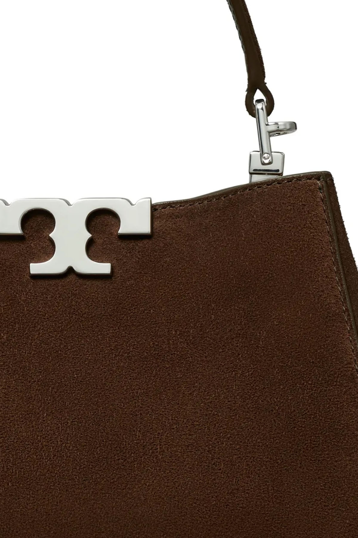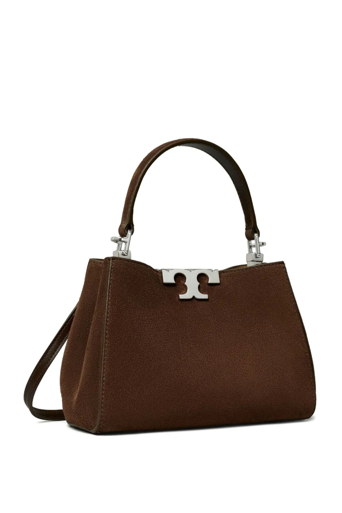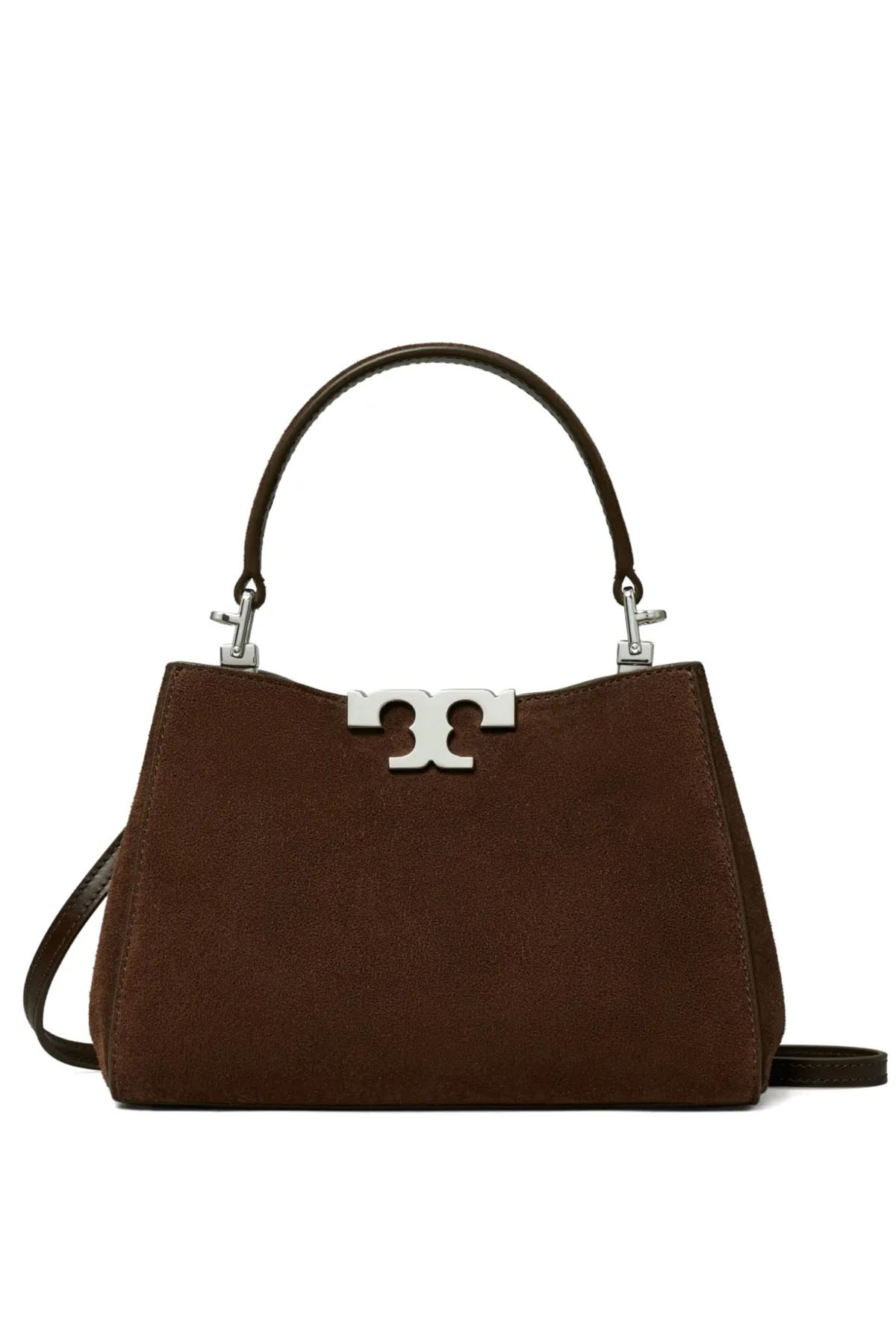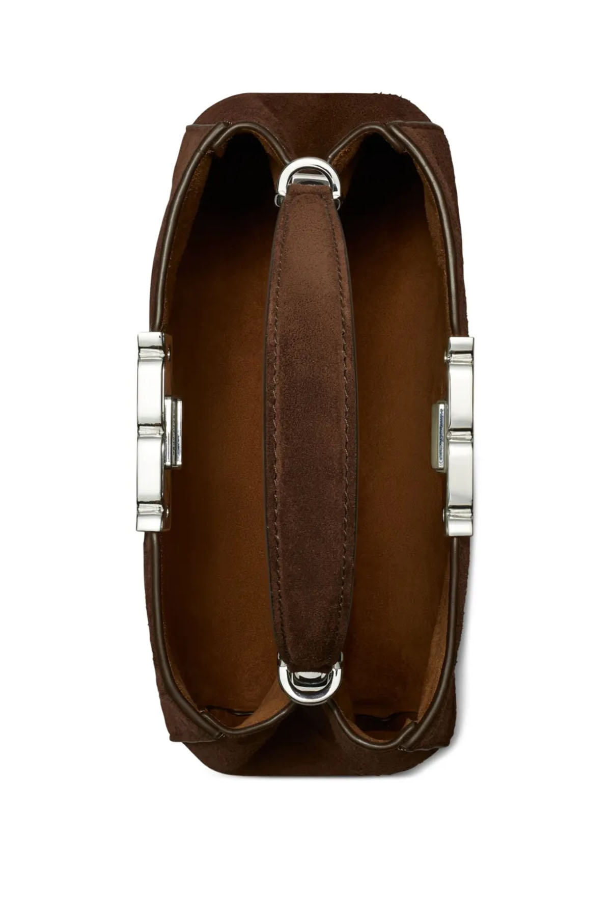 Suede model; calfskin finish, suede lining, magnetic closure, 10.5 cm top handle, adjustable and removable 56.5 cm shoulder strap, center divider, two internal card slots, metal feet. Protective dust bag included.
