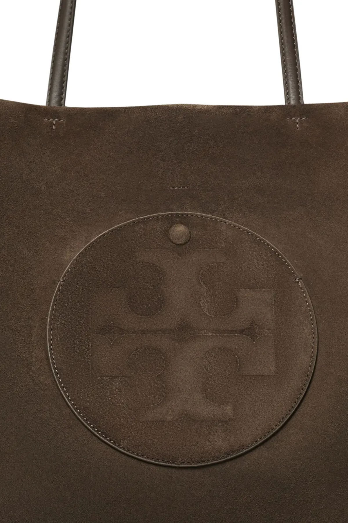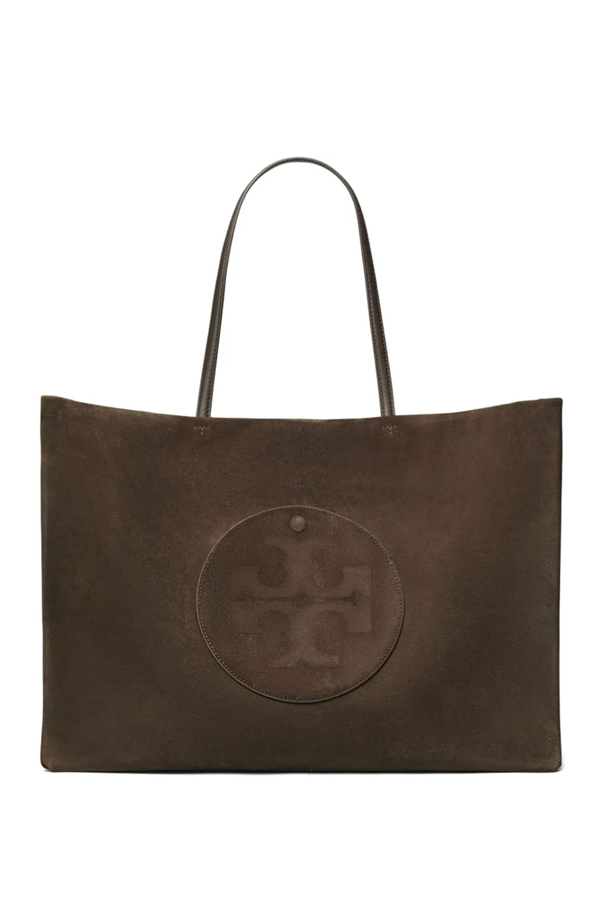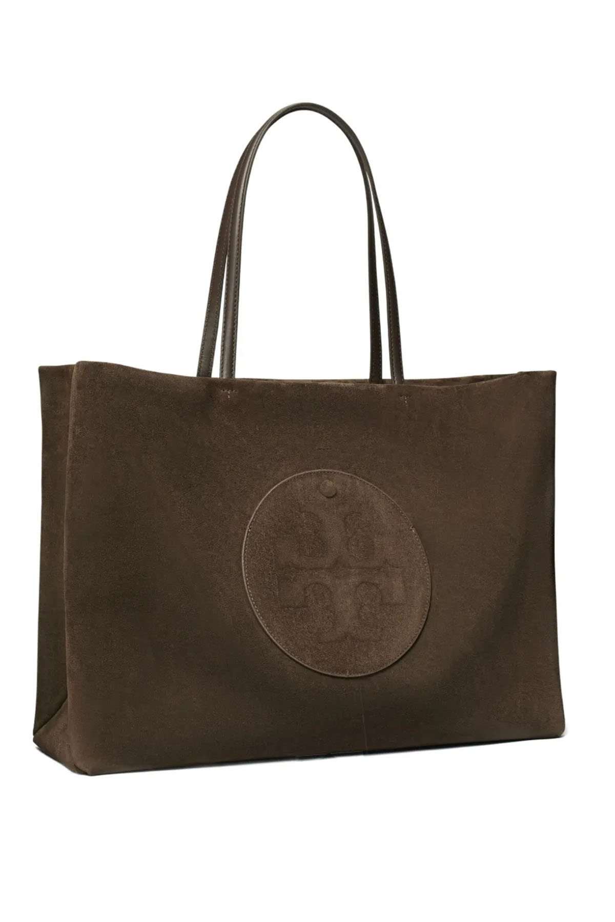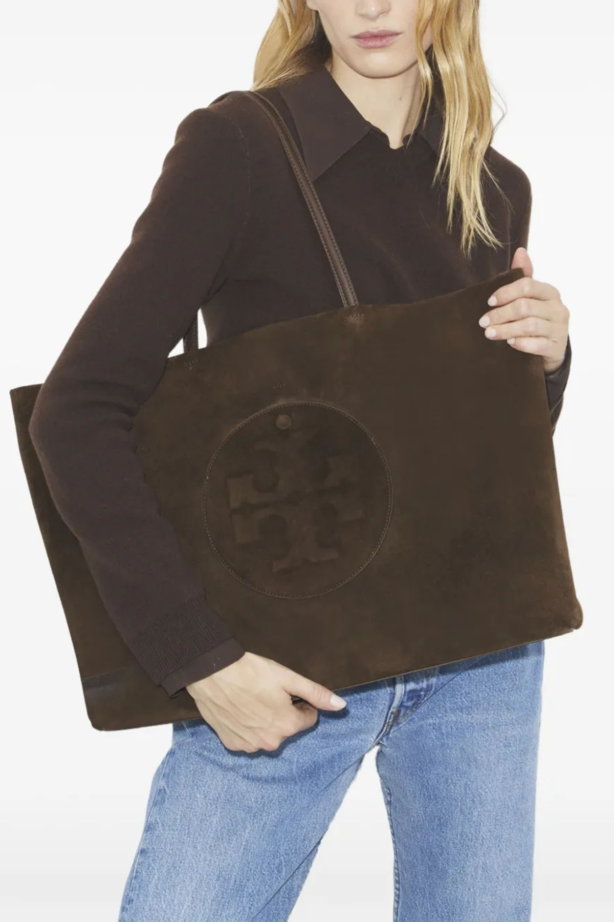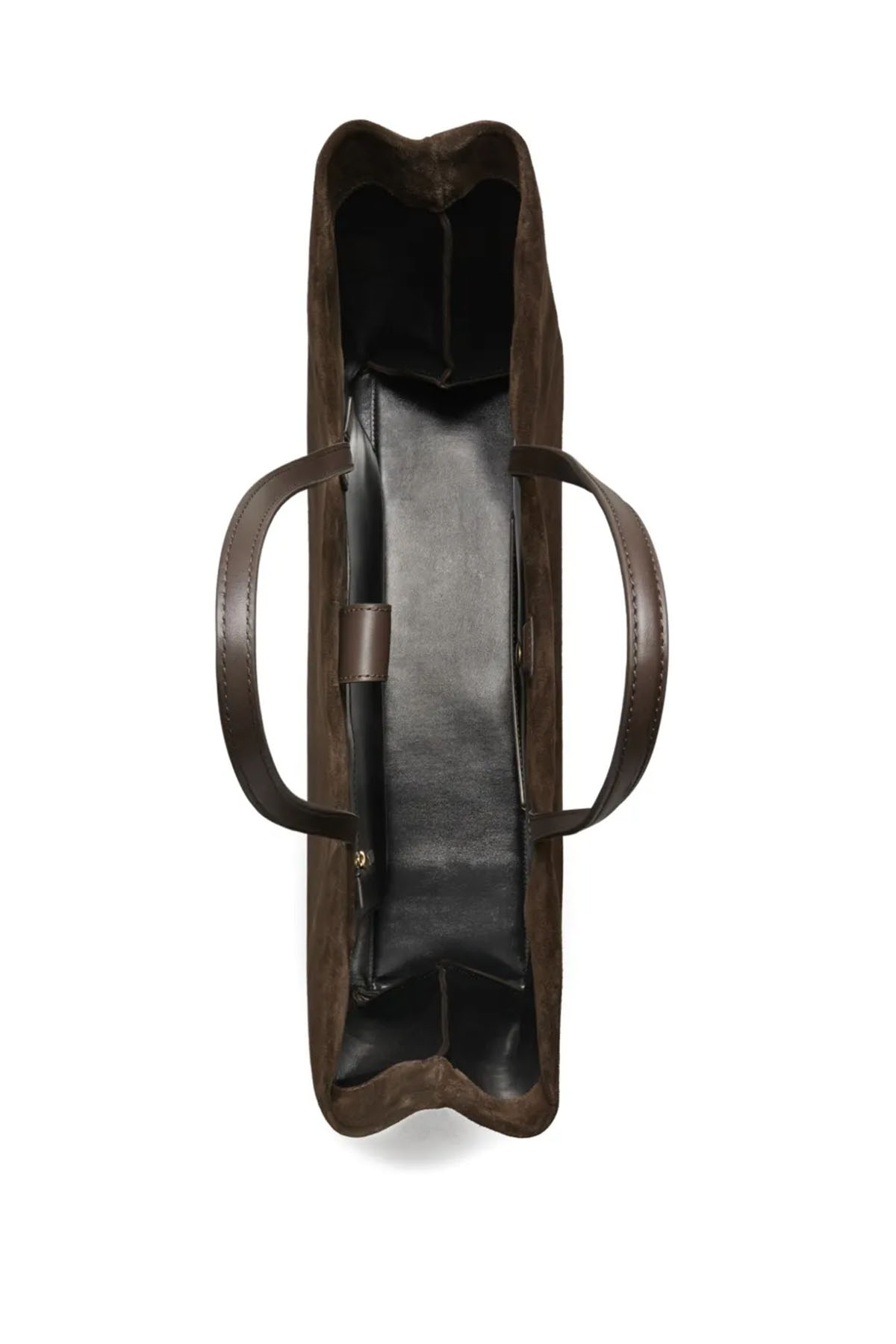 Suede style; leather trim, bridge with hidden magnetic snap closure, 25 cm top handles, one hidden exterior pocket with logo patch, one interior front slit pocket, one interior back zipper pocket. Dust bag included.