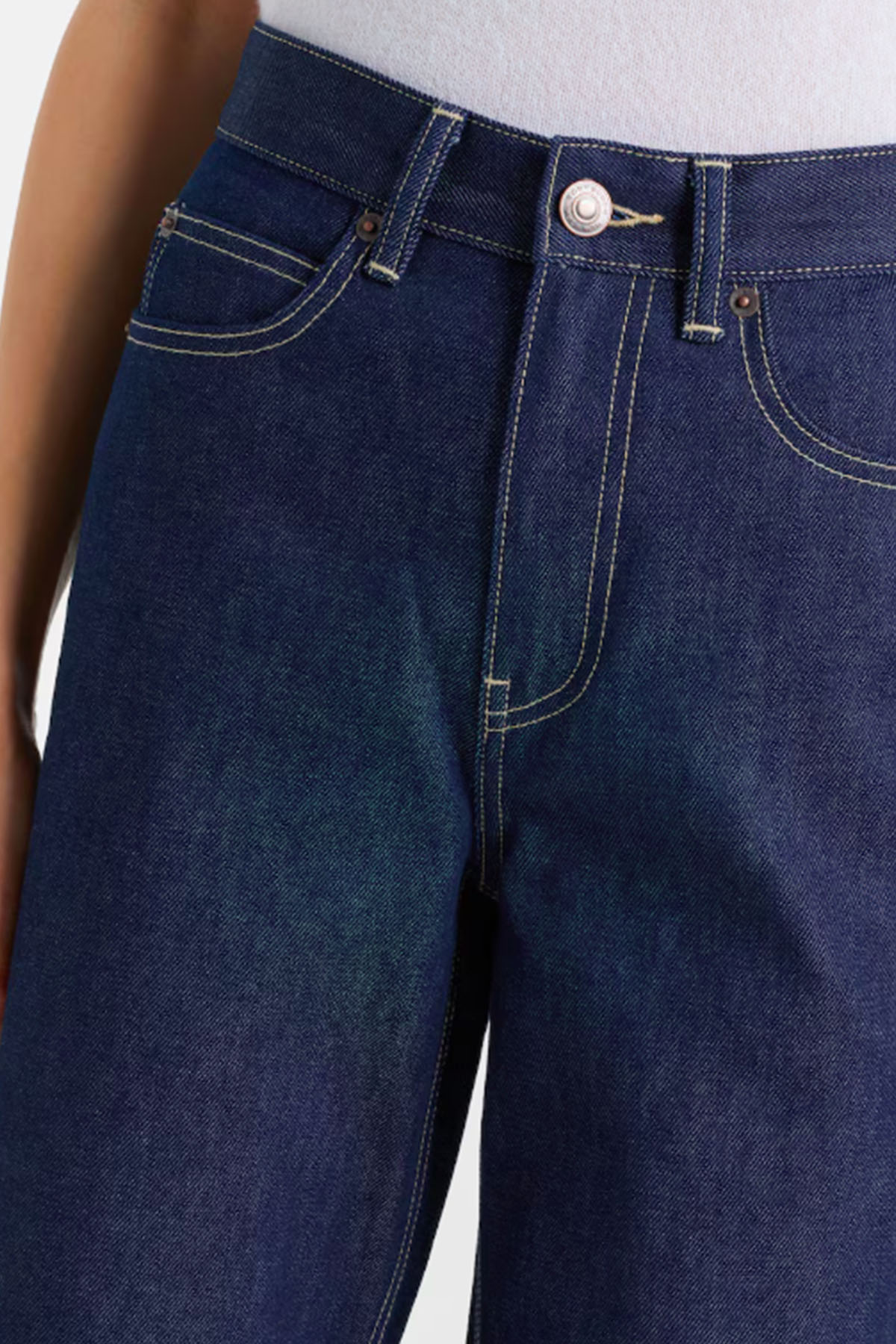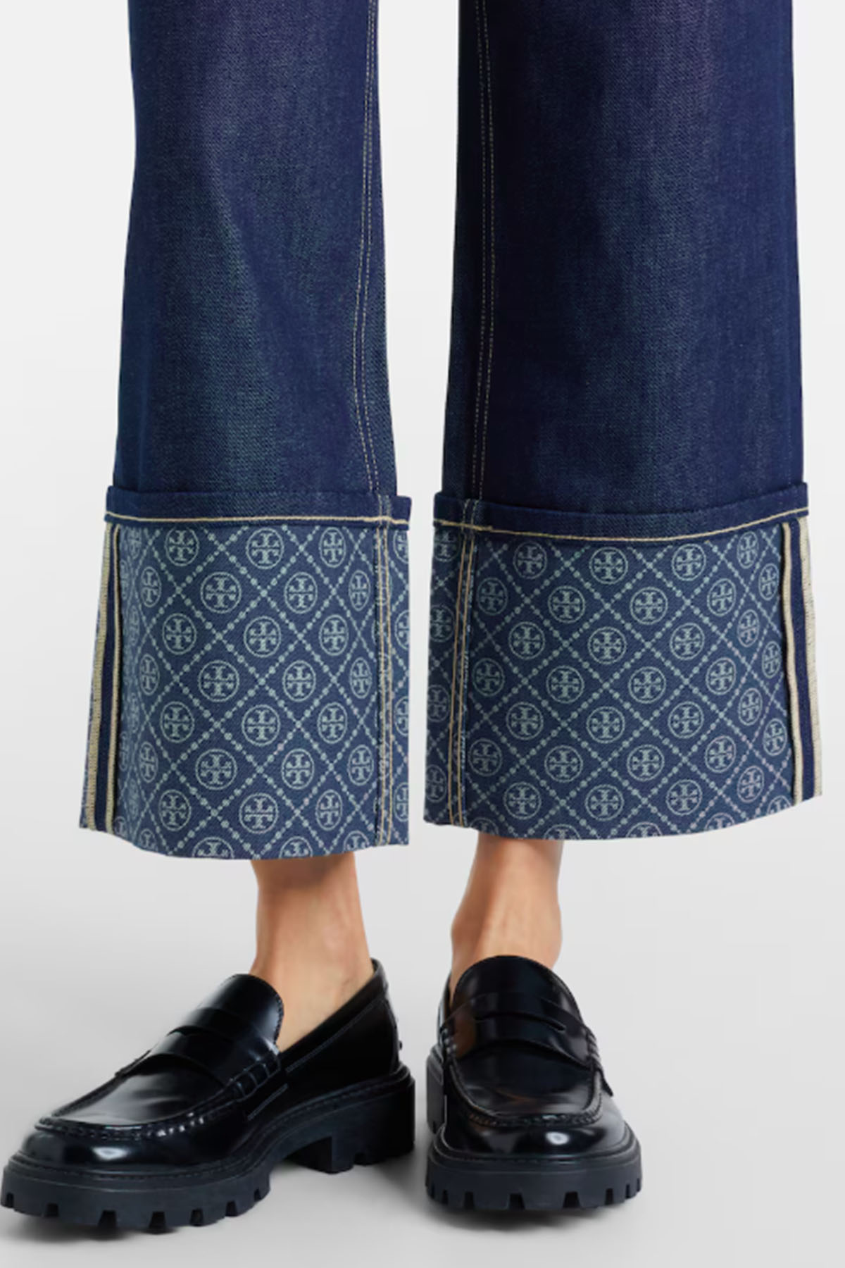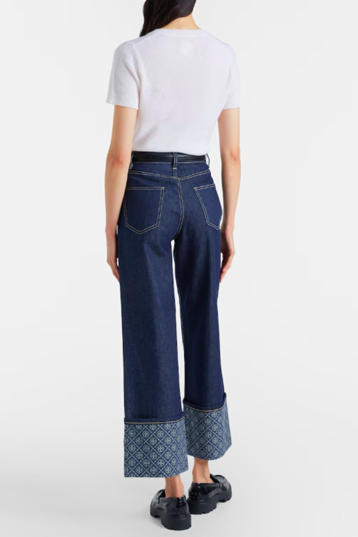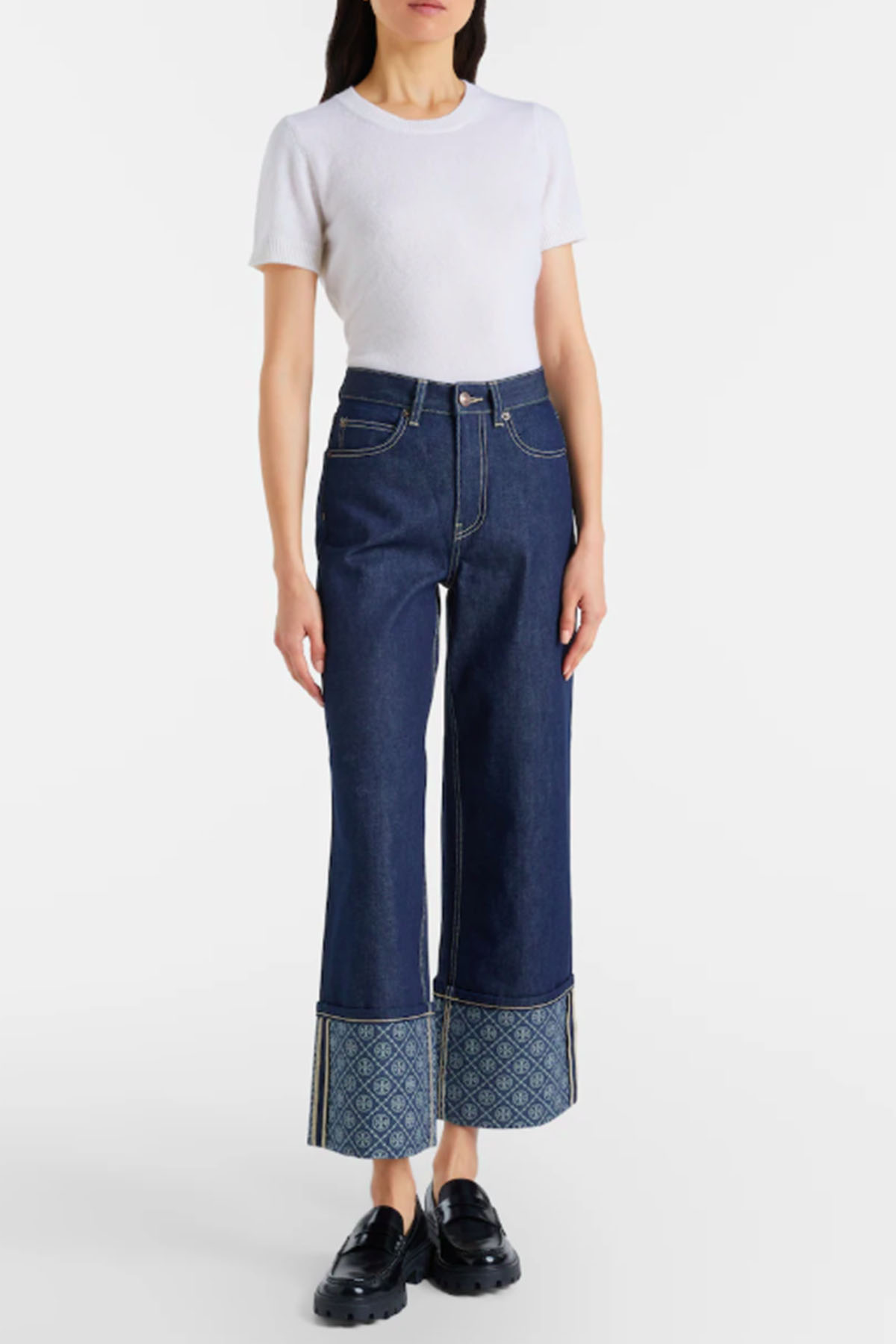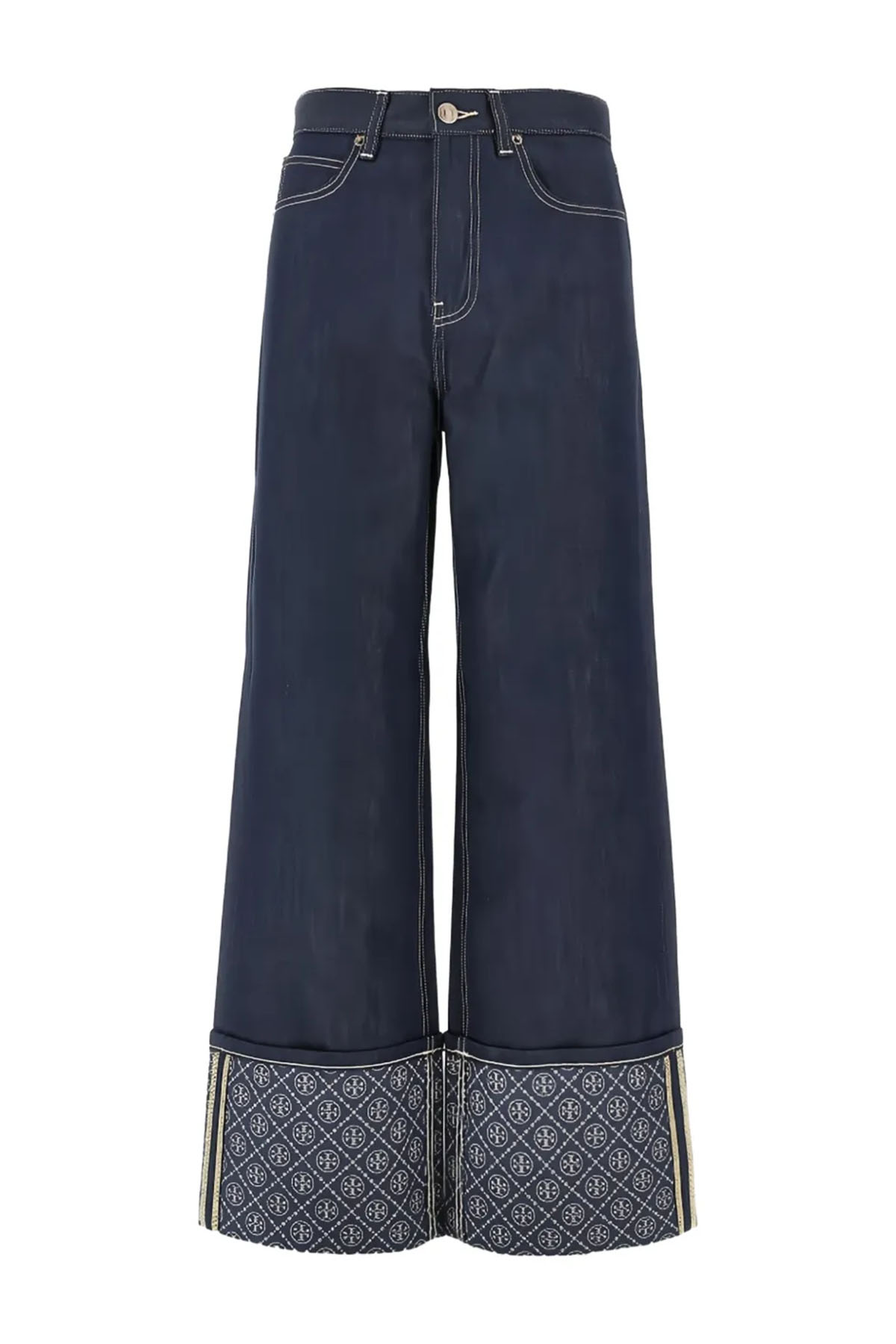Blue model, contrasting stitching, patterned cuffs, five pockets, belt loops, button and zip closure.