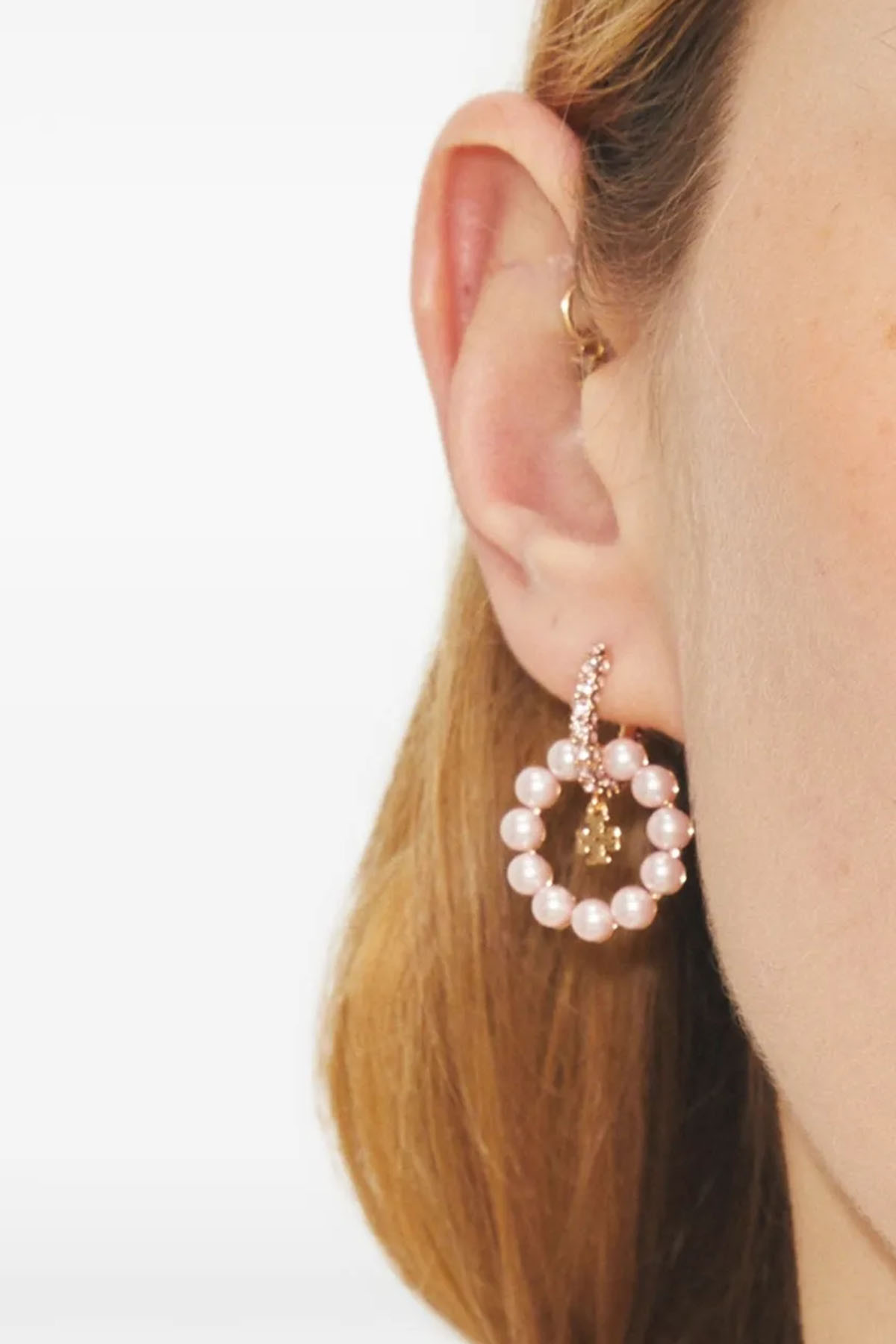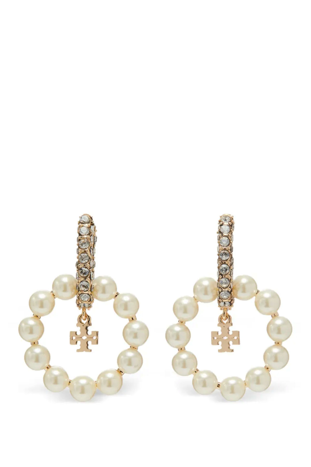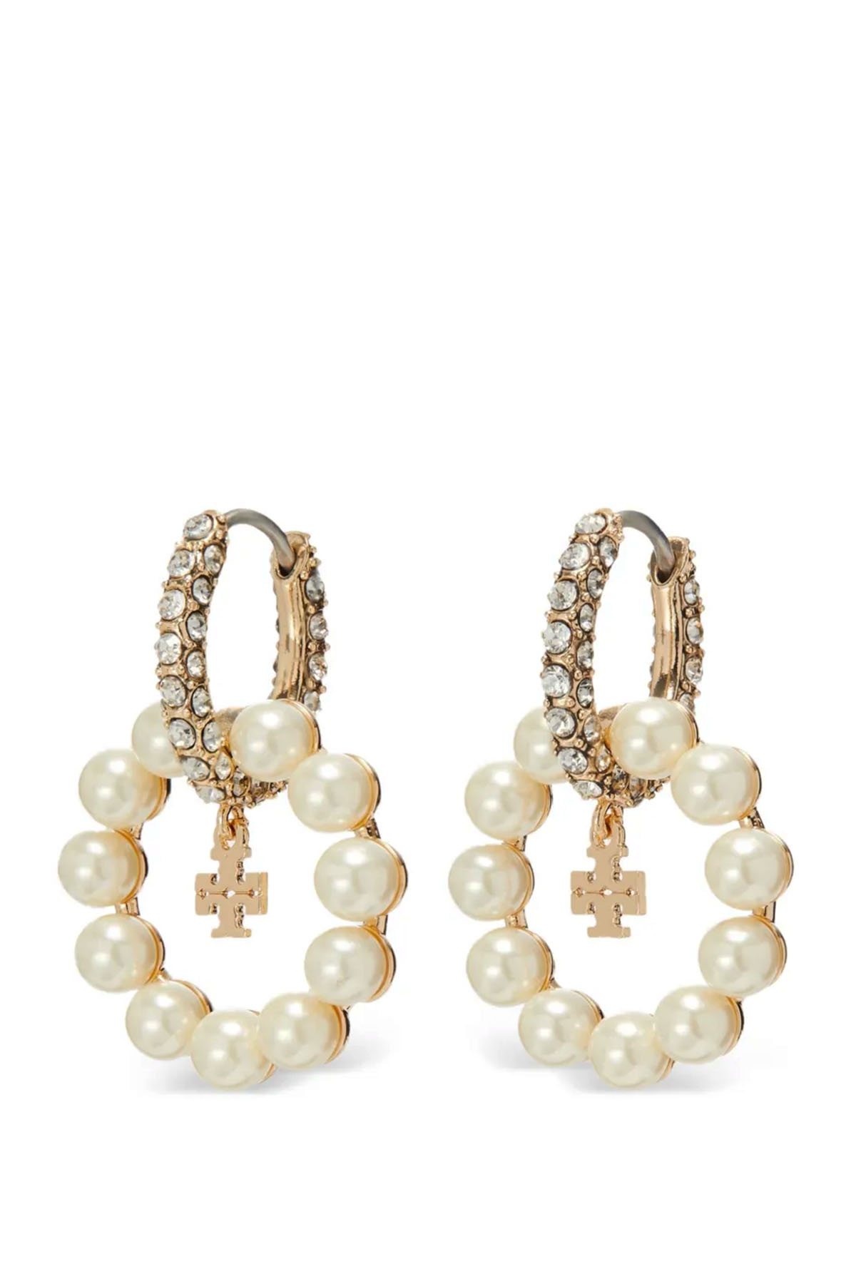 Earrings with intertwined crystal and colored pearl hoops, finished with a small double-T pendant.