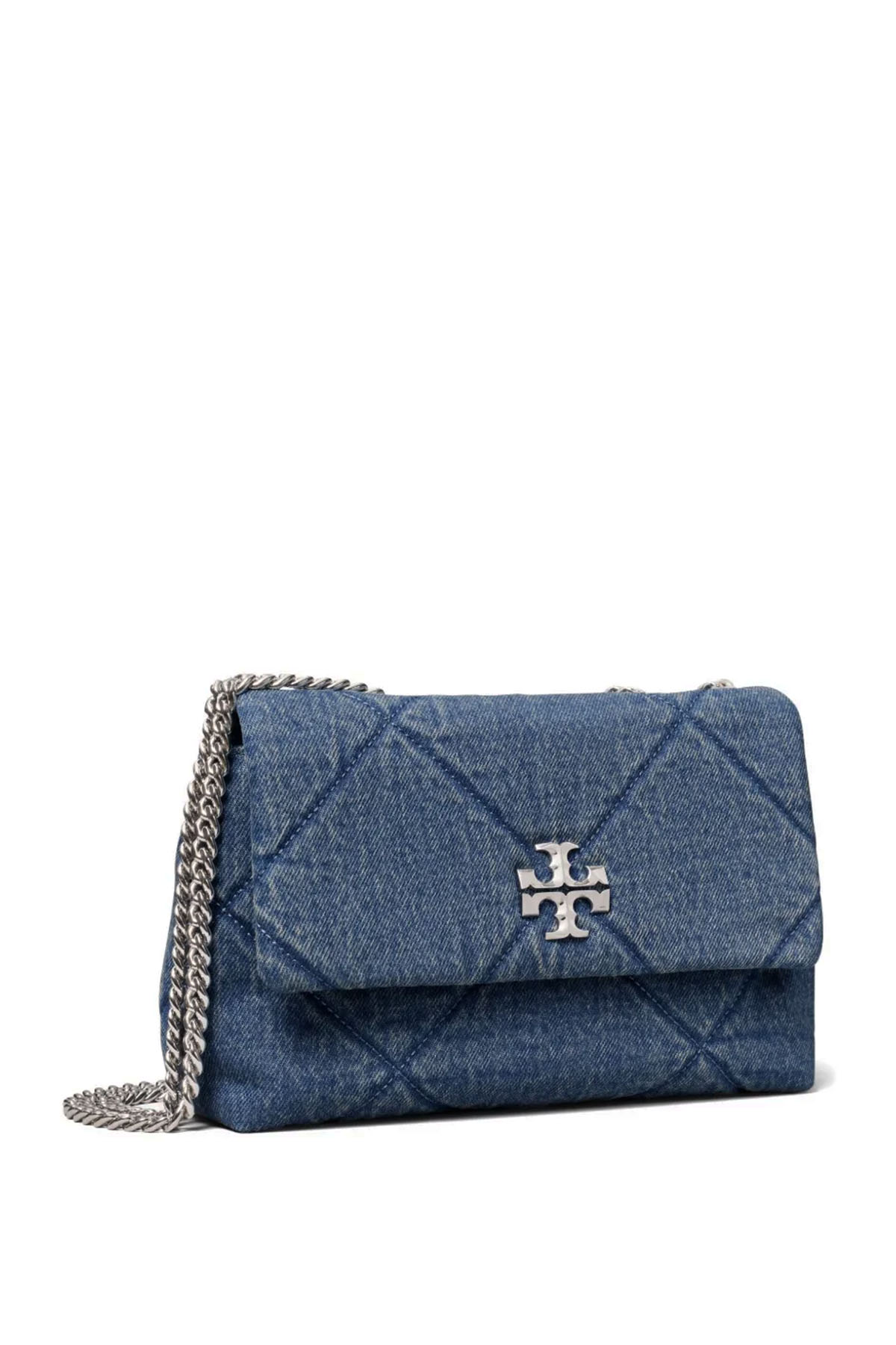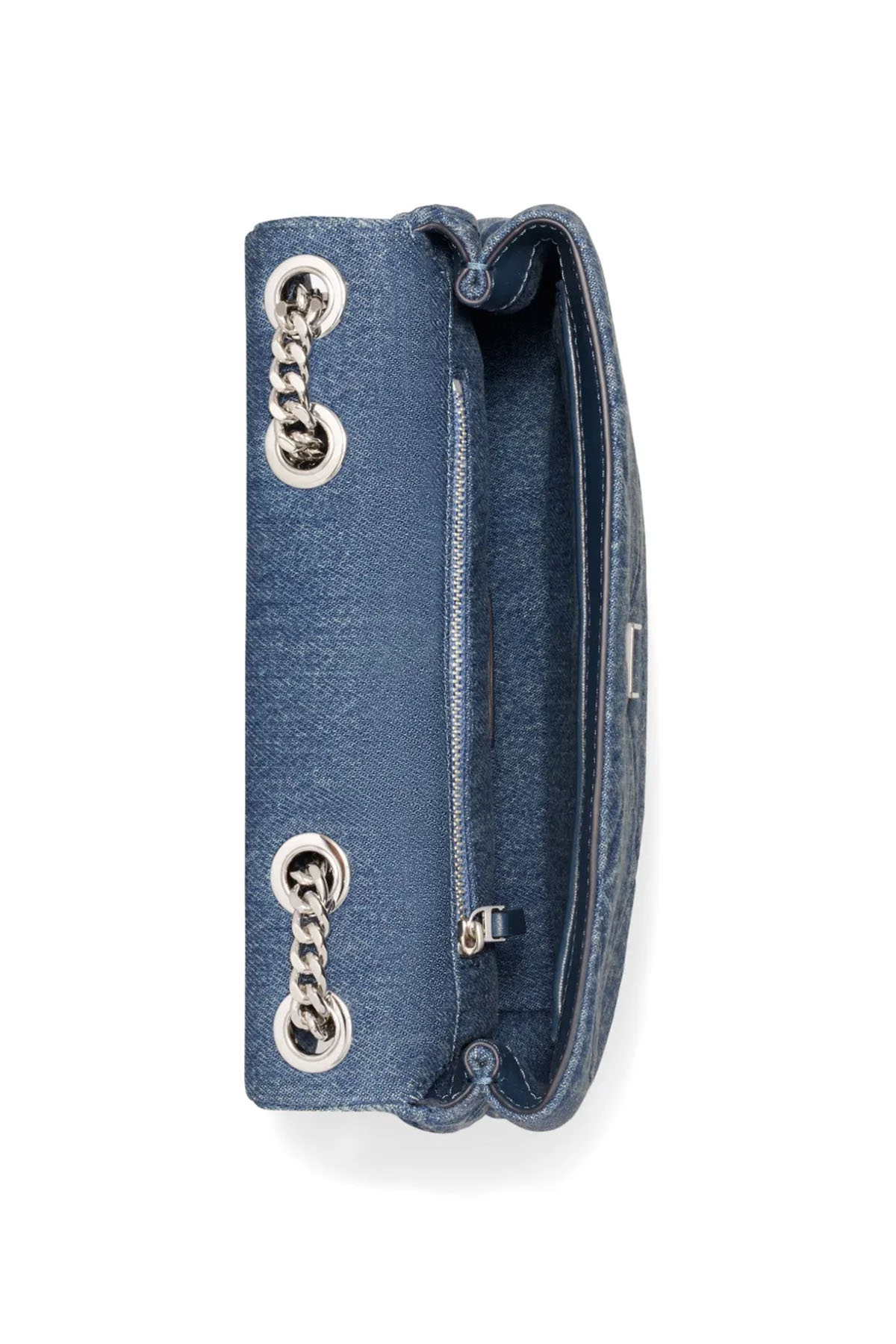 Cotton denim bag, nappa finish, Flap with magnetic closure, 56.5 cm convertible chain shoulder strap; shoulder insert for added comfort, One interior front pocket, one interior zip pocket, Quilted finish. Protective dust bag included.