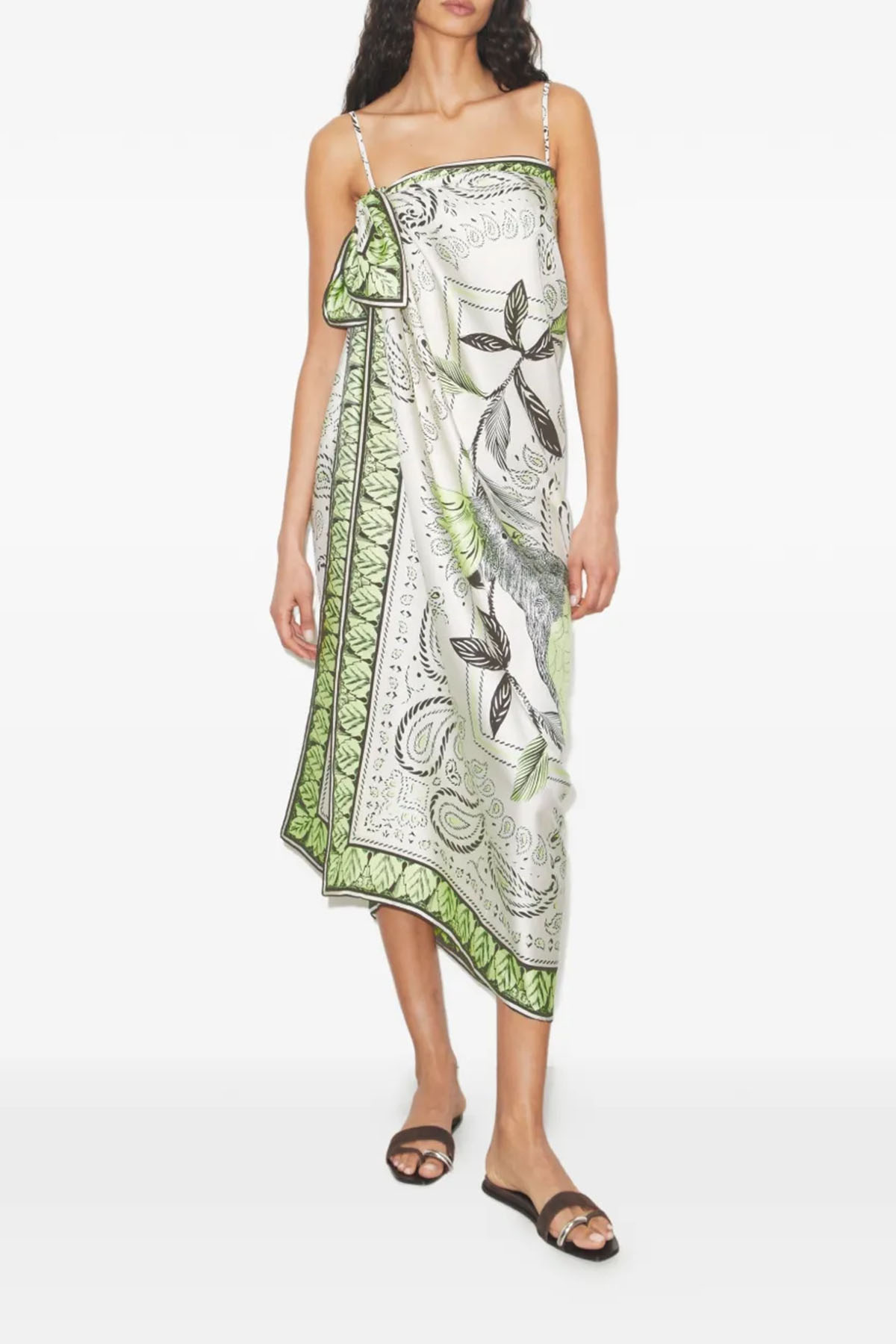 100% silk twill scarf, reversible, graphic print on both sides, hand-rolled hem. Can be worn as a scarf or as a sarong dress/skirt.