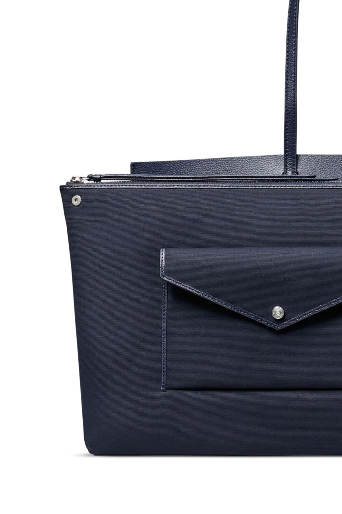 Model with 26 cm handles, removable zip pocket with external front flap pocket and external back pocket, protective bag included, printed logo on the front.