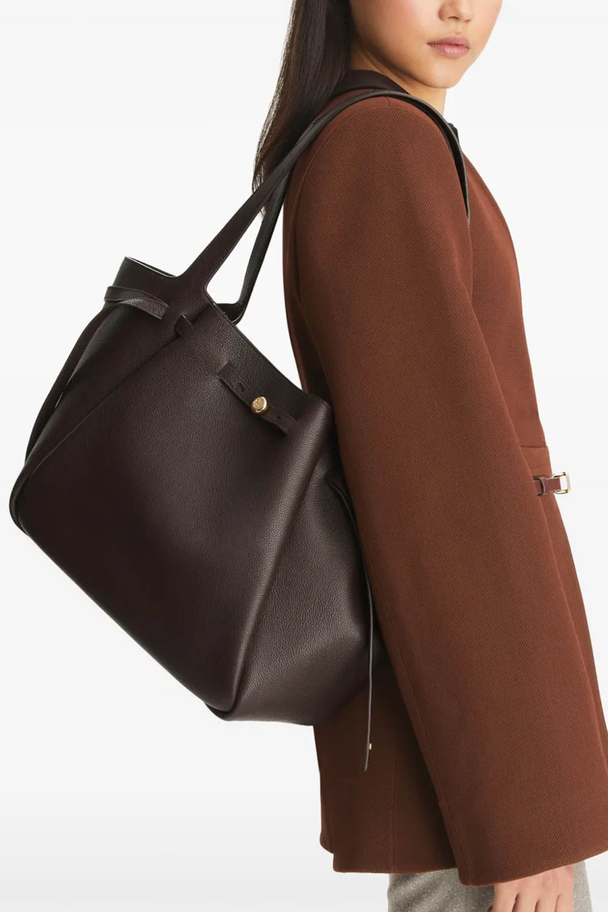 Hammered leather model, magnetic button closure; strap with button closure, top handles drop: 31 cm, internal zip pocket. Protective dust bag included.