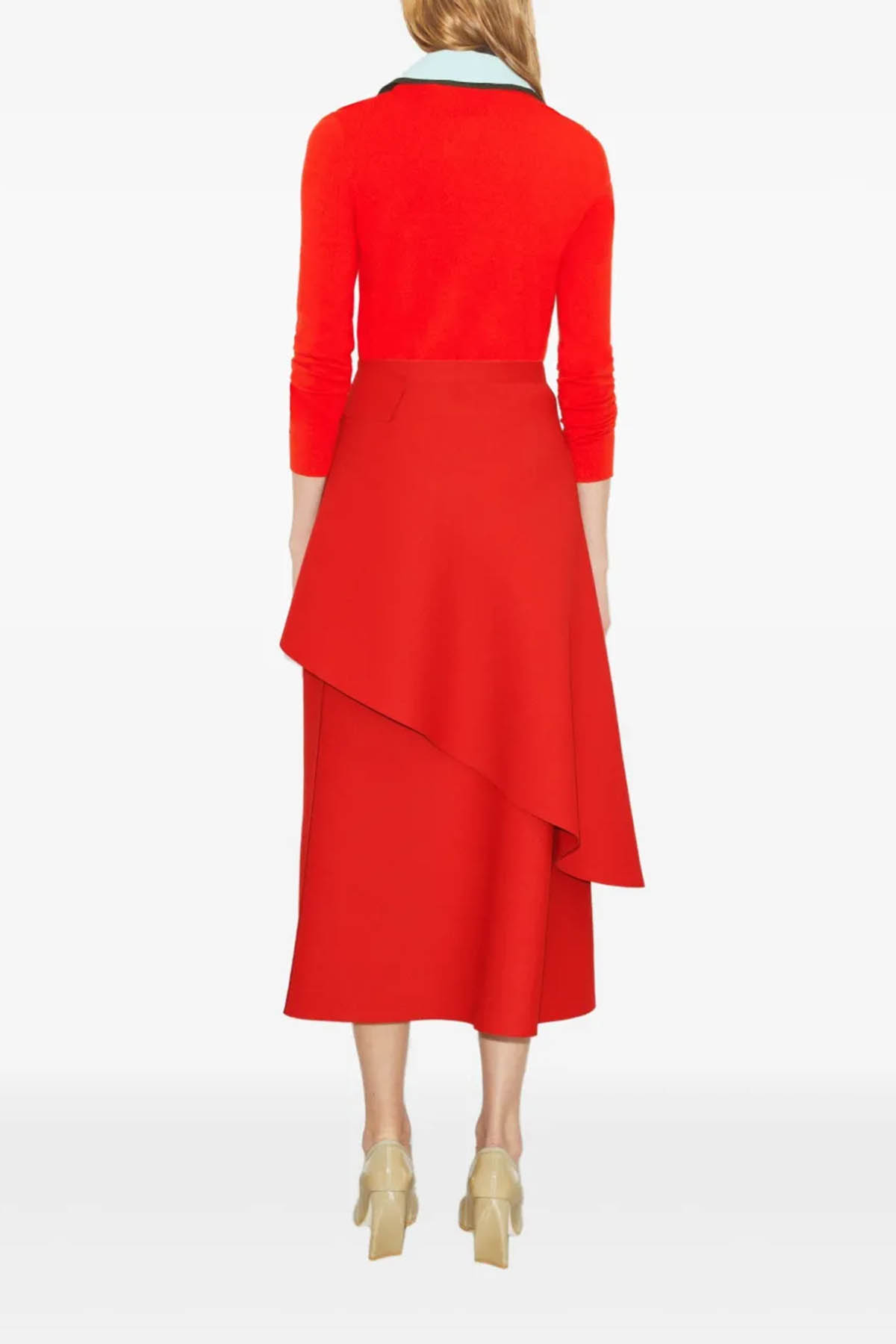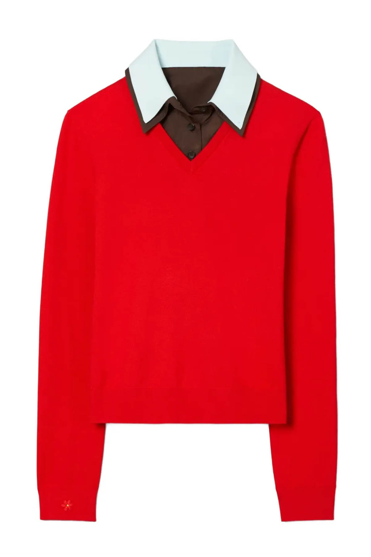 V-neck model with a removable collar, made of ultra-soft merino wool with a slight stretch, removable collar with button closure, and floral embroidery on the right cuff.