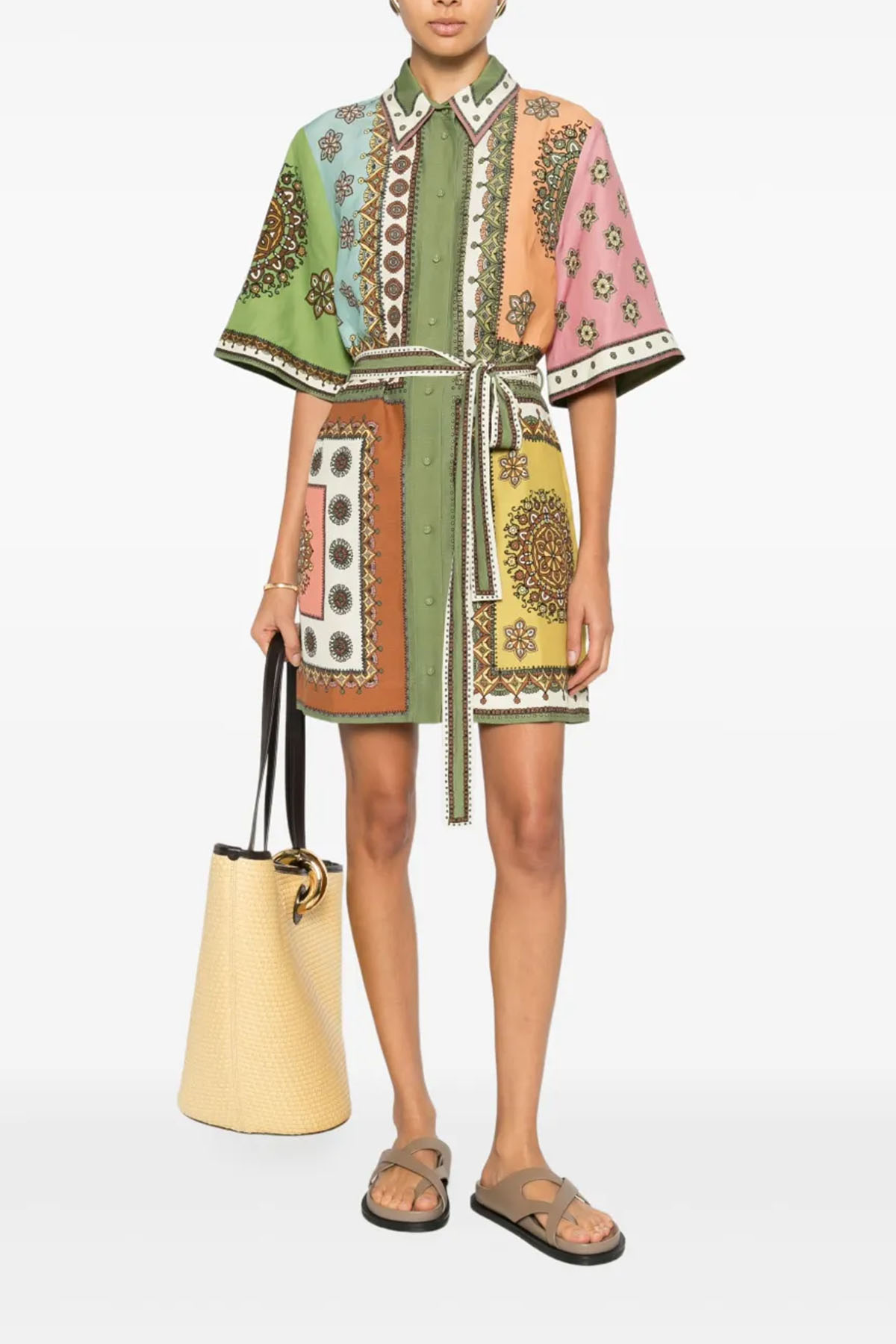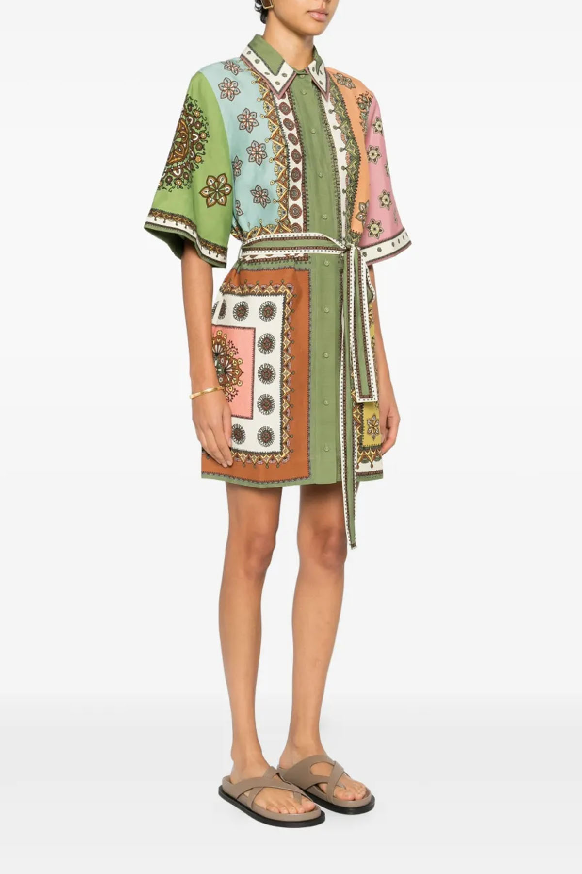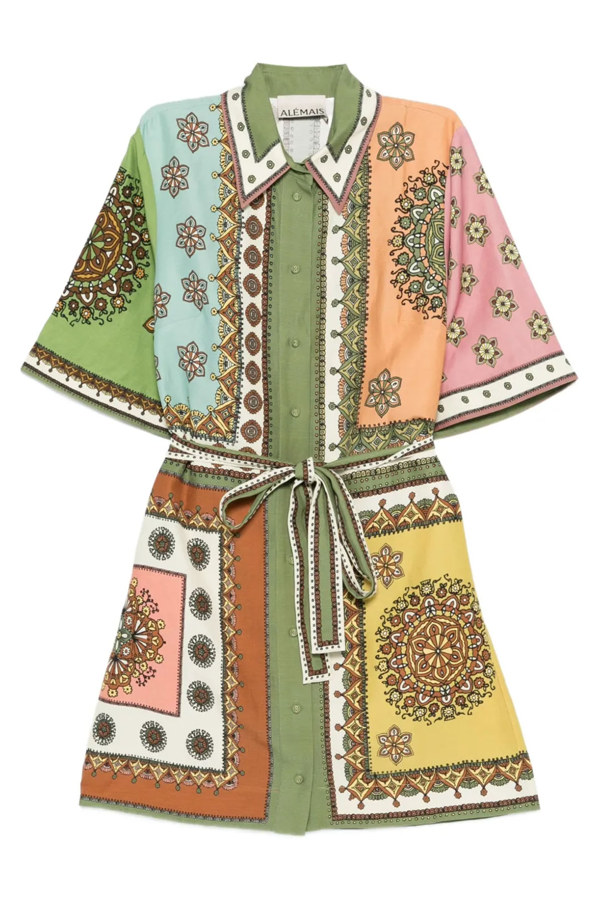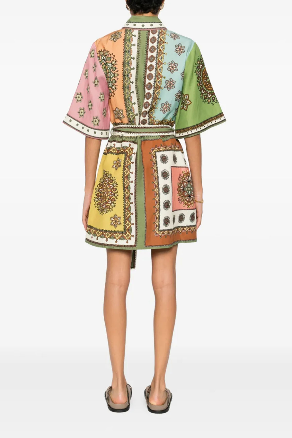 Modello chemisier, colletto a punta, manica corta, abbottonatura frontale nascosta con bottoni ricoperti, tasche laterali nascoste, vita con passanti, cintura regolabile e rimovibile, lunghezza sopra al ginocchio.