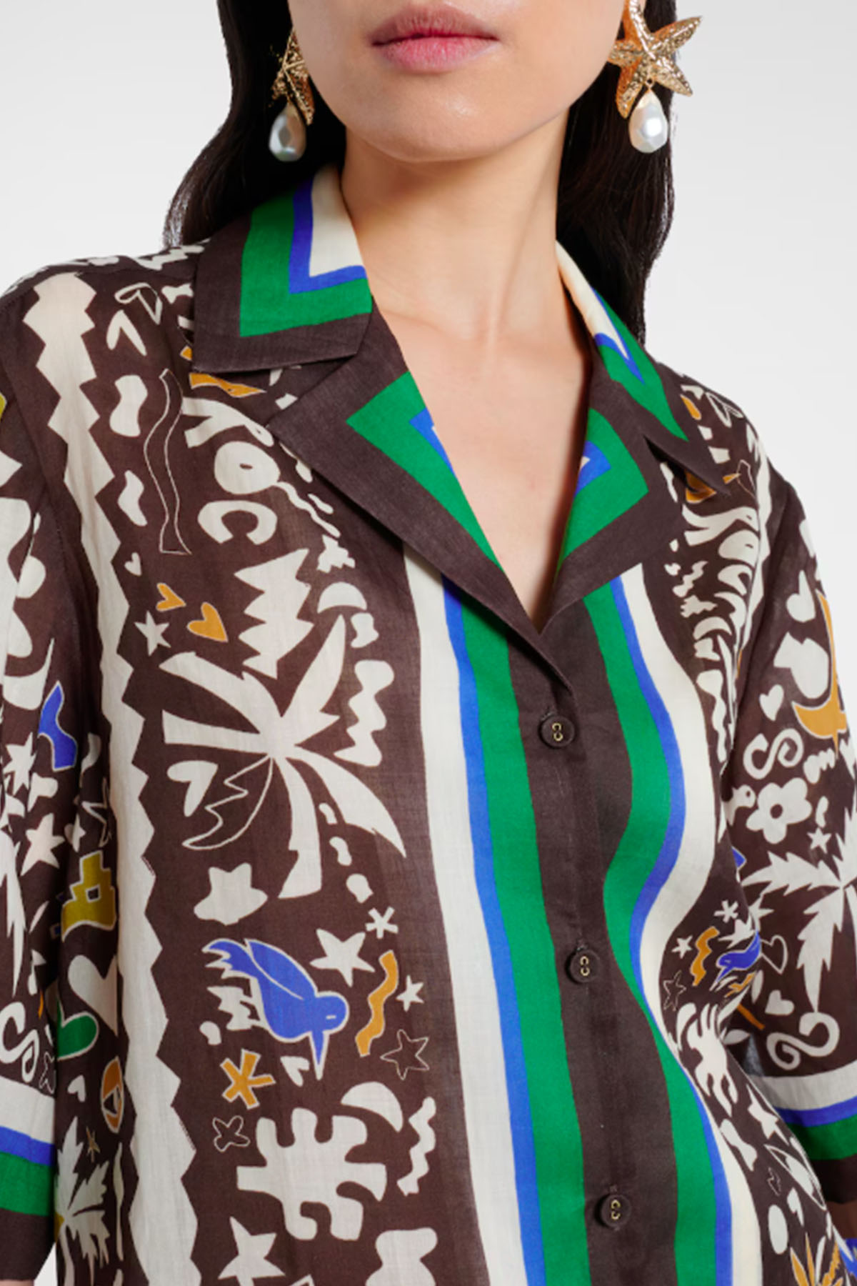 Modello con colletto, manica corta, abbottonatura frontale, taglio spalla basso, bottoni rivestiti, orlo dritto.