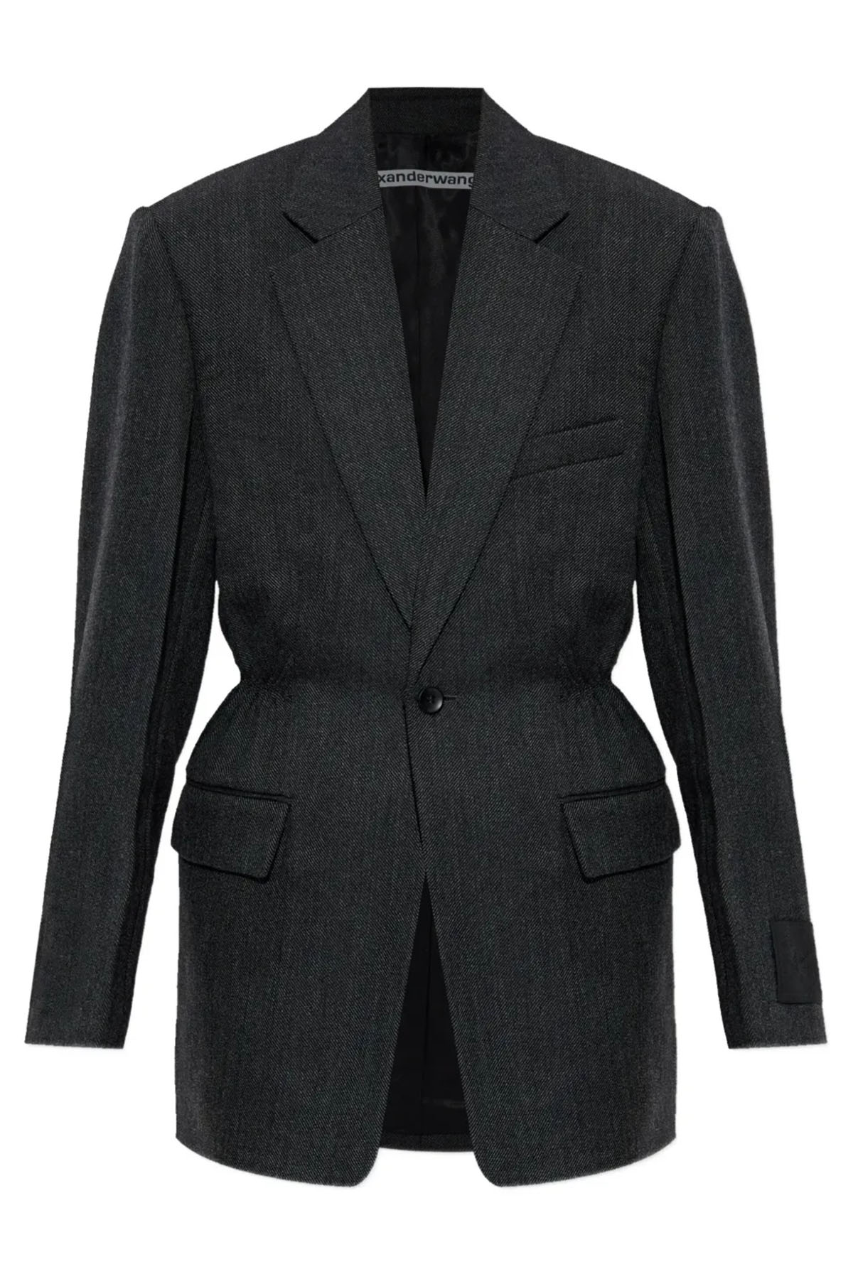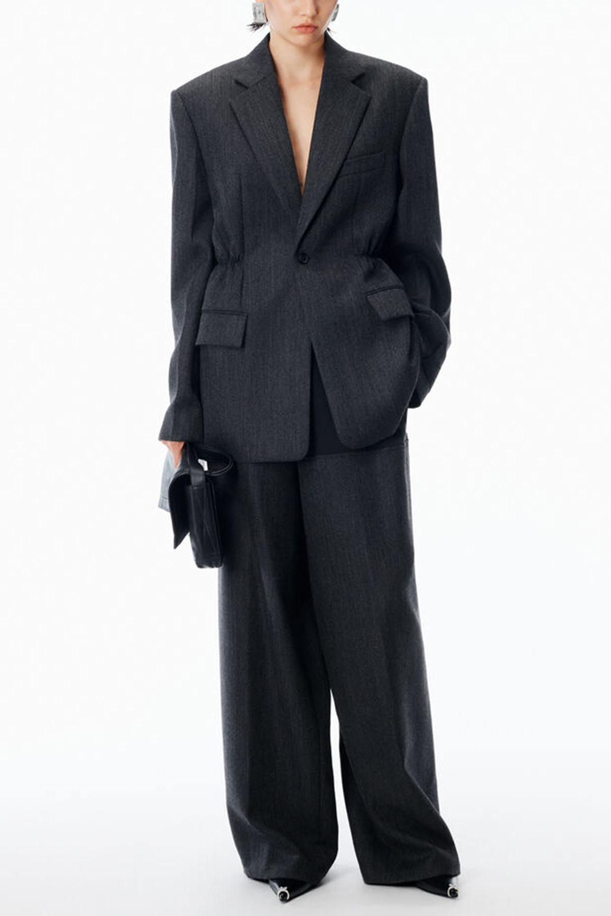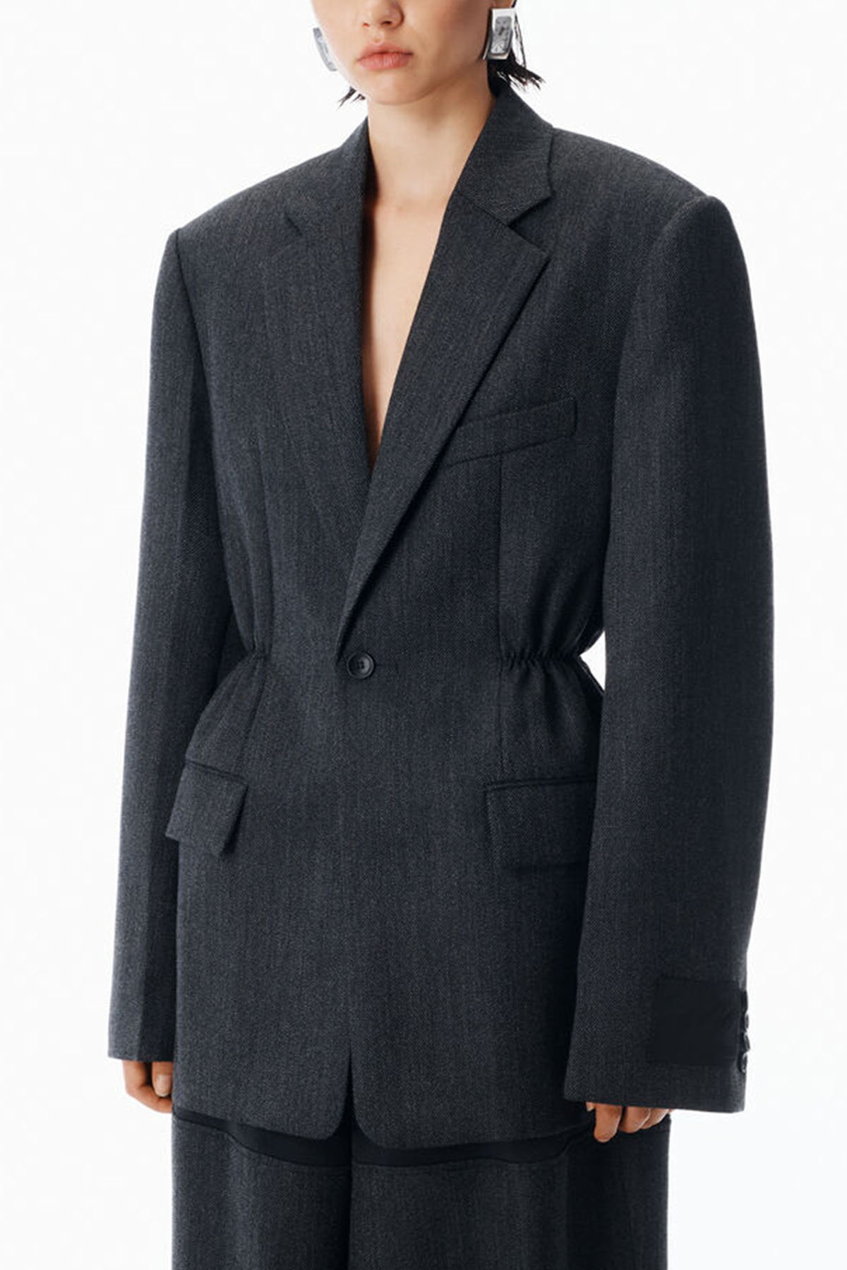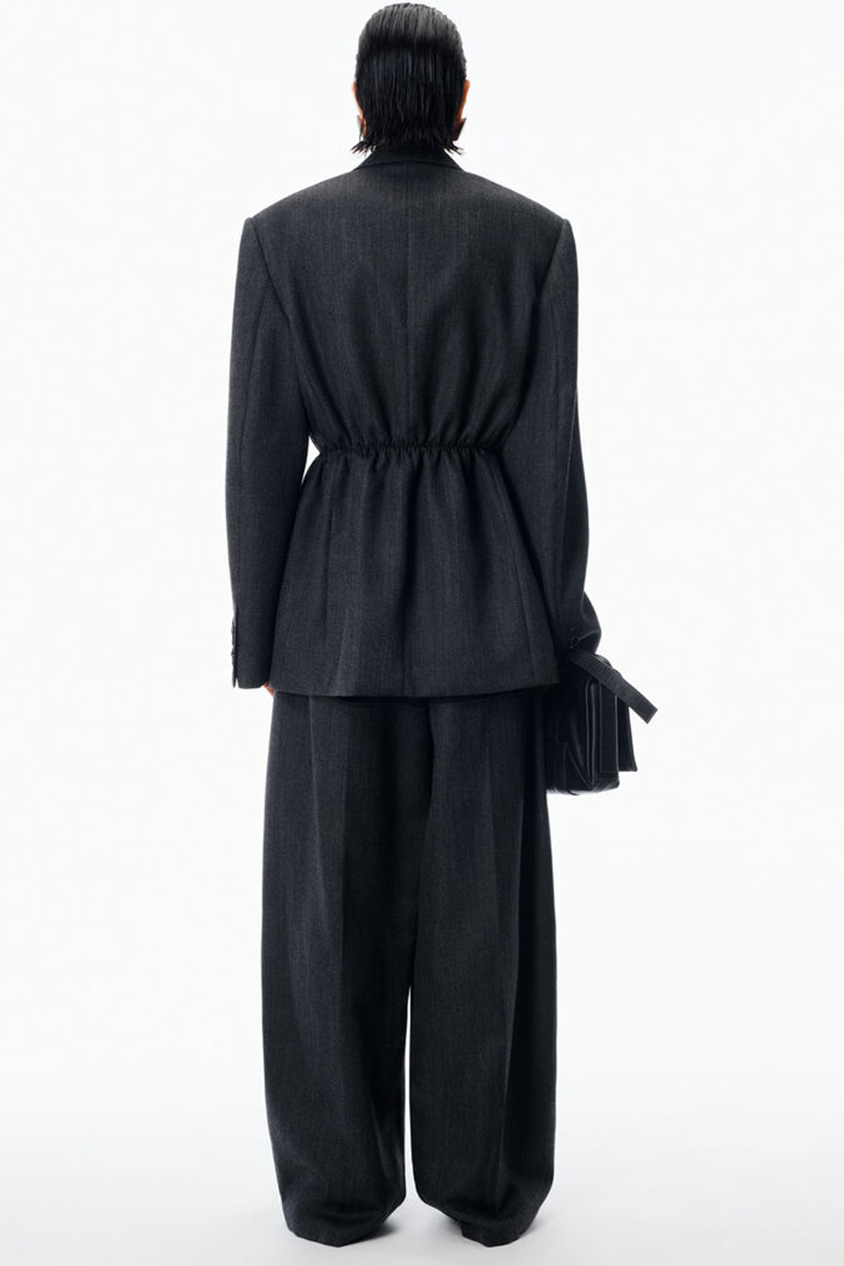 Modello in twill di lana, vita arricciata con cuciture a zig-zag, revers classico, taschino singolo a filetto sul petto, due tasche anteriori con patta sui fianchi, polsini con quattro bottoni ed etichetta sartoriale.