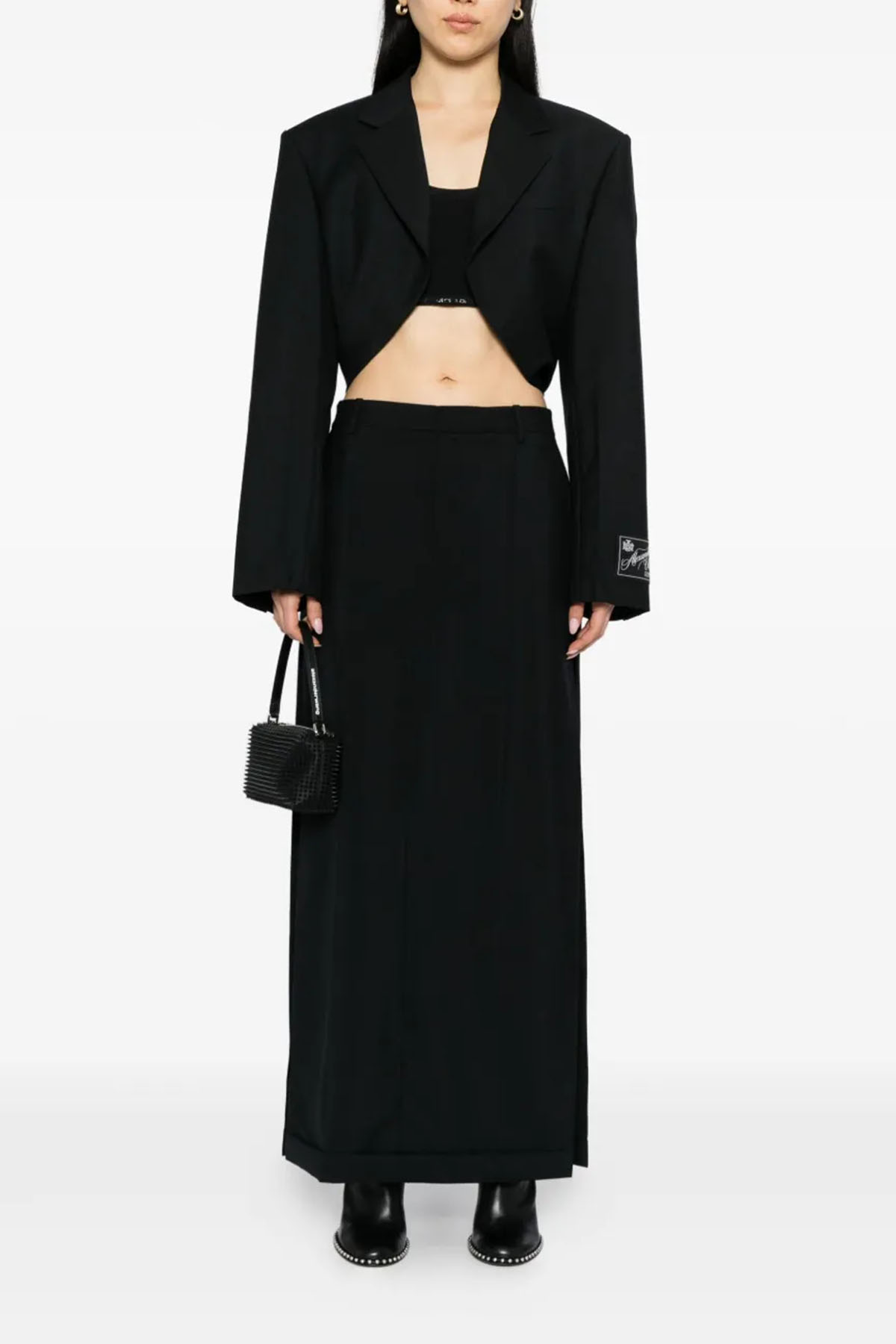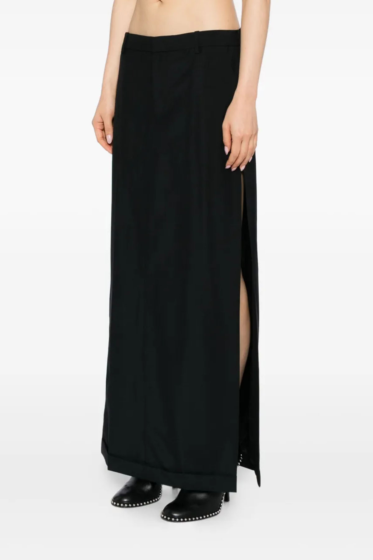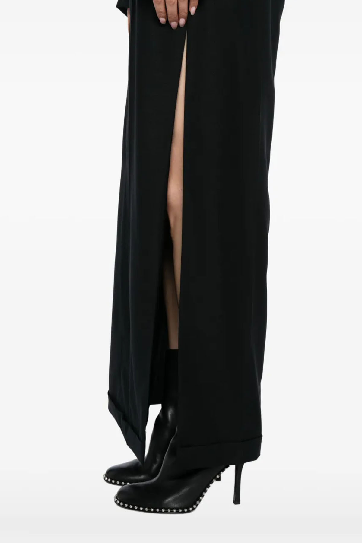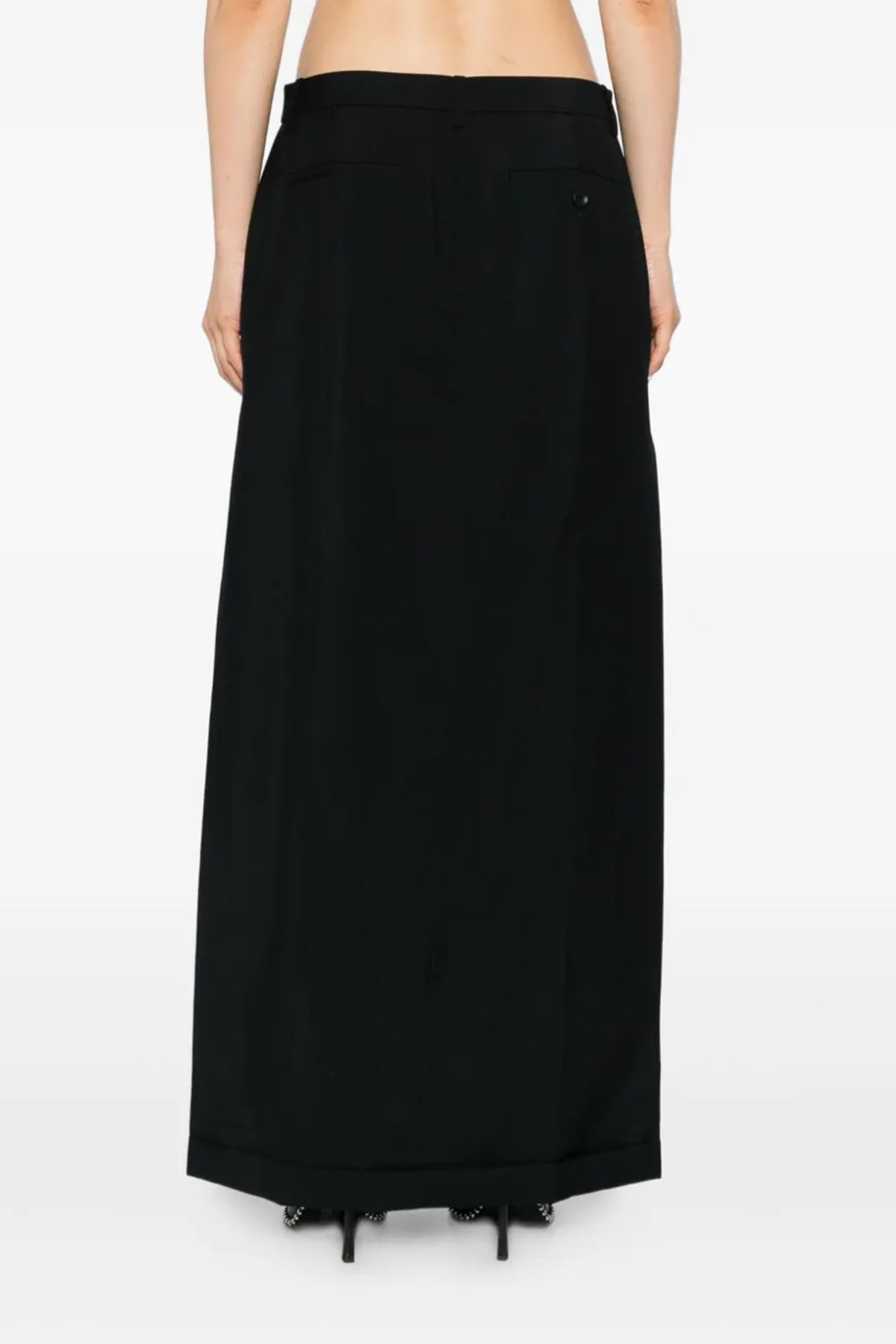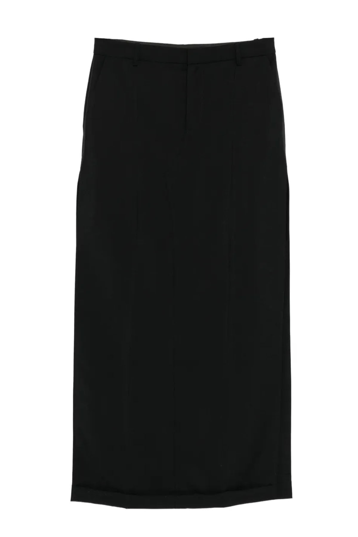 Modello lungo sartoriale realizzata in misto lana e mohair con spacchi laterali sulla coscia, presenta una chiusura frontale con patta, passanti per cintura, pieghe pressate e un orlo con risvolto. Modello completamente foderato con pantaloncini interni per facilitare i movimenti, girovita sartoriale con passanti per cintura, chiusura frontale con patta, tasche oblique laterali e tasche a filetto posteriori.