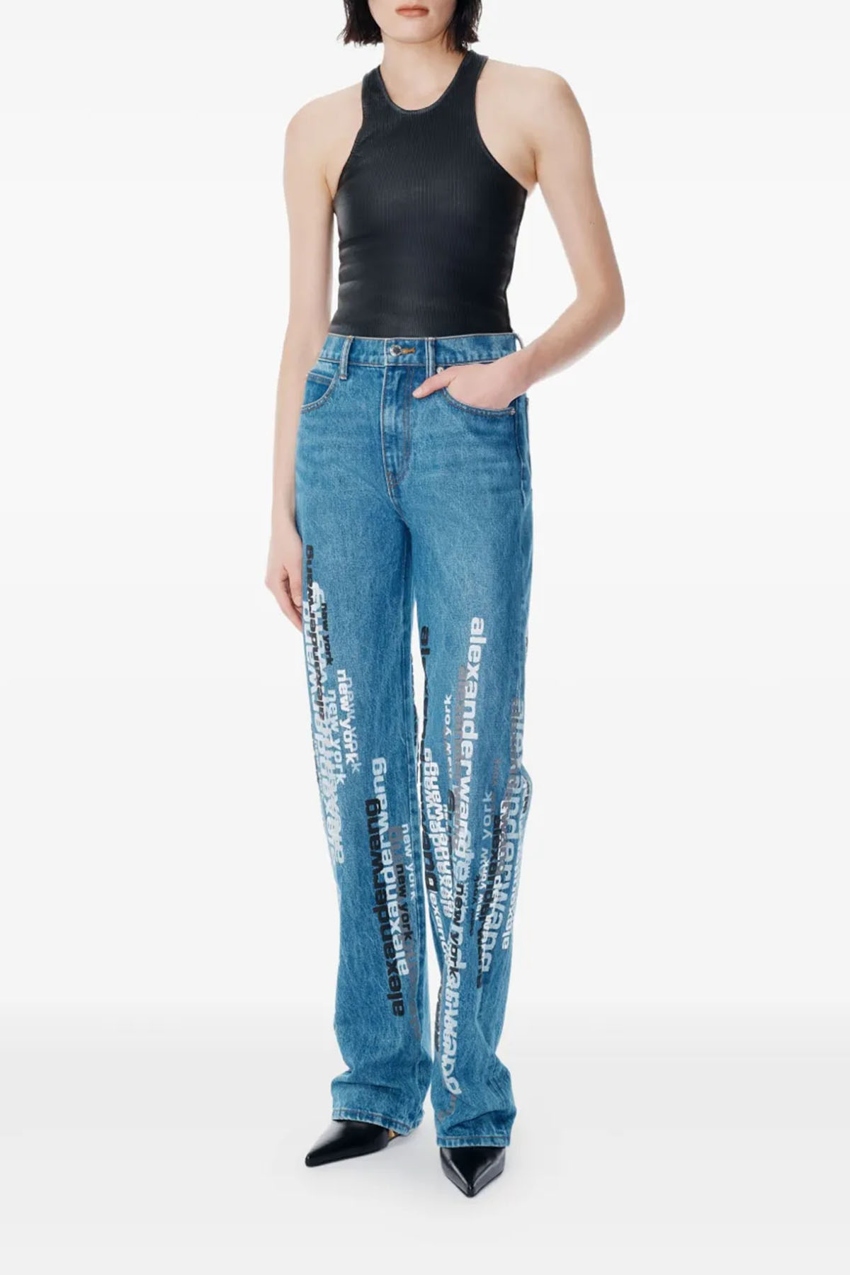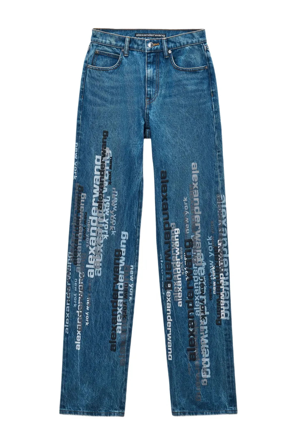Modello in denim di cotone con stampa serigrafica dimensionale del logo in verticale sulla gamba, gamba ampia dritta, vita media e orlo sovrapposto, passanti per cintura, patta con zip, modello a cinque tasche.
