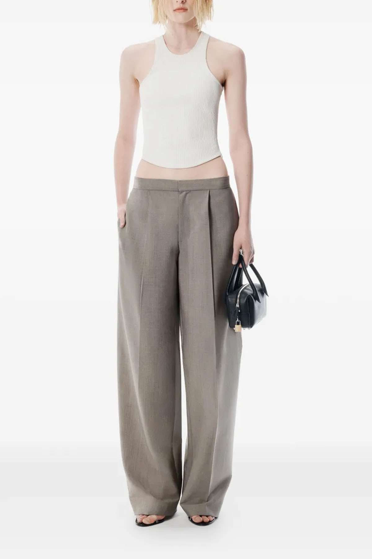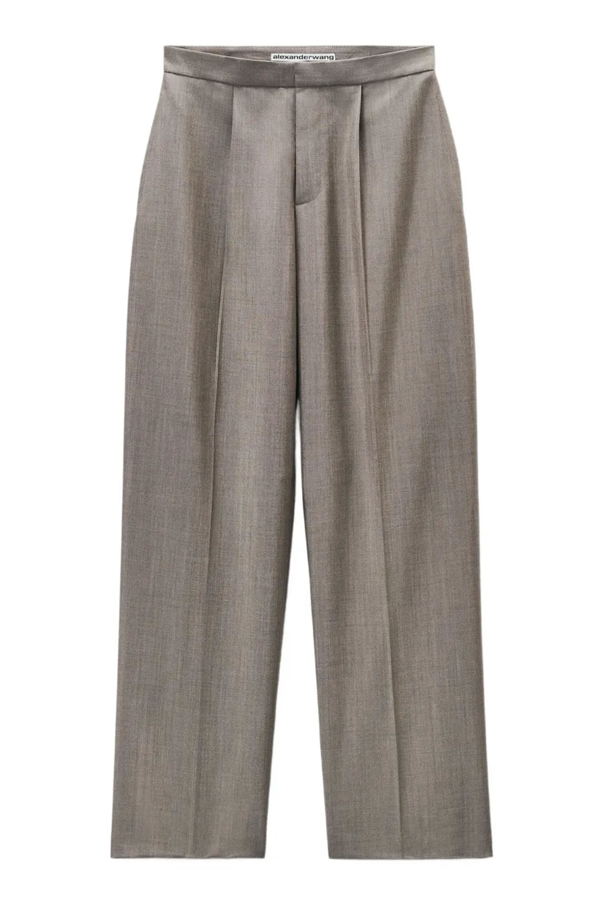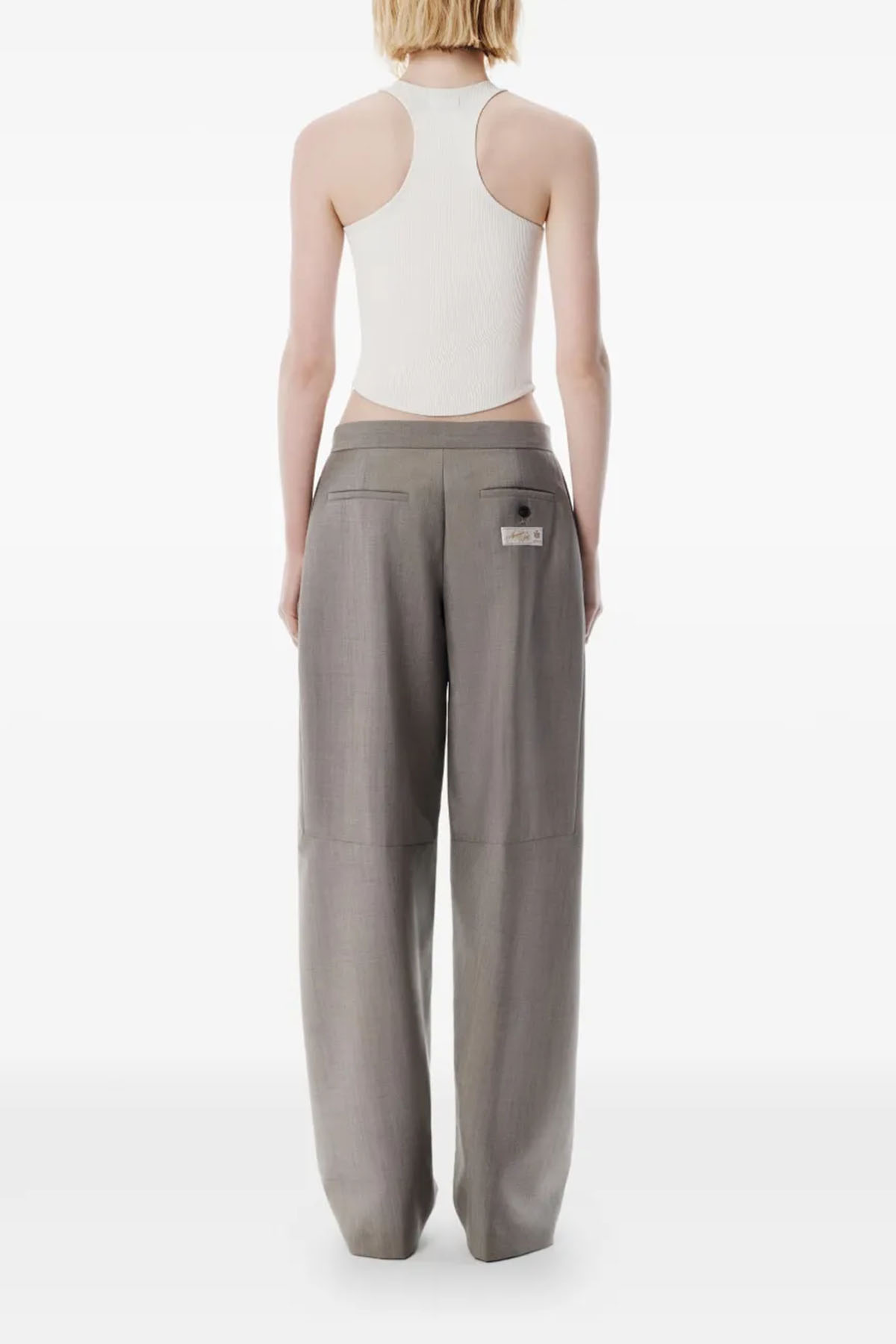 Modello sartoriale a vita media in misto lana e mohair con classica patta frontale e tasche sulle cuciture, lunghezza fino a terra per offrire un effetto oversize, tasche a filetto con chiusura a bottoni ed etichetta sartoriale con logo, chiusura frontale con patta