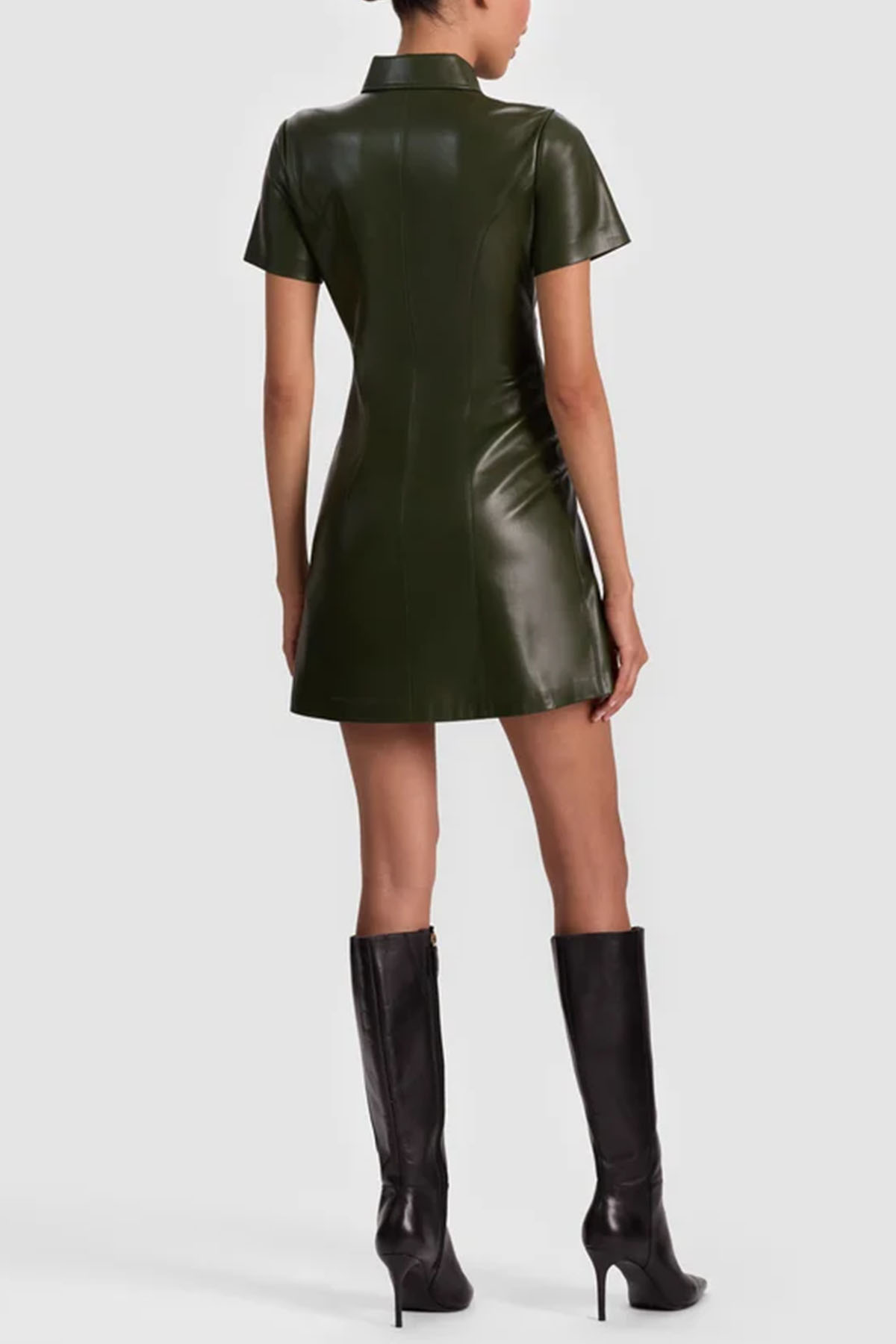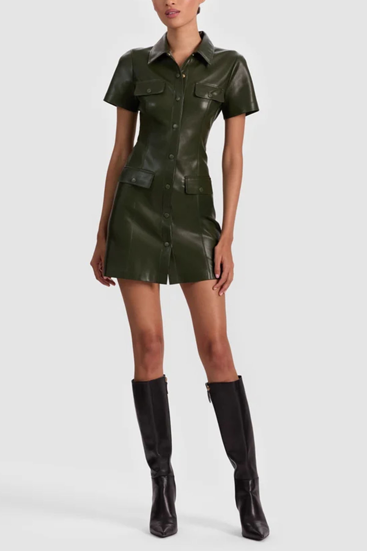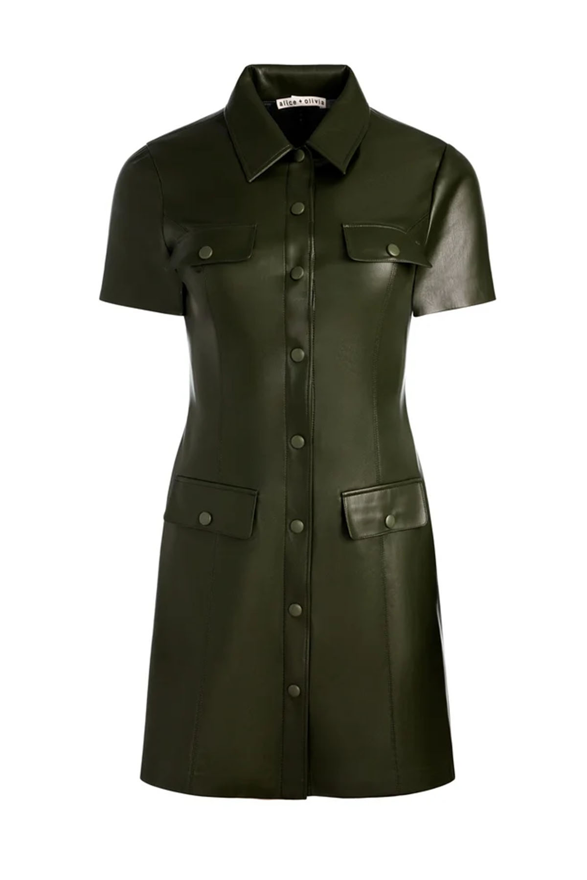abito verde militare, colletto a punta, chiusura a bottoni a pressione, tasche frontali con patta, maniche corte, lunghezza sopra al ginocchio.