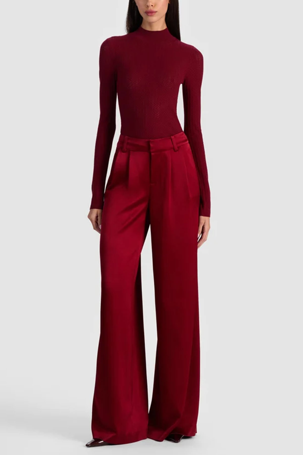 pantalone di colore bordeaux con doppia piega, vita alta, passanti per cintura, realizzato in lussuoso raso, scende in una gamba ampia, chiusura frontale con zip e gancio nascosti.