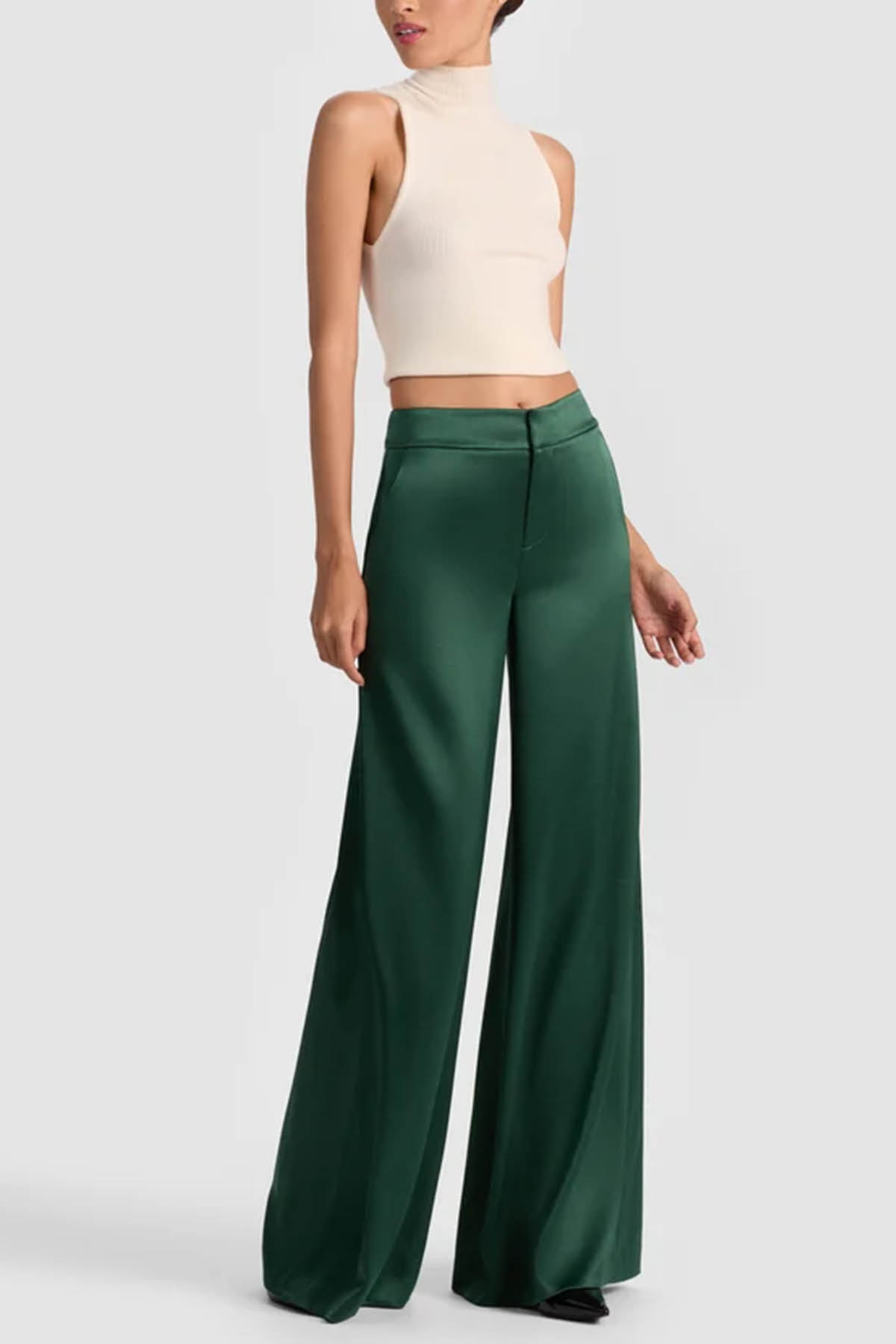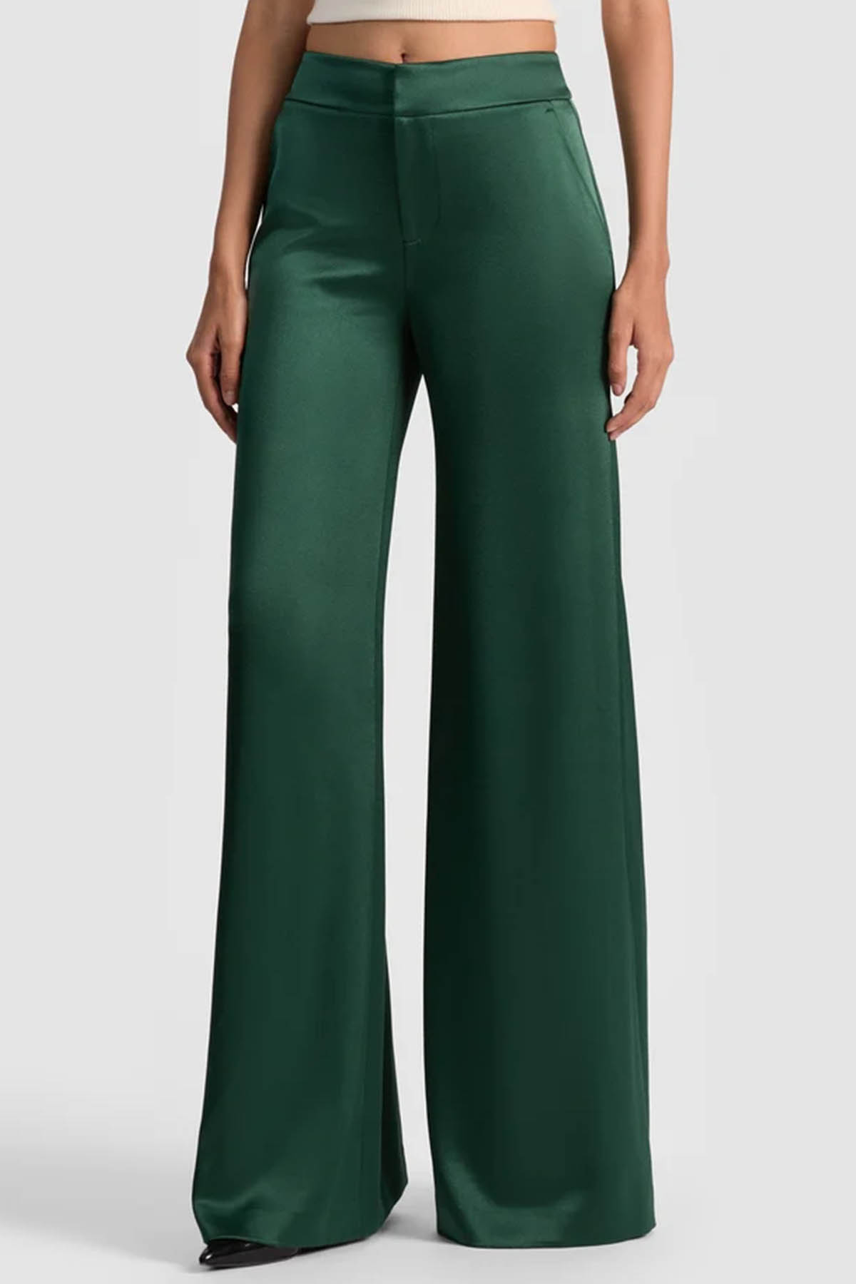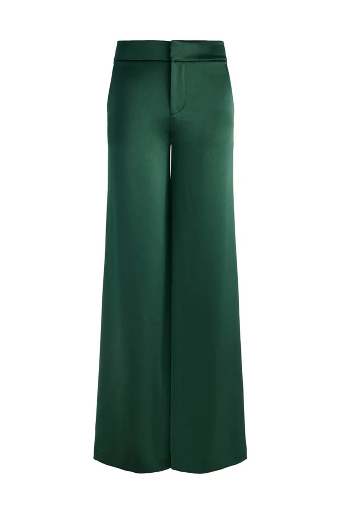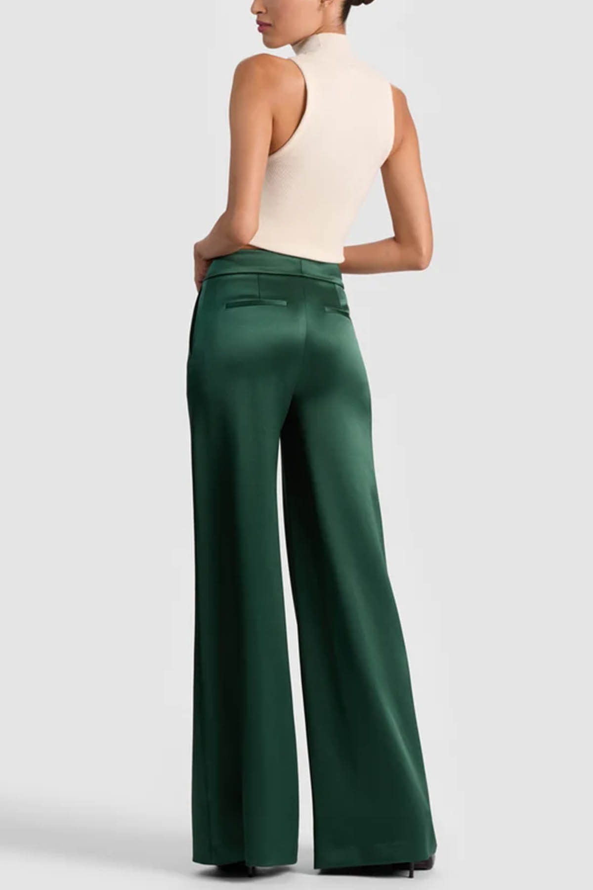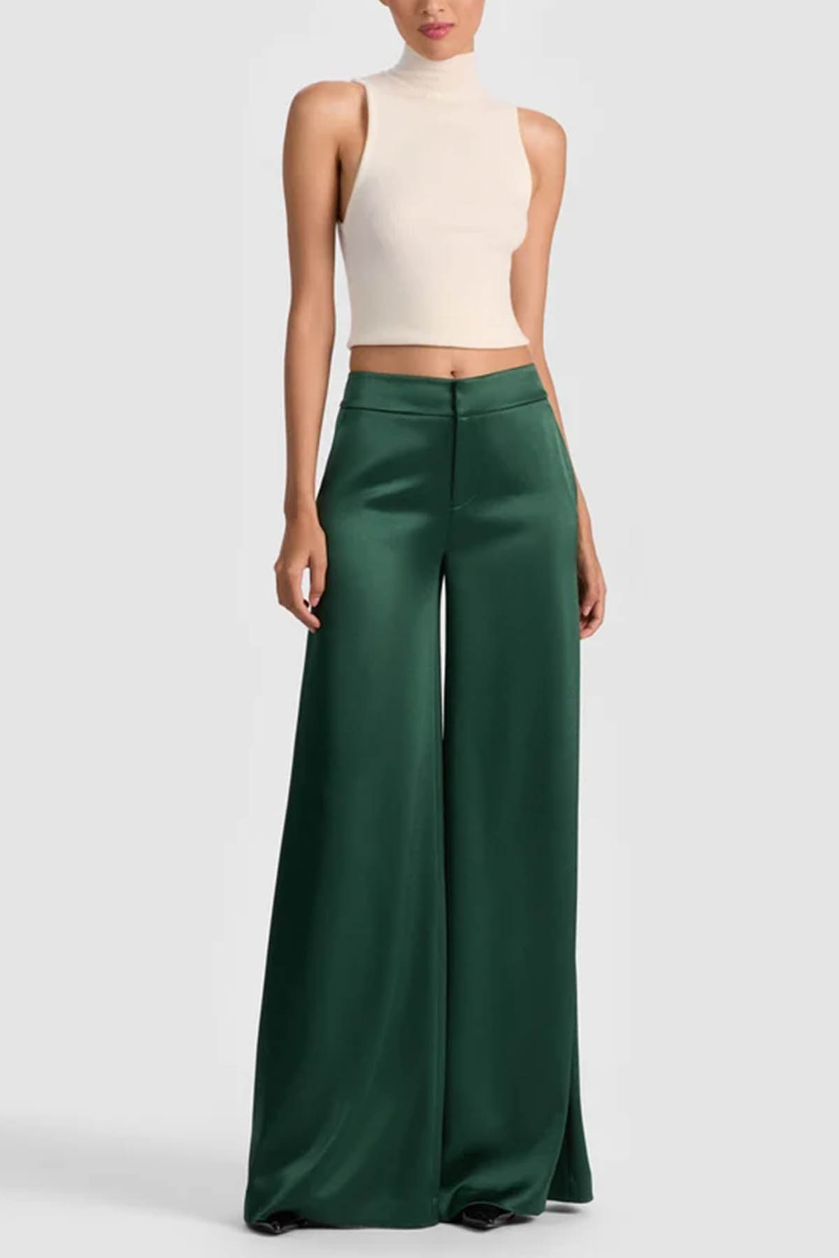 Modello vita alta, chiusura frontale nascosta con zip e gancio, tasche laterali nascoste, gamba ampia.