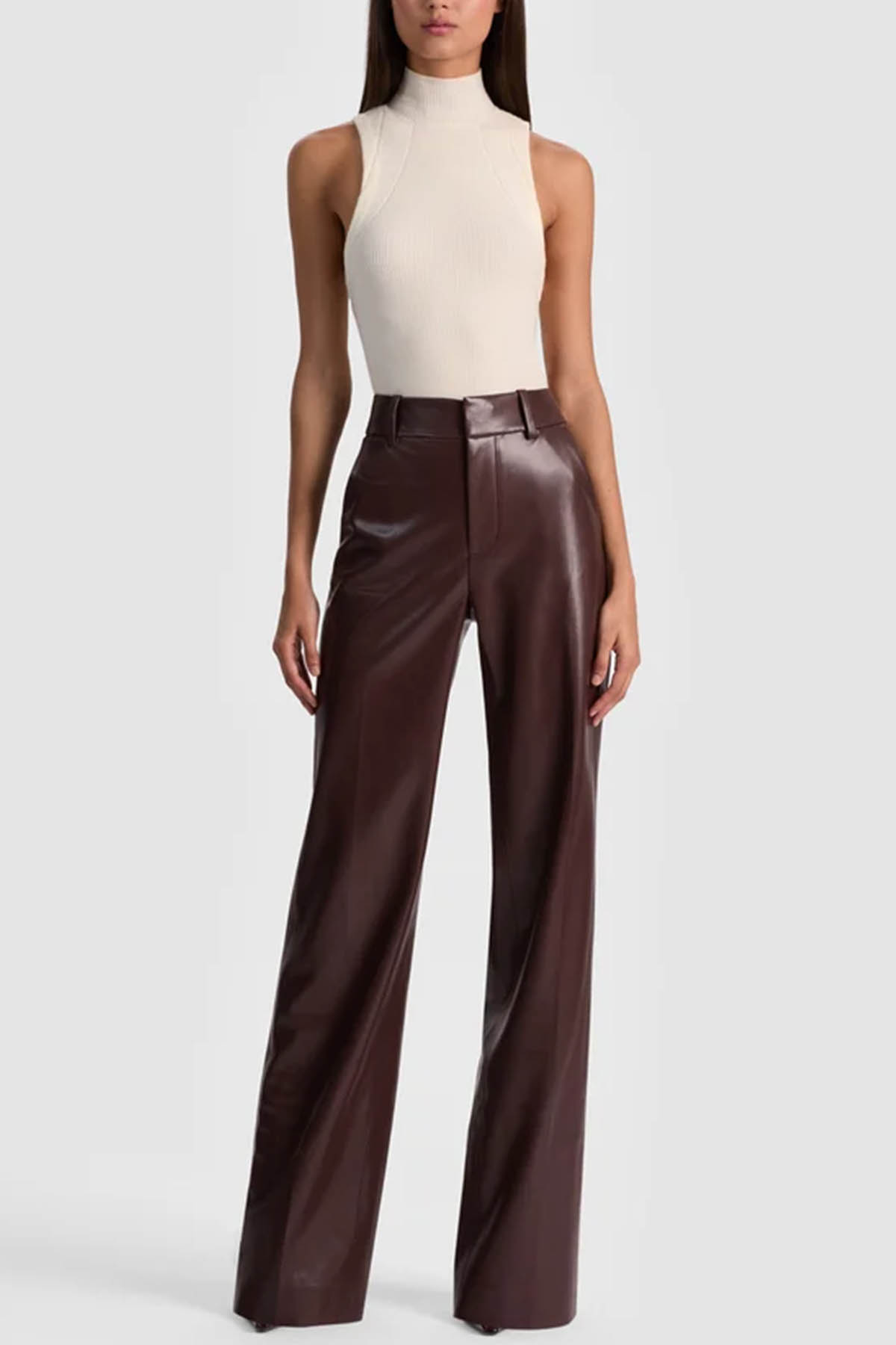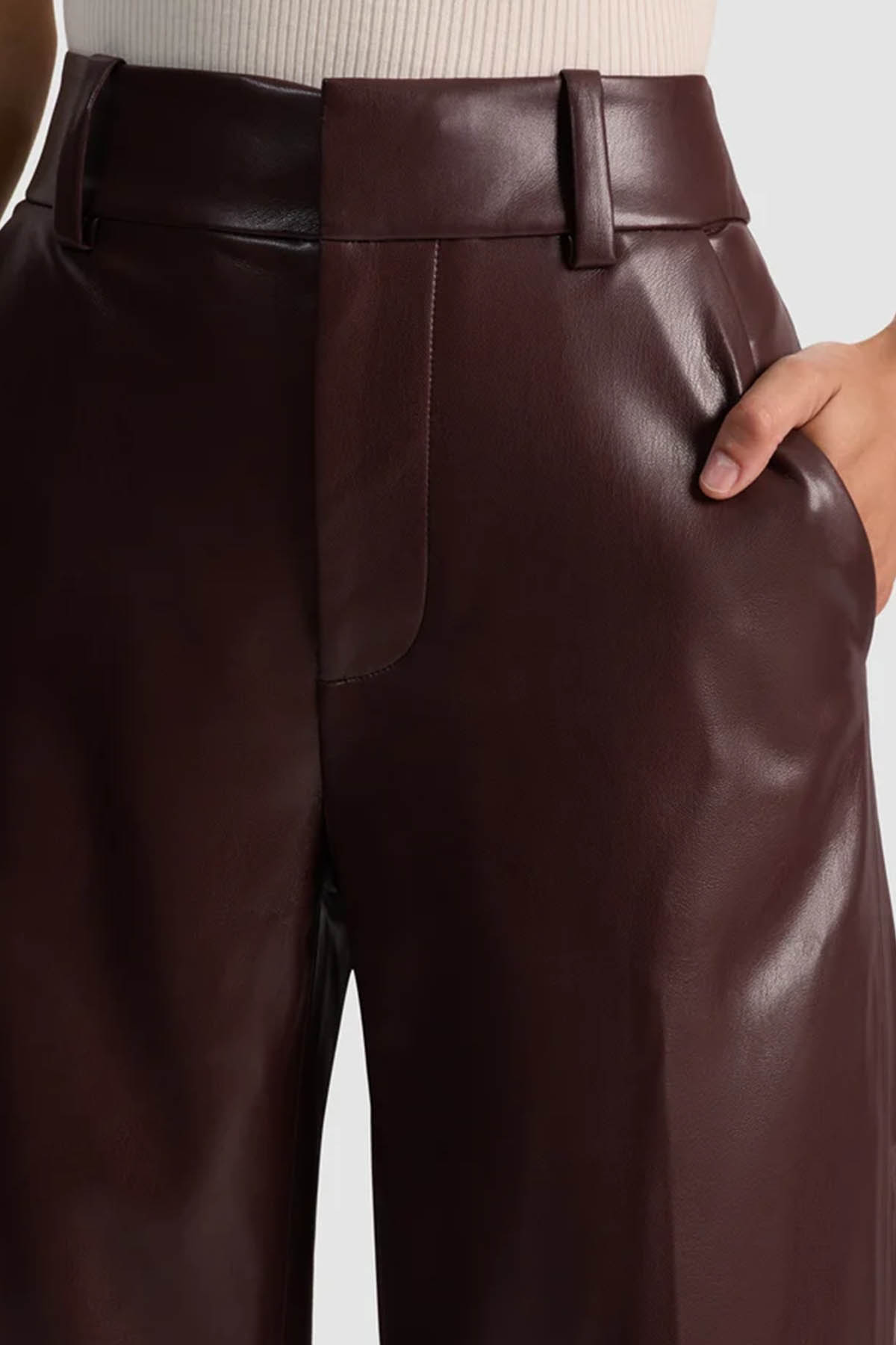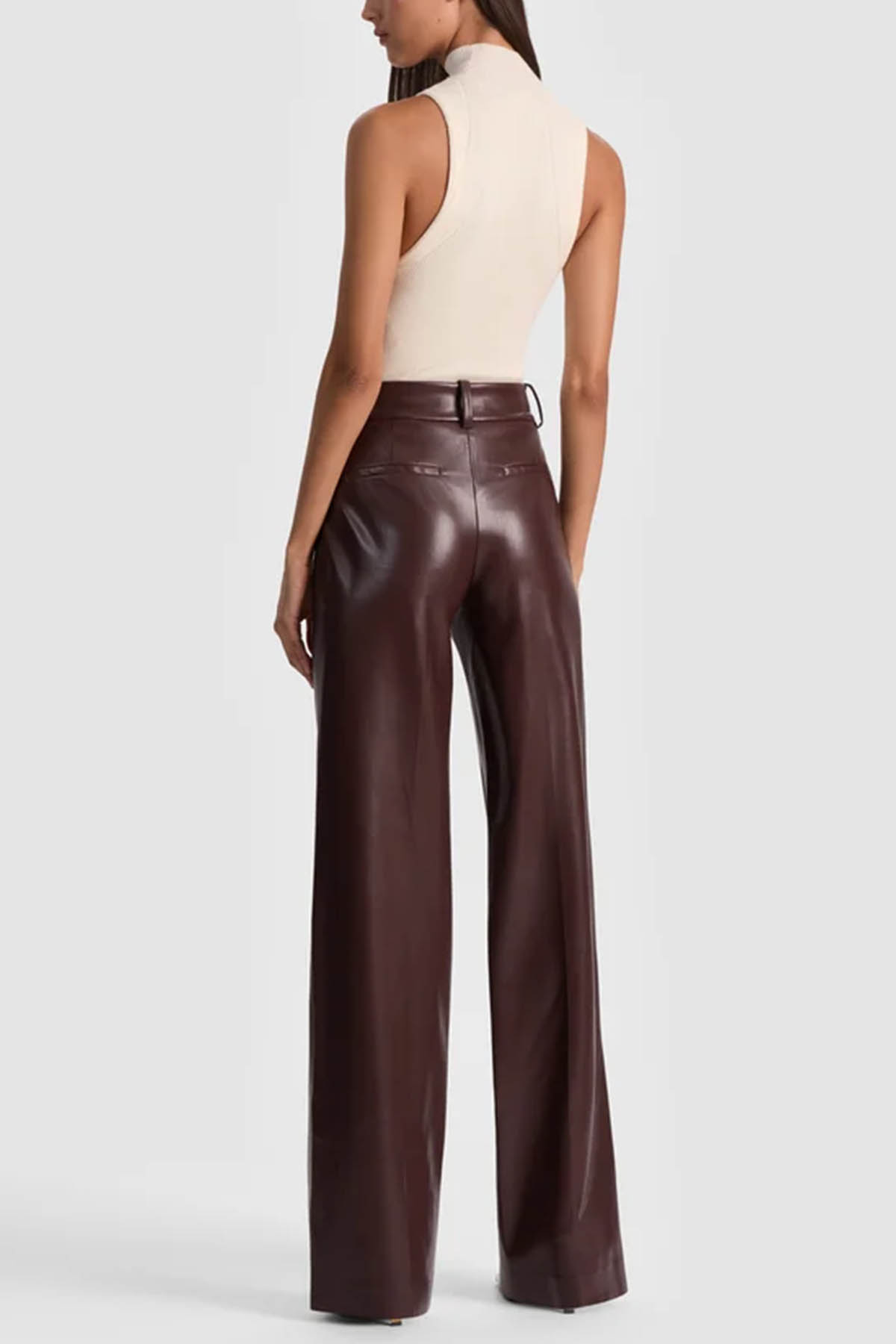 Modello in similpelle, vita alta, vita con passanti, chiusura frontale con zip nascosta e gancio, tasche laterali nascoste, gamba ampia.