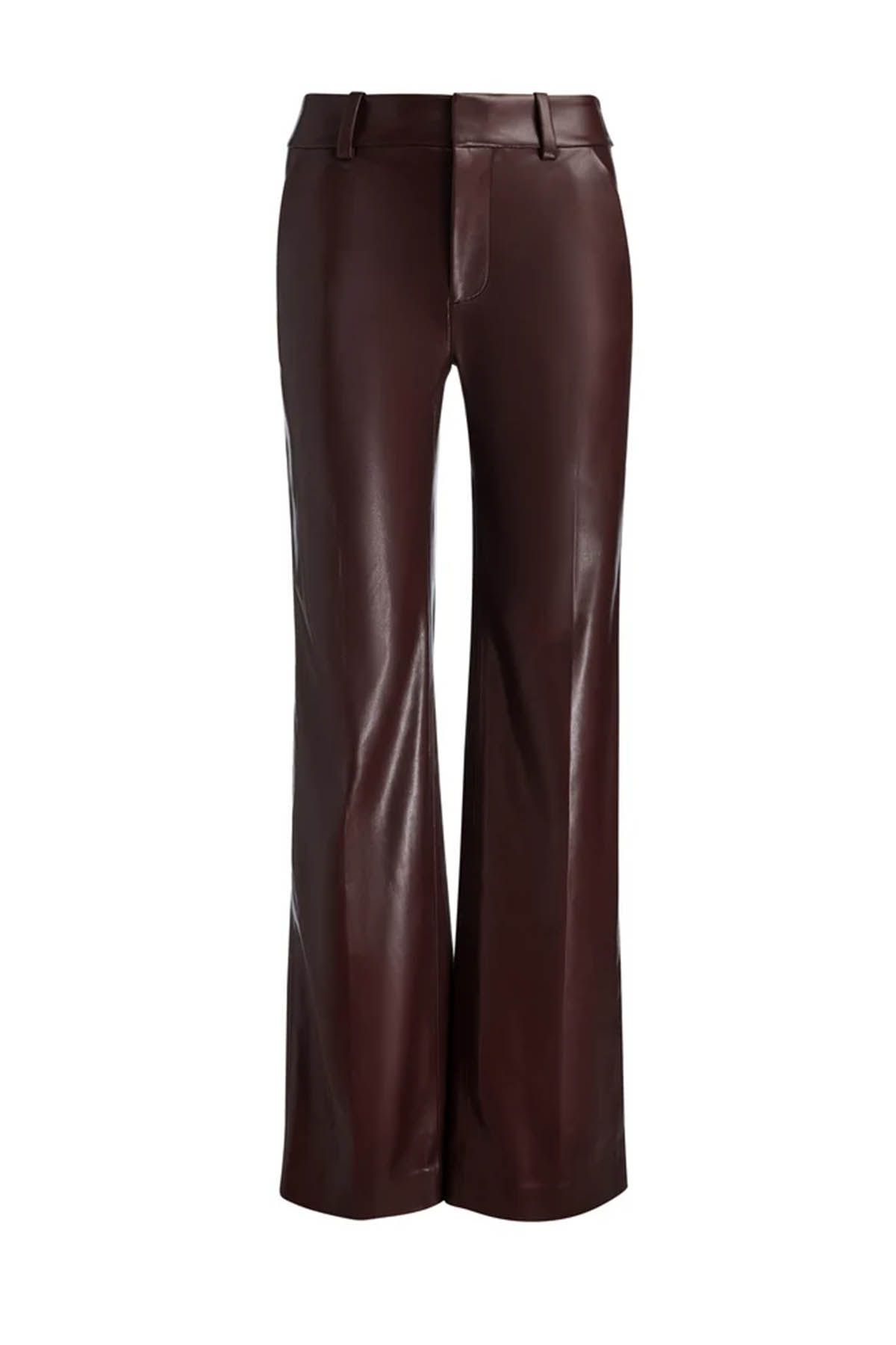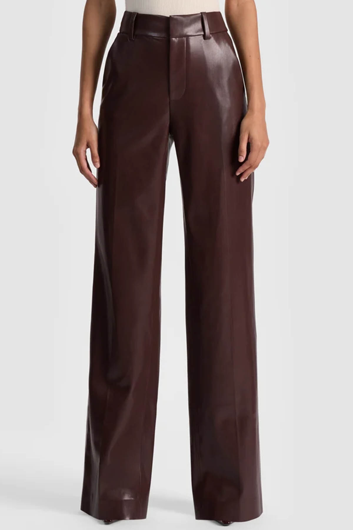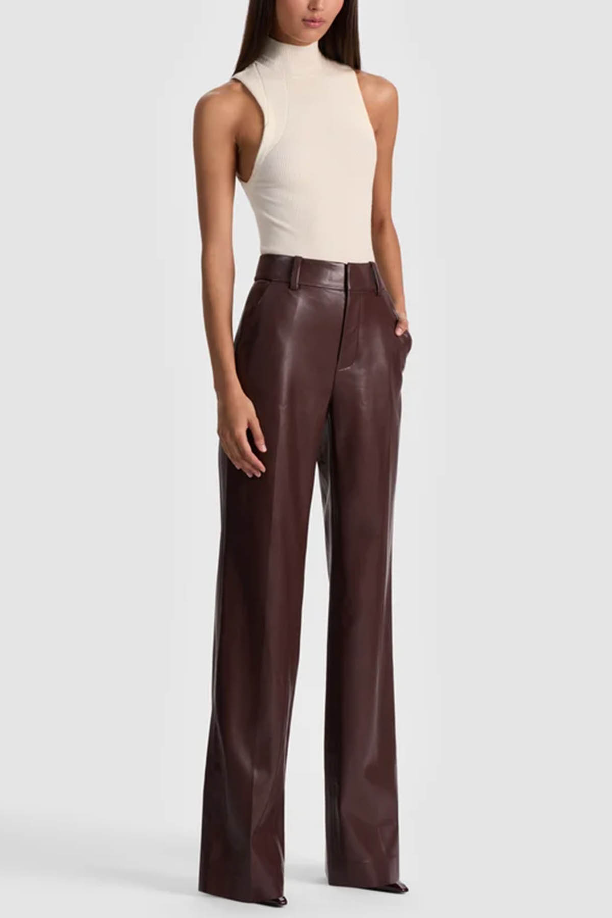 Modello in similpelle, vita alta, vita con passanti, chiusura frontale con zip nascosta e gancio, tasche laterali nascoste, gamba ampia.