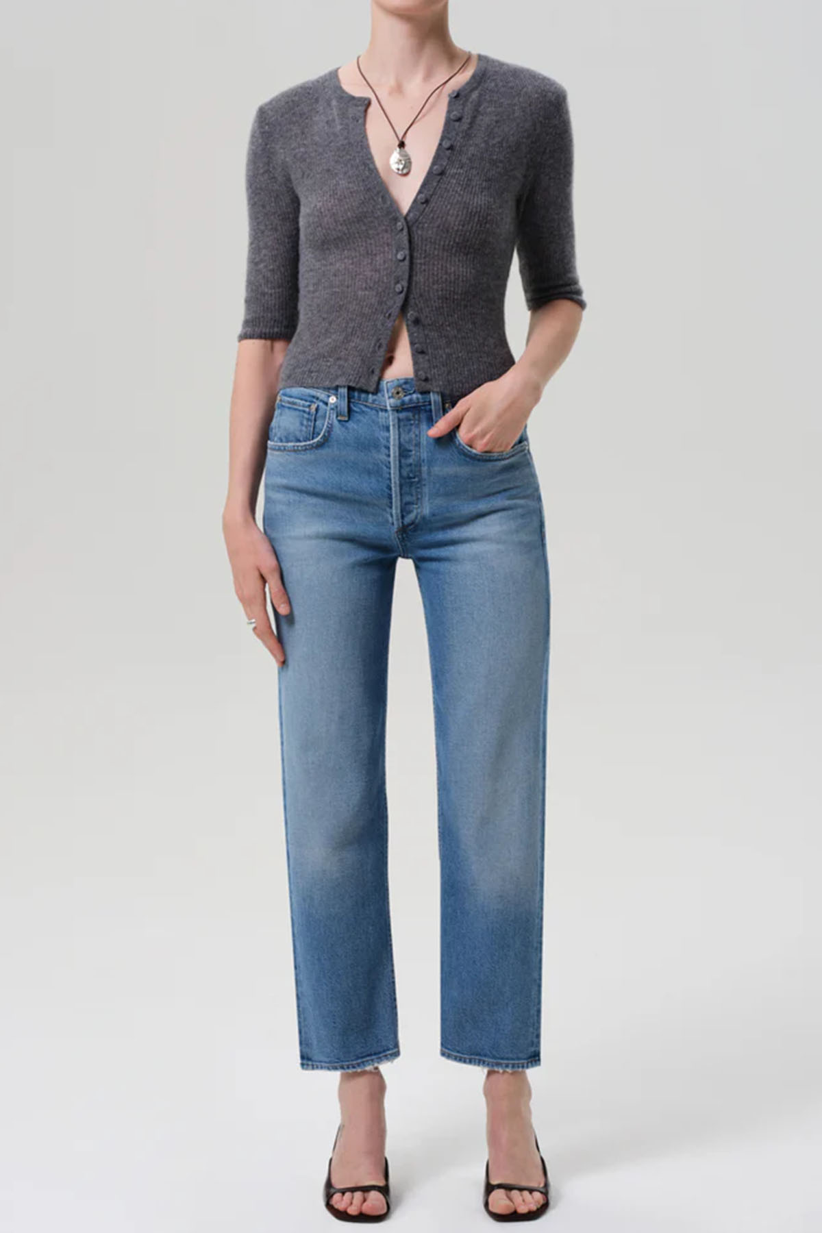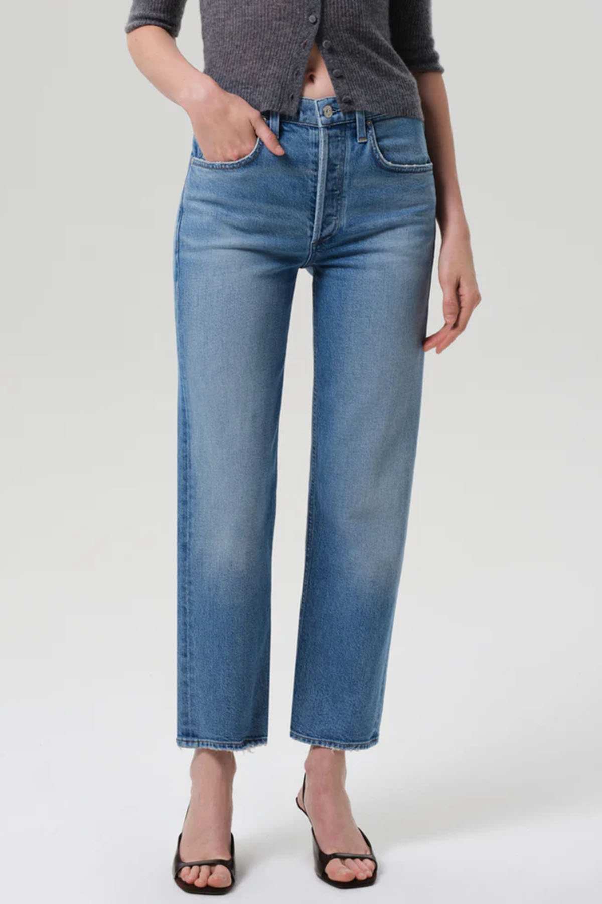 Modello vita alta, chiusura frontale con zip nascosta e bottone in metallo, gamba dritta, design morbido. Realizzato in cotone rigenerato.
