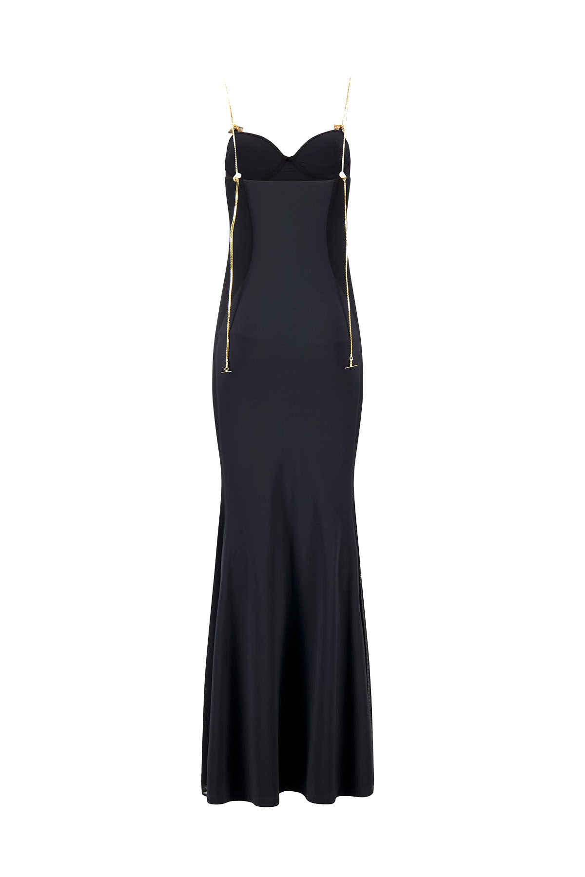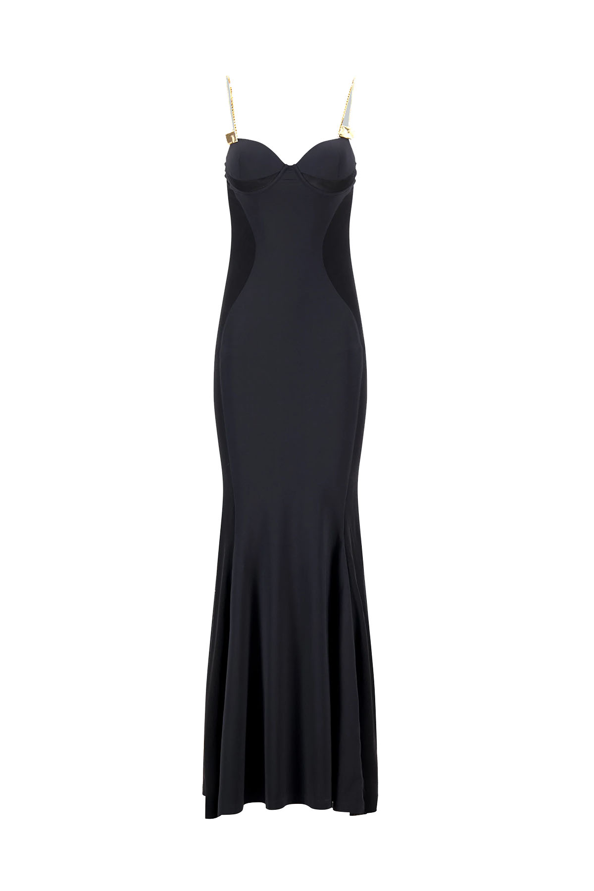 abito in jersey trasparente sui lati, coniuga una delicata trasparenza con un'eleganza fluida, spalline in catena regolabili, corsetto con coppe integrate, design lungo.