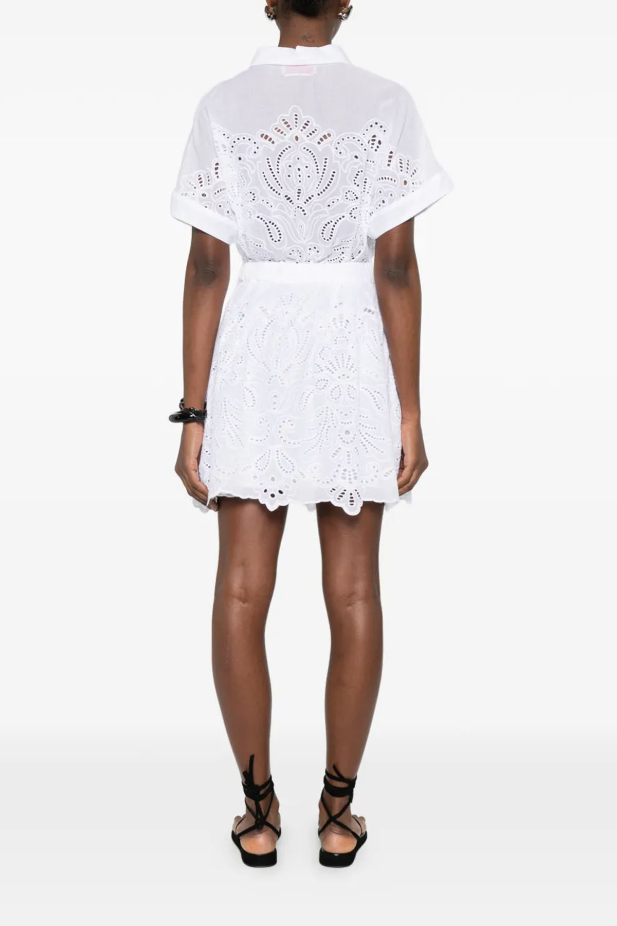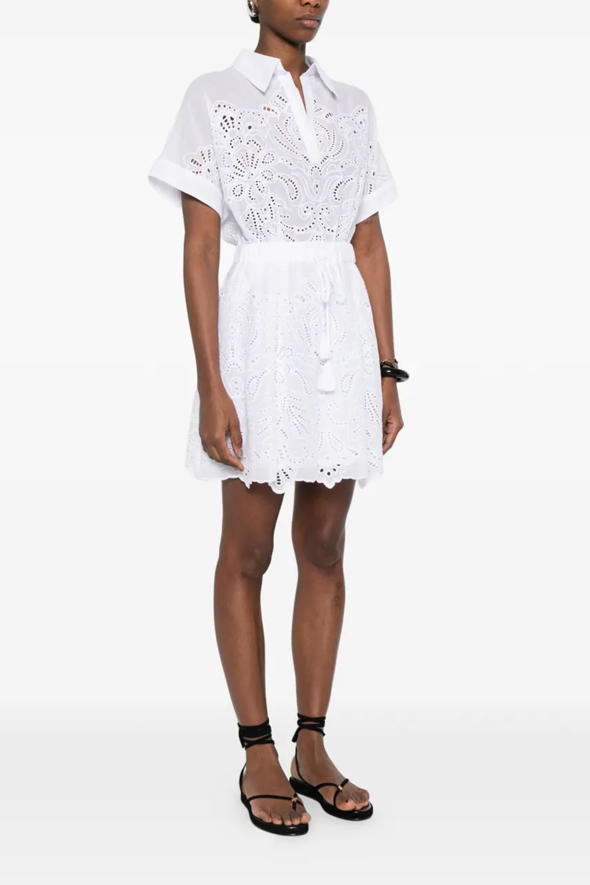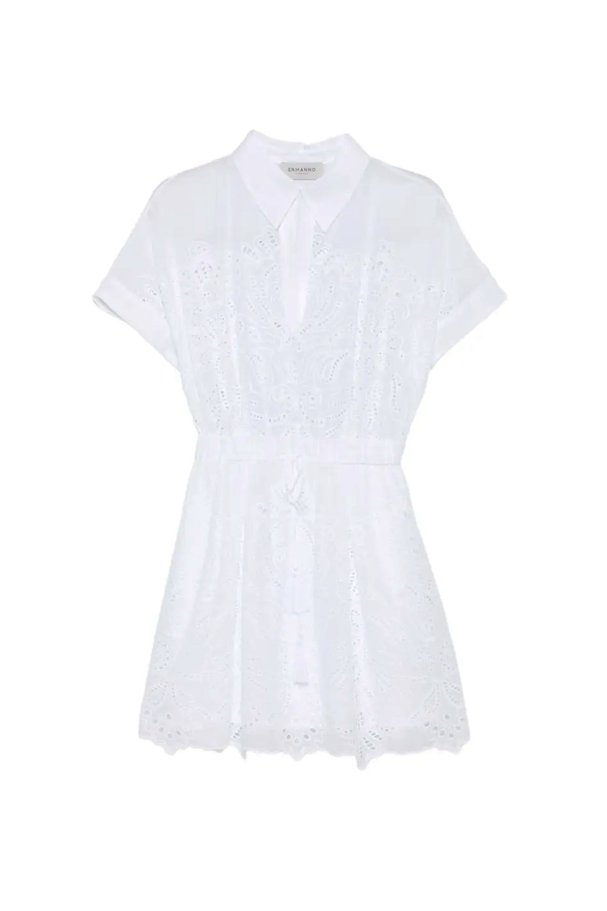 Abito chemisier corto in mussola di cotone con ricamo sangallo, colletto a camicia, maniche corte a kimono e apertura a polo senza bottoni, vita segnata con elastico interno e coulisse, tasche laterali nascoste, foderato dalla vita in giù.