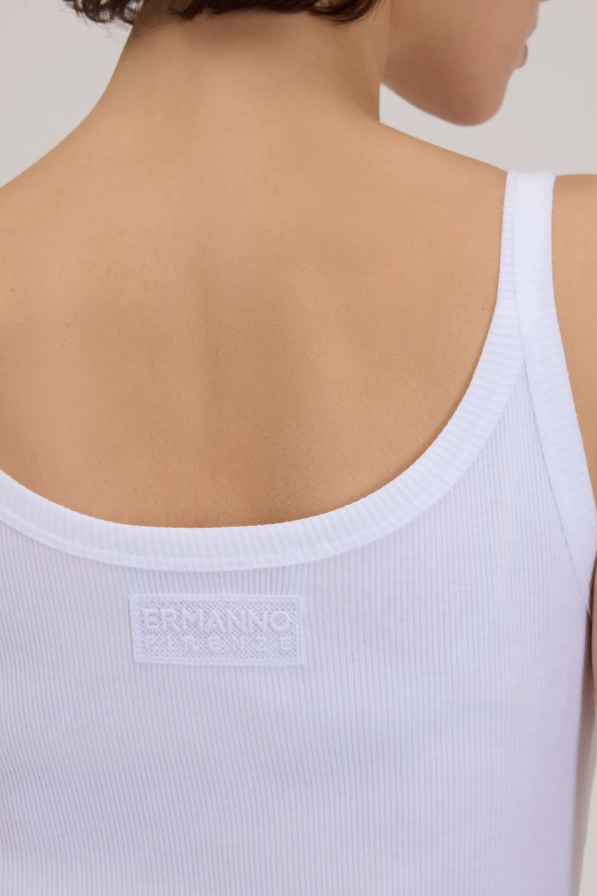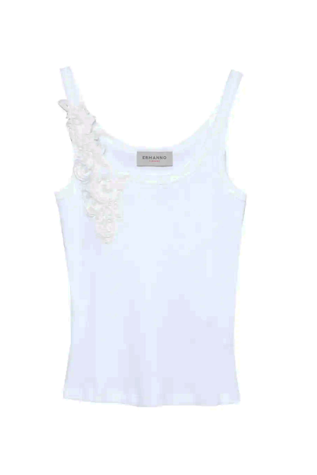 Canotta in jersey a costine con ampio scollo rotondo e ricamo cornelly in organza laterale, logo ricamato sulla schiena.
