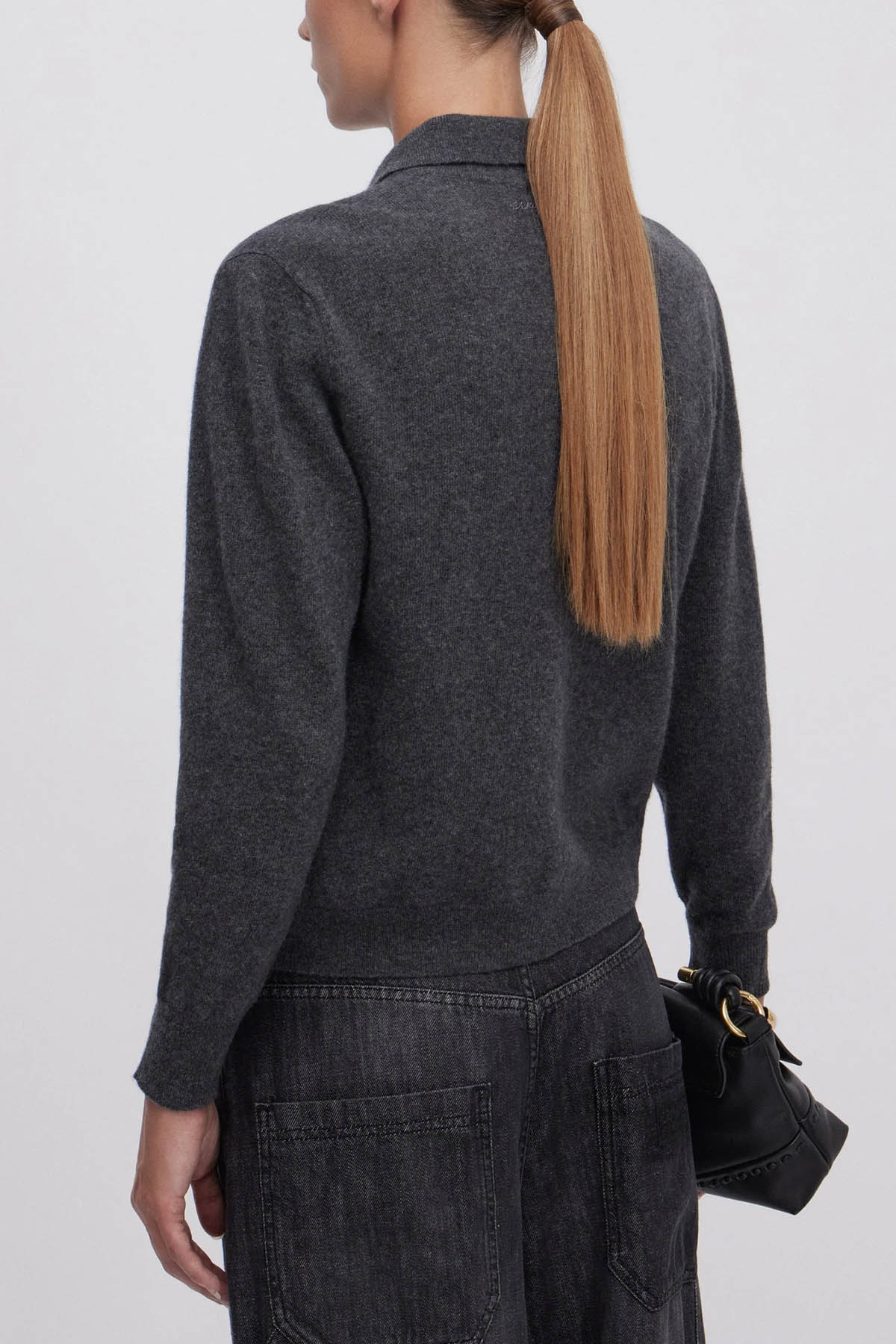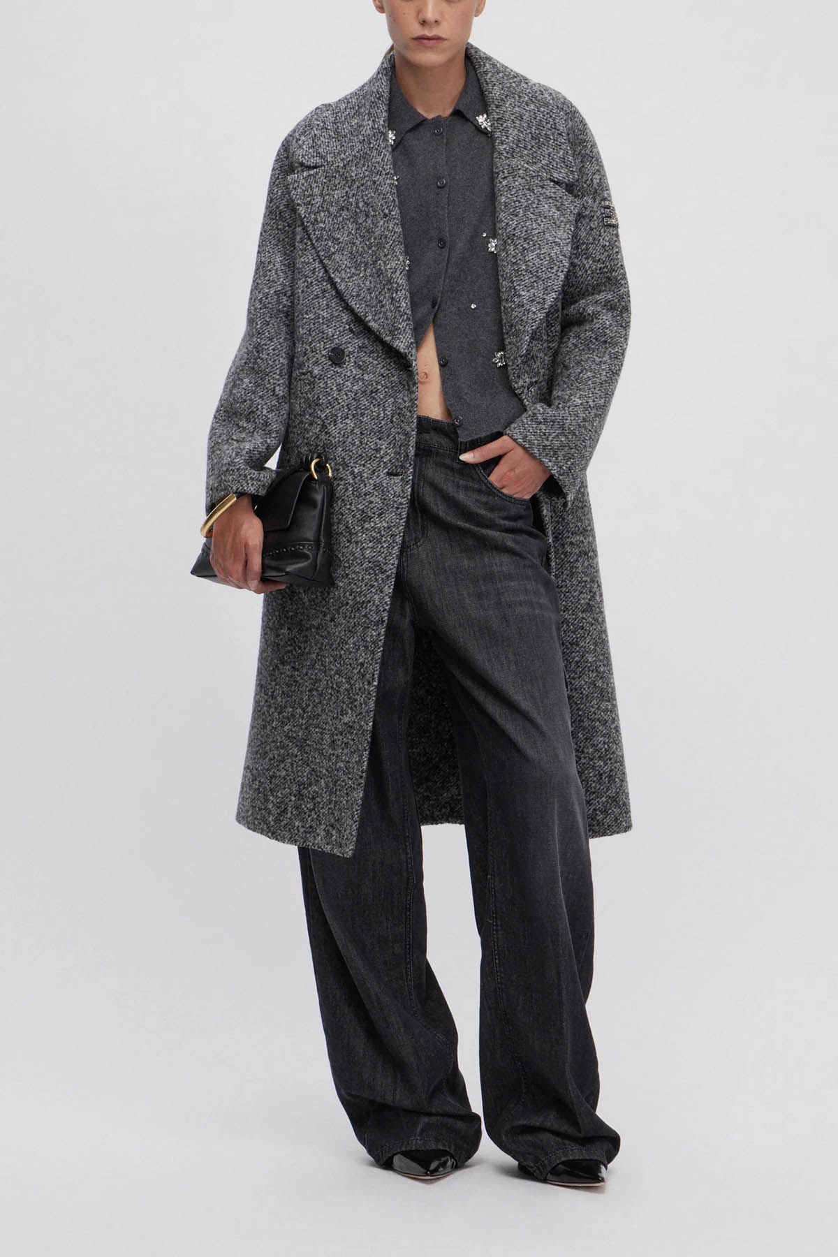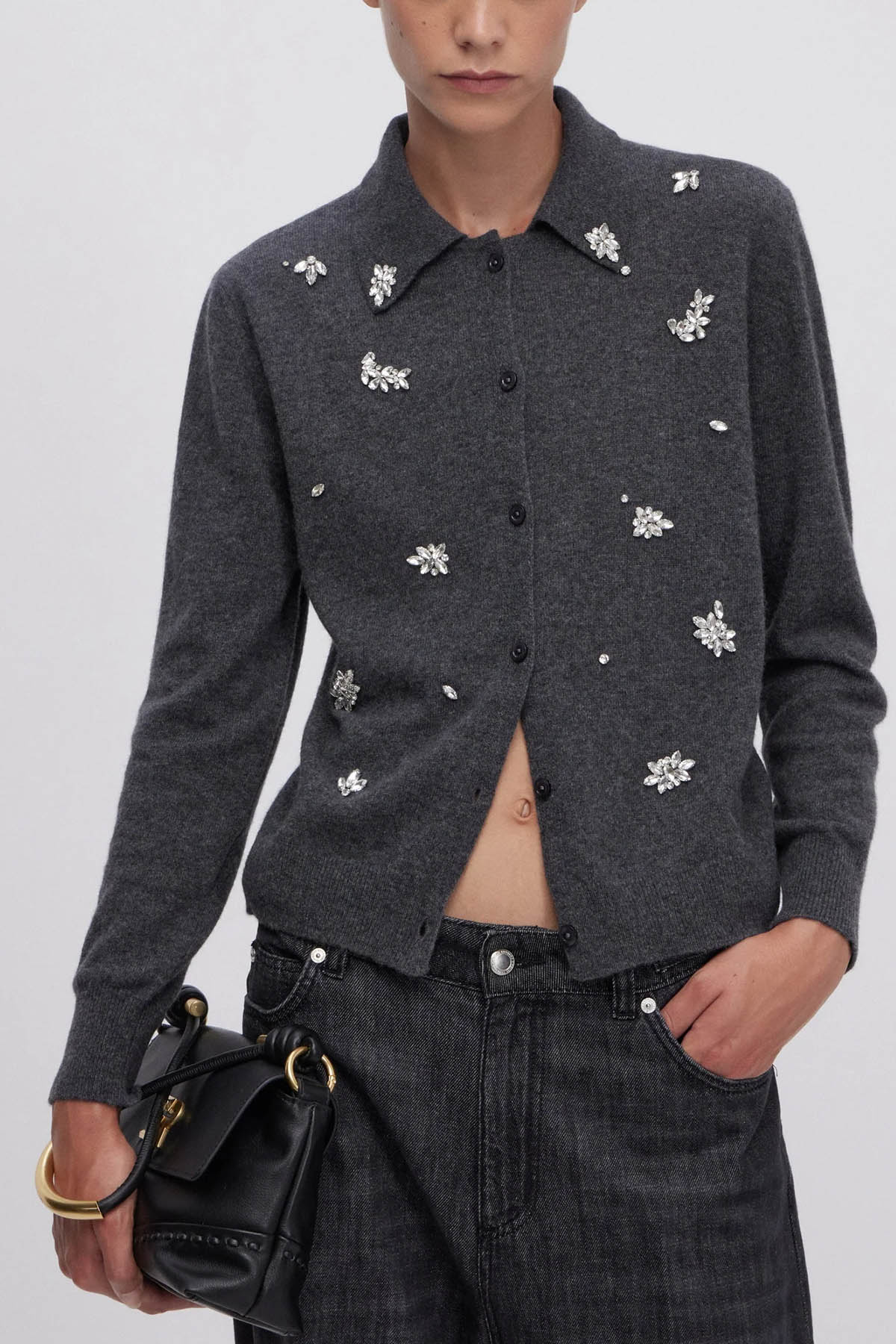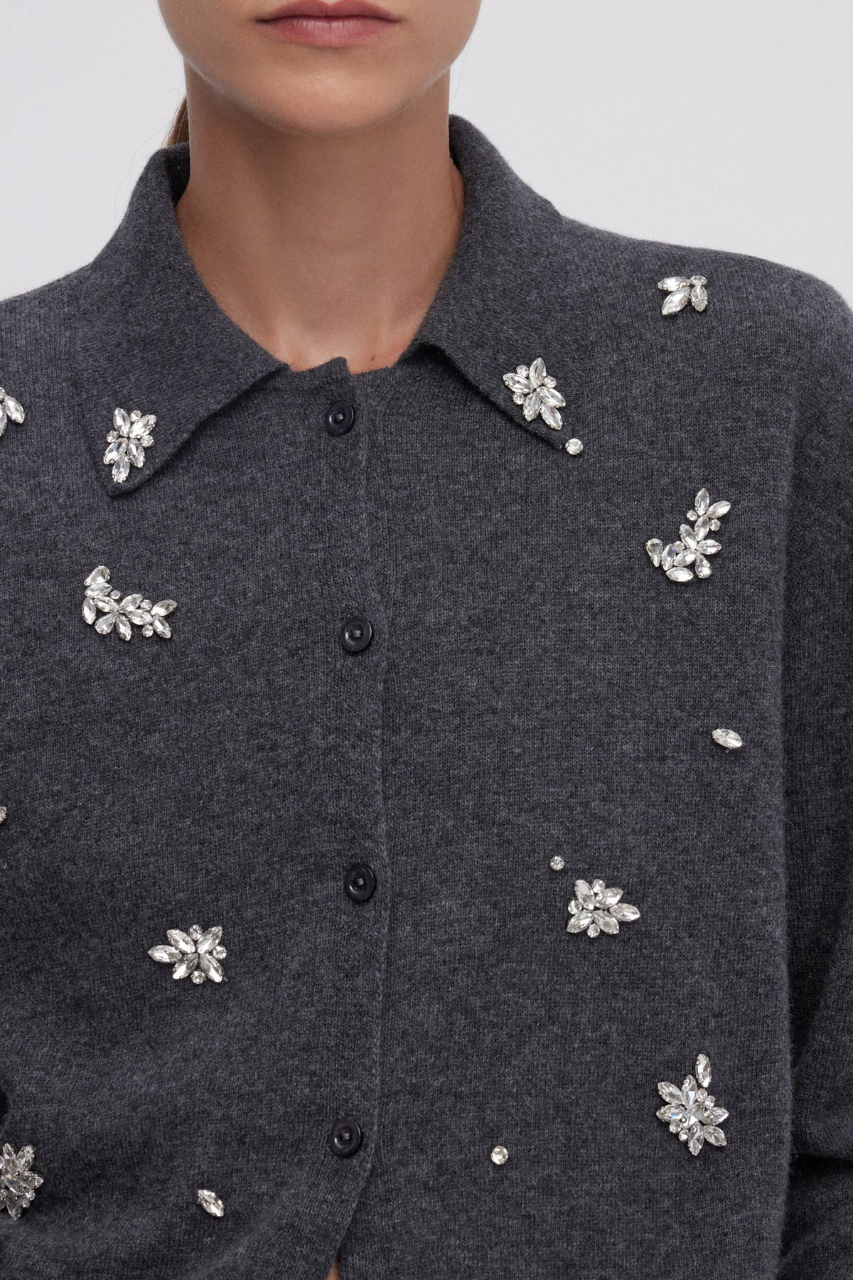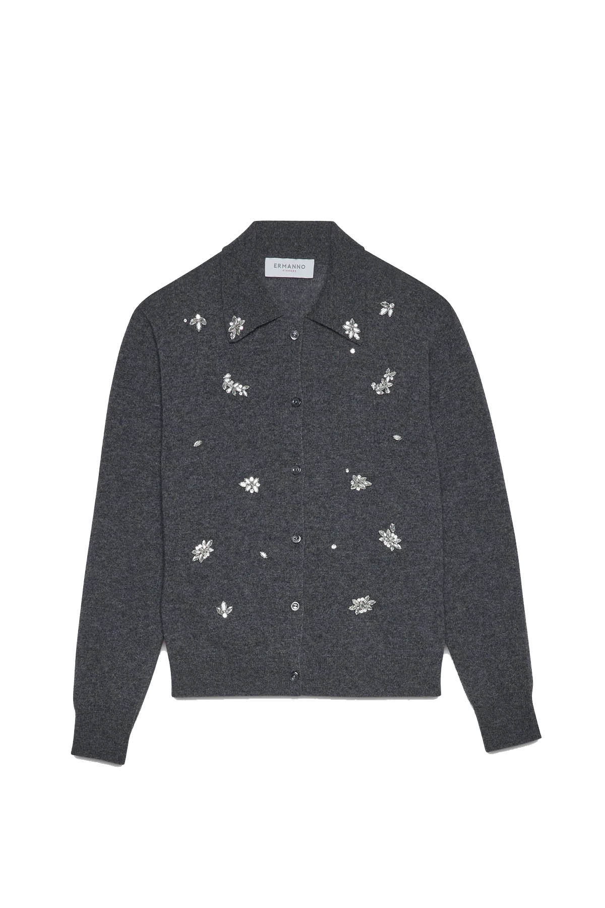 Modello con colletto, manica lunga, abbottonatura frontale, pietre applicate.
